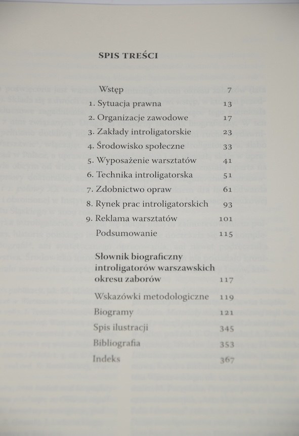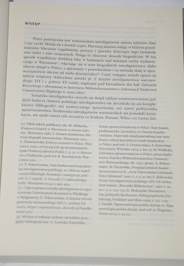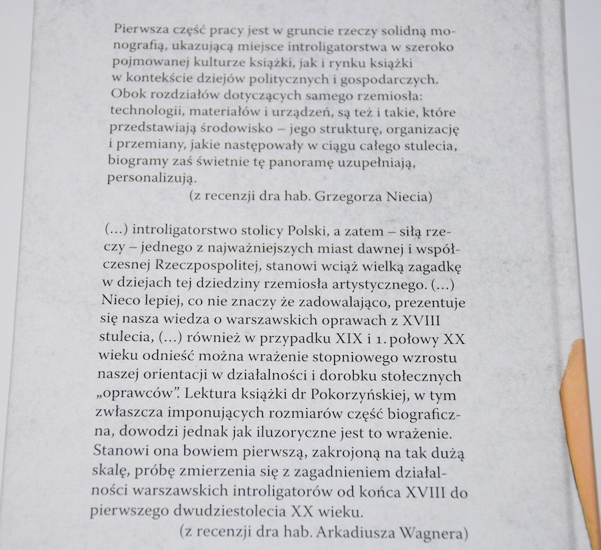 Praca poświęcona jest warszawskim introligatorom okresu zaborów (lata 1795-1918). Składa się z dwóch części. Pierwszą stanowi wstęp, w którym przedstawiono kluczowe zagadnienia, procesy i zjawiska dotyczące tego rzemiosła oraz ludzi z nim związanych. Druga to obszerny słownik biograficzny. W ten sposób wypełniono dotkliwą lukę w badaniach nad dziejami ruchu wydawniczego w Warszawie, włączając się w nurt biografistyki introligatorstwa, słabo obecny dotąd w Polsce, a uprawiany z powodzeniem i na niemałą skalę w oprawoznawstwie obcym od wielu dziesięcioleci.