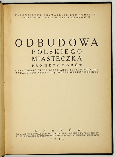 POKUTYŃSKI Józef - Odbudowa polskiego miasteczka. Projekty budynków użyteczności publicznej opracowane przez grono architektów polskich, wydane pod red. ... Kraków 1918. Obywatelski Kom. Odbudowy Wsi i Miast. folio, s. 96. opr. pł. z epoki.