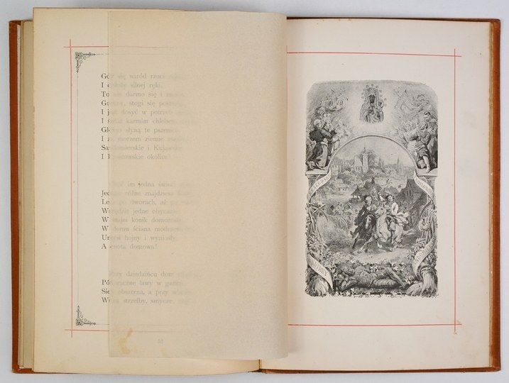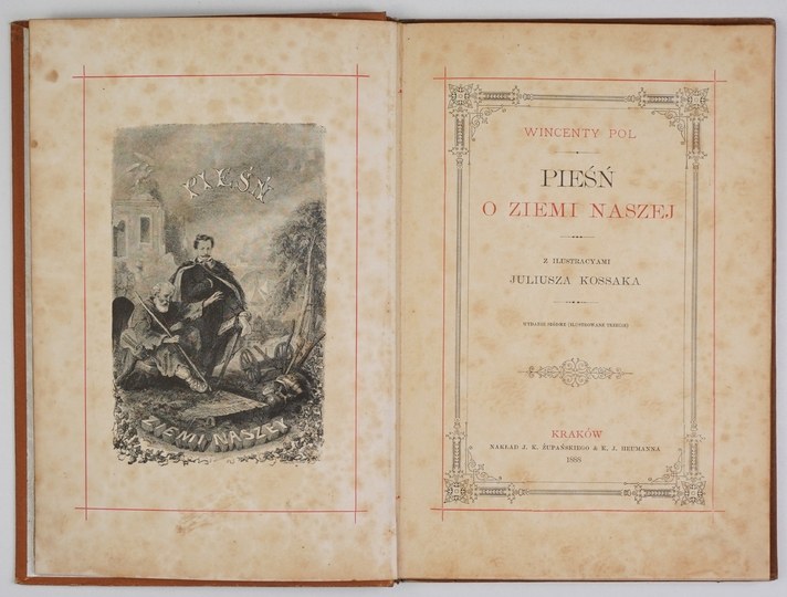 POL Wincenty - Pieśń o ziemi naszej. Z ilustracyami Juliusza Kossaka. Wyd. VII (ilustrowane III). Kraków 1888. J. K. Żupański & K. J. Heumann. 8, s. [2], 64, tabl. 8. opr. oryg. pł. zdob., obcięcie złoc.