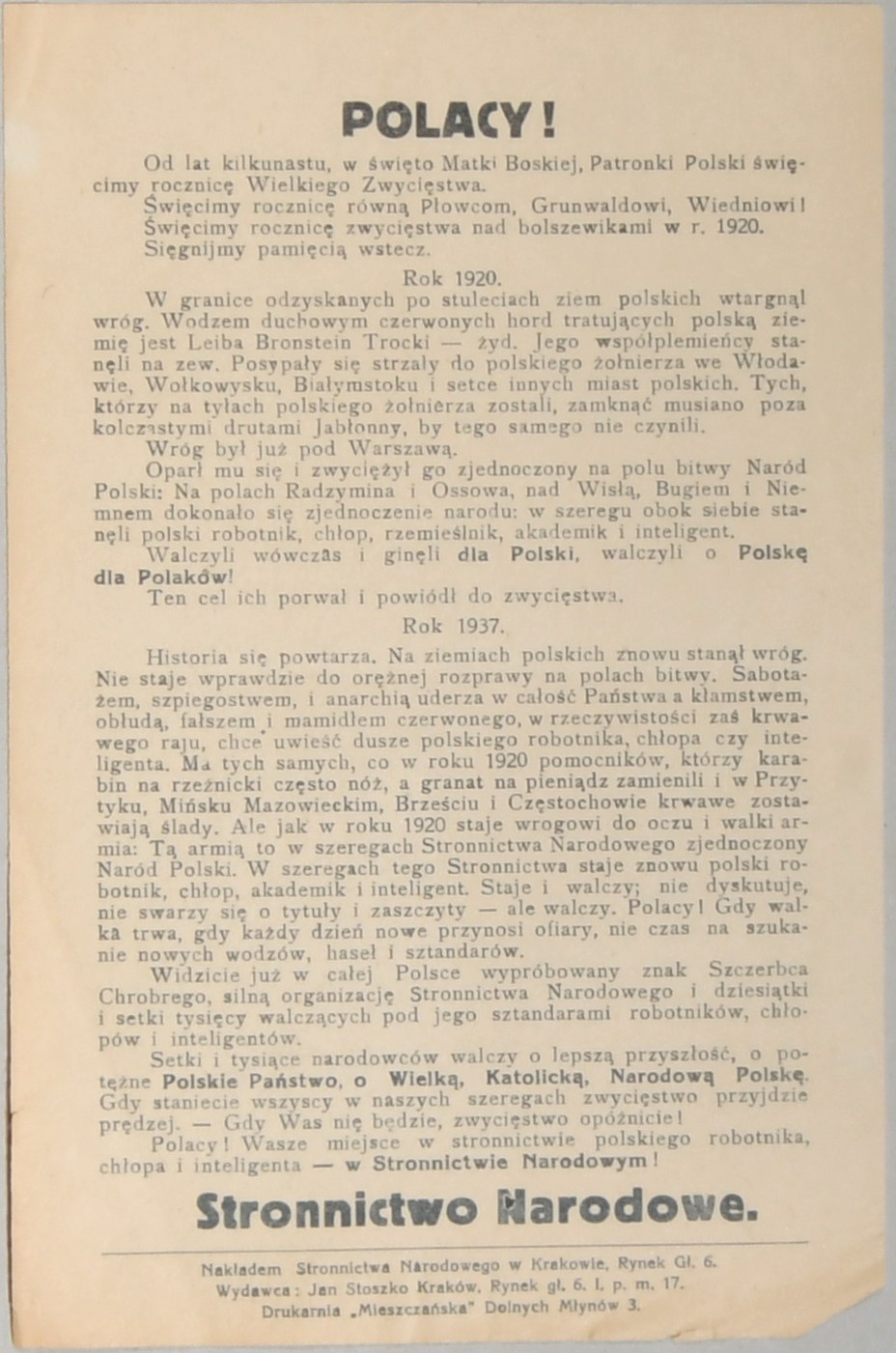 Nakł. Stronnictwa narodowego w Krakowie, wyd. Jan Stoszko, kraków, Drukarnia "Mieszczańska" w Krakowie. B. r. [1937]. Uszkodzenia prawego dolnego rogu, poza tym stan bardzo dobry.