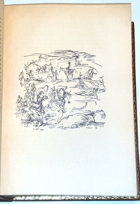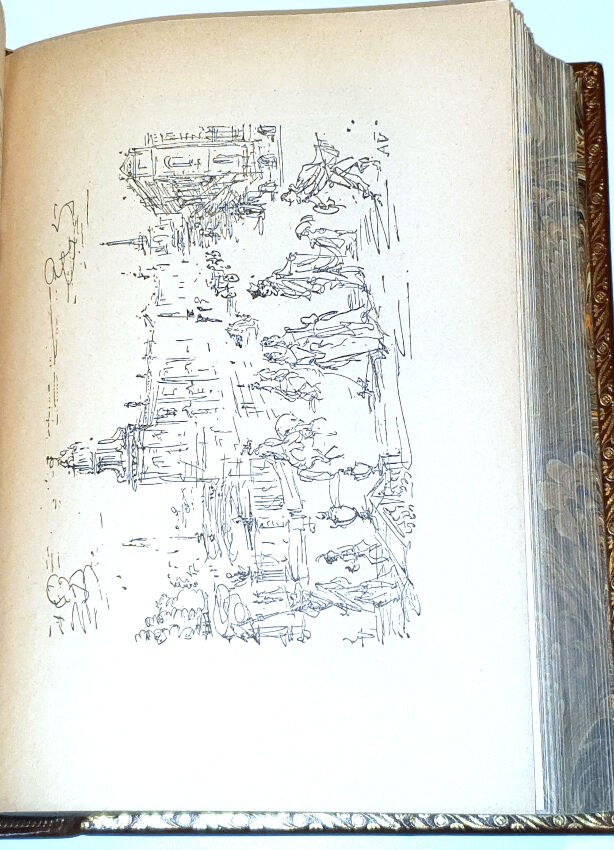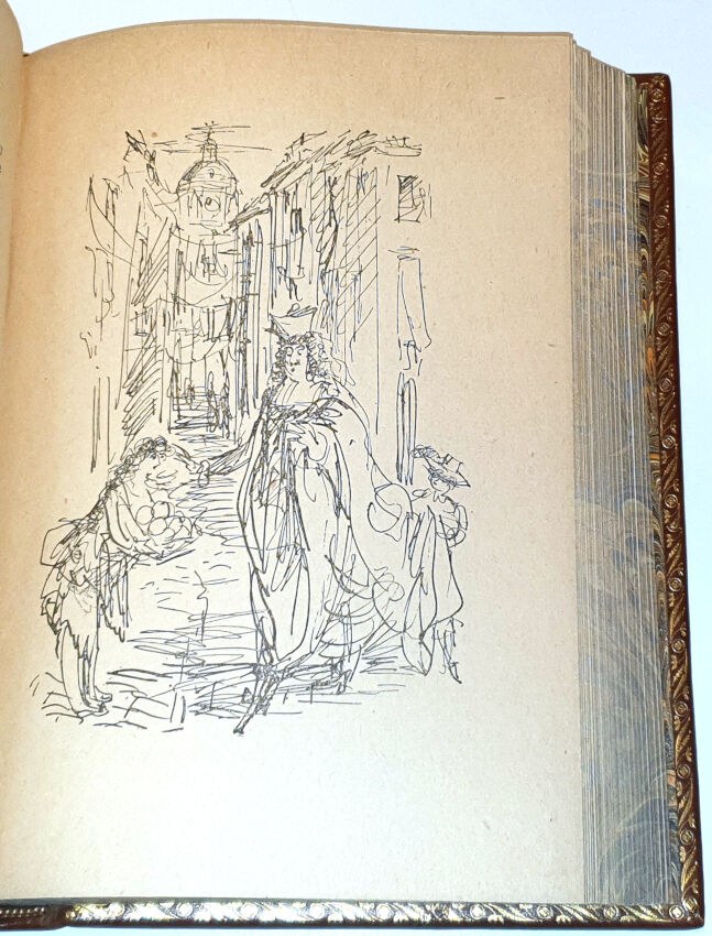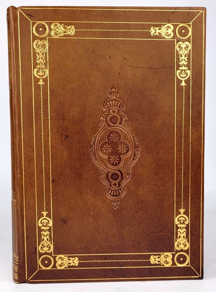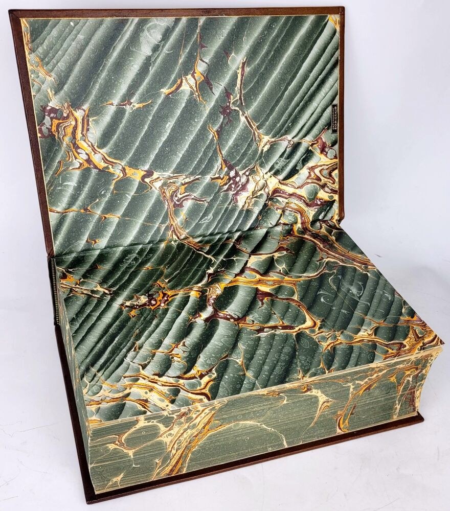 TWARDA OPRAWA PEŁNA SKÓRA WSPÓŁCZESNA, OKŁADKI OKOLONE OZDOBNĄ ZŁOCONĄ BORDIURĄ. GRZBIET PŁASKI ZE ZŁOCENIAMI. WYKLEJKI Z RĘCZNIE BARWIONEGO W MASIE PAPIERU MARMORYZOWANEGO, OBCIĘCIA KART ZDOBIONE TYM SAMYM WZOREM. WNĘTRZA OKŁADEK OKOLONE MISTERNYM TŁOCZONYM ZŁOTEM SZLACZKIEM.