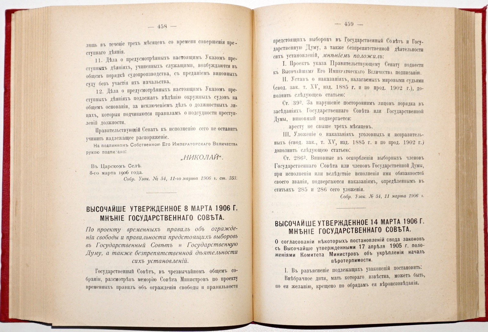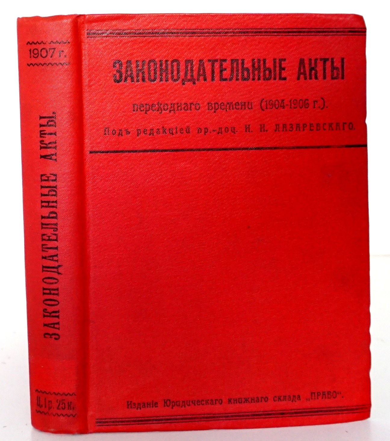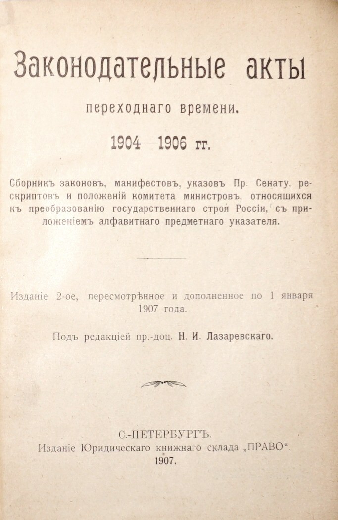 Законодательные акты переходного времени. 1904-1906 гг. Сборник законов, манифестов, указов Пр. сенату, рескриптов и положений комитета министров, относящихся к преобразованию государственного строя России, с приложением алфавитного предметного указателя. 2-е изд., пересмотр. и доп. по 1 января 1907 года.