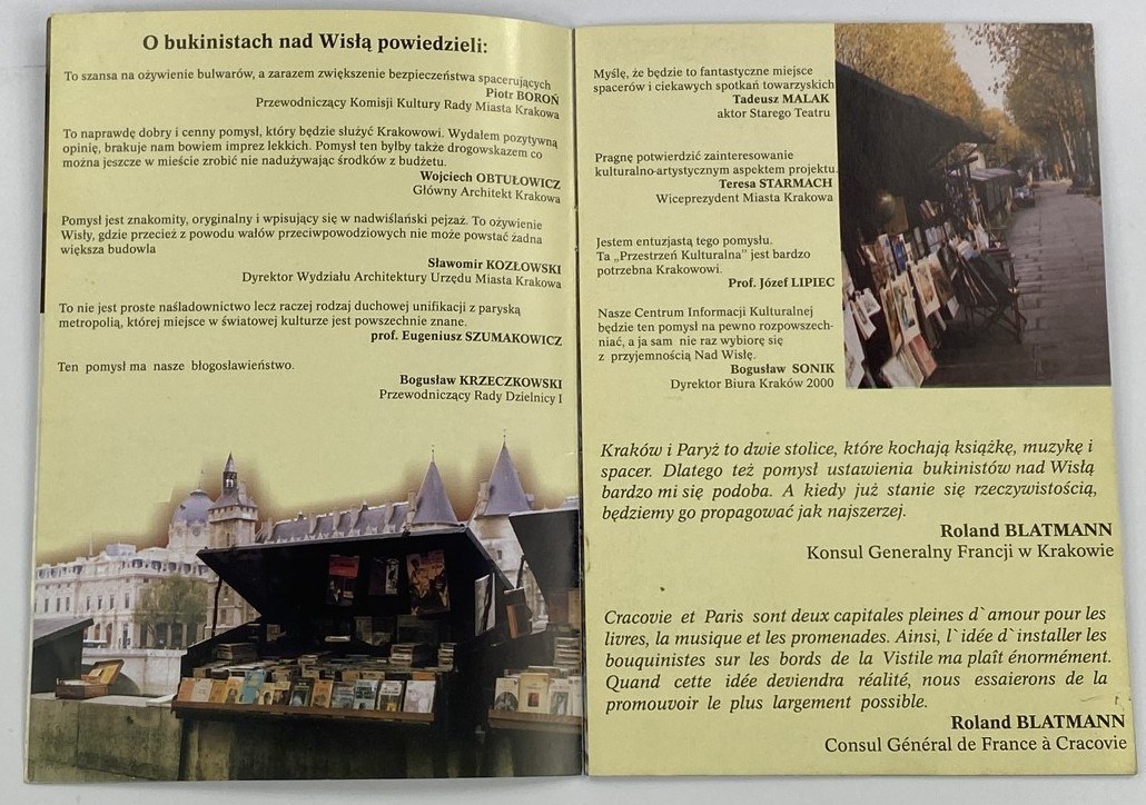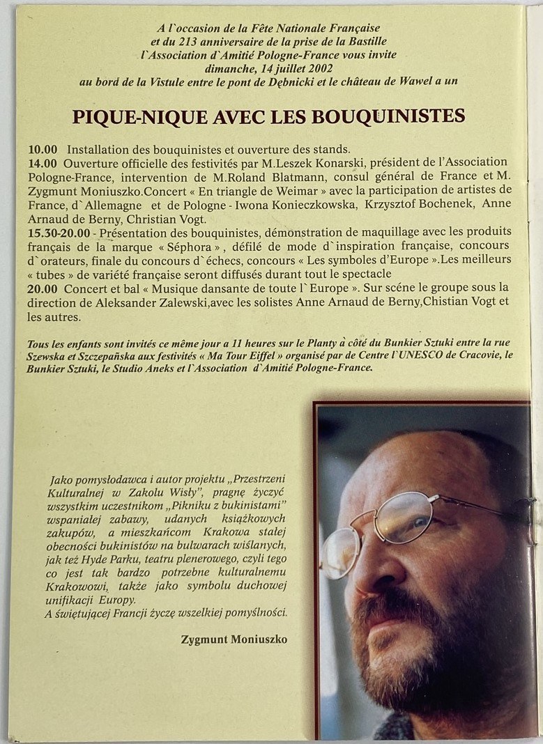 Program Pikniku z Bukinistami 14.07.2002, Towarzystwo Przyjaźni Polsko - Francuskiej w Krakowie, Kraków 2002, s. [14], wymiary 14,5 x 21 cm. Okładka broszurowa, wydawnicza. Niewielkie otarcia okładki.