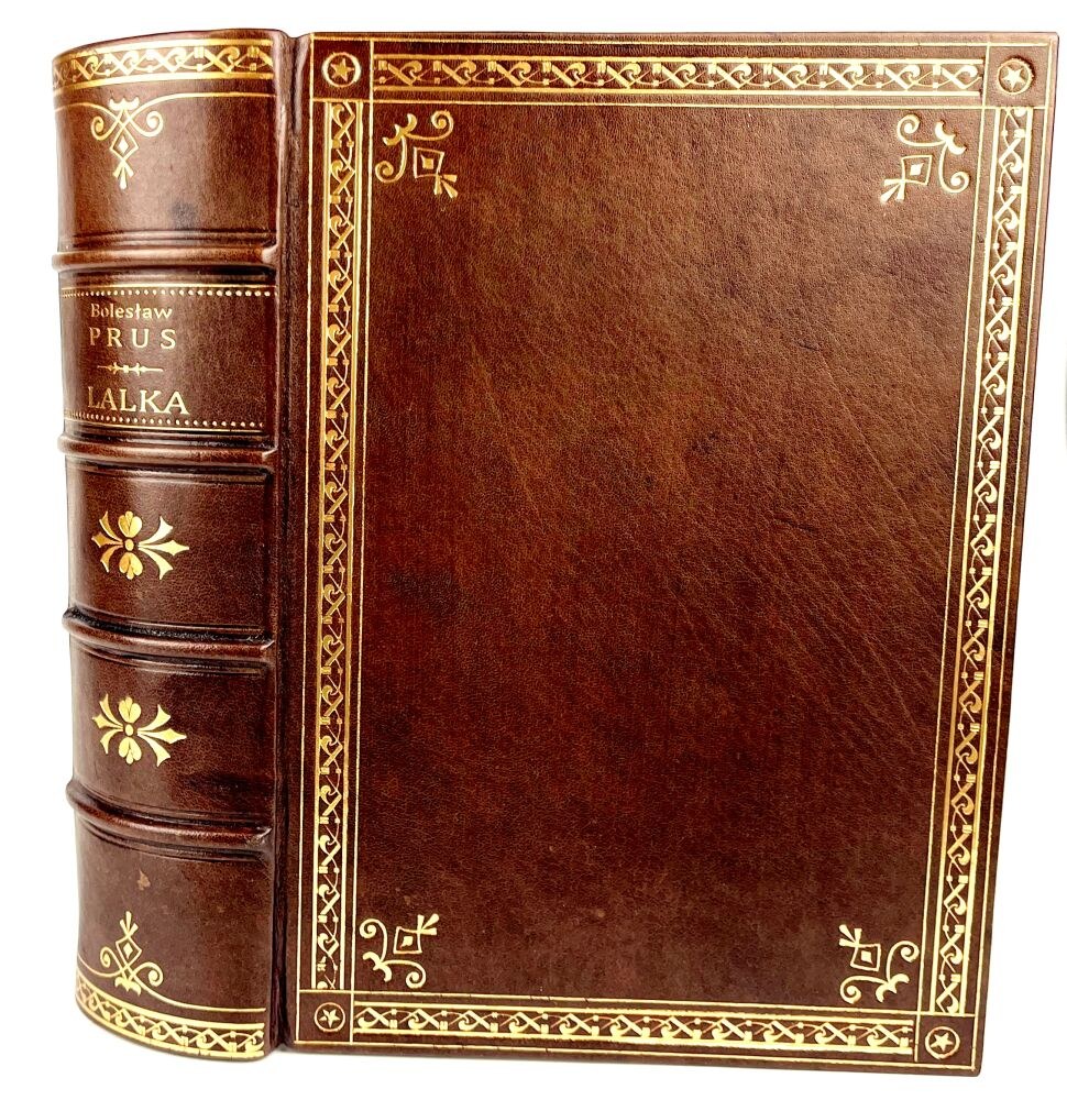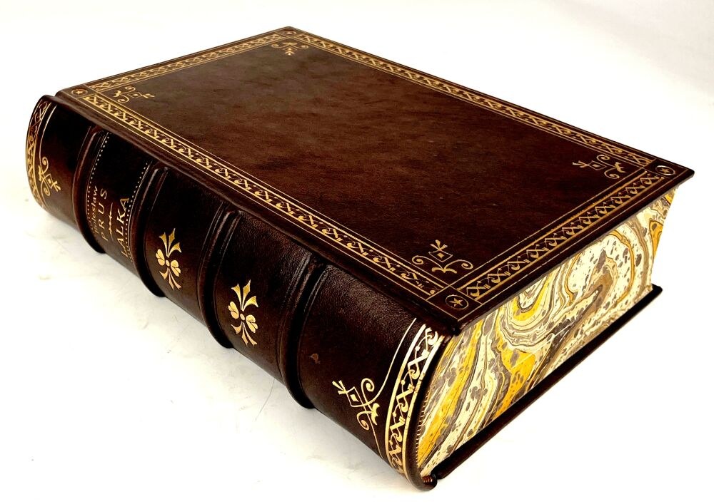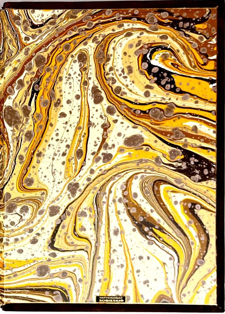 TWARDA OPRAWA PEŁNA SKÓRA WSPÓŁCZESNA, GRZBIET Z WYPUKŁYMI ZWIĘZAMI, TŁOCZENIAMI I ZŁOCENIAMI; OKŁADKI OKOLONE OZDOBNA BORDIURĄ. OZDOBNY RĘCZNIE BARWIONY W MASIE PAPIER MARMURKOWY NA WYKLEJKACH, OBCIĘCIA KART ZDOBIONE TYM SAMYM WZOREM