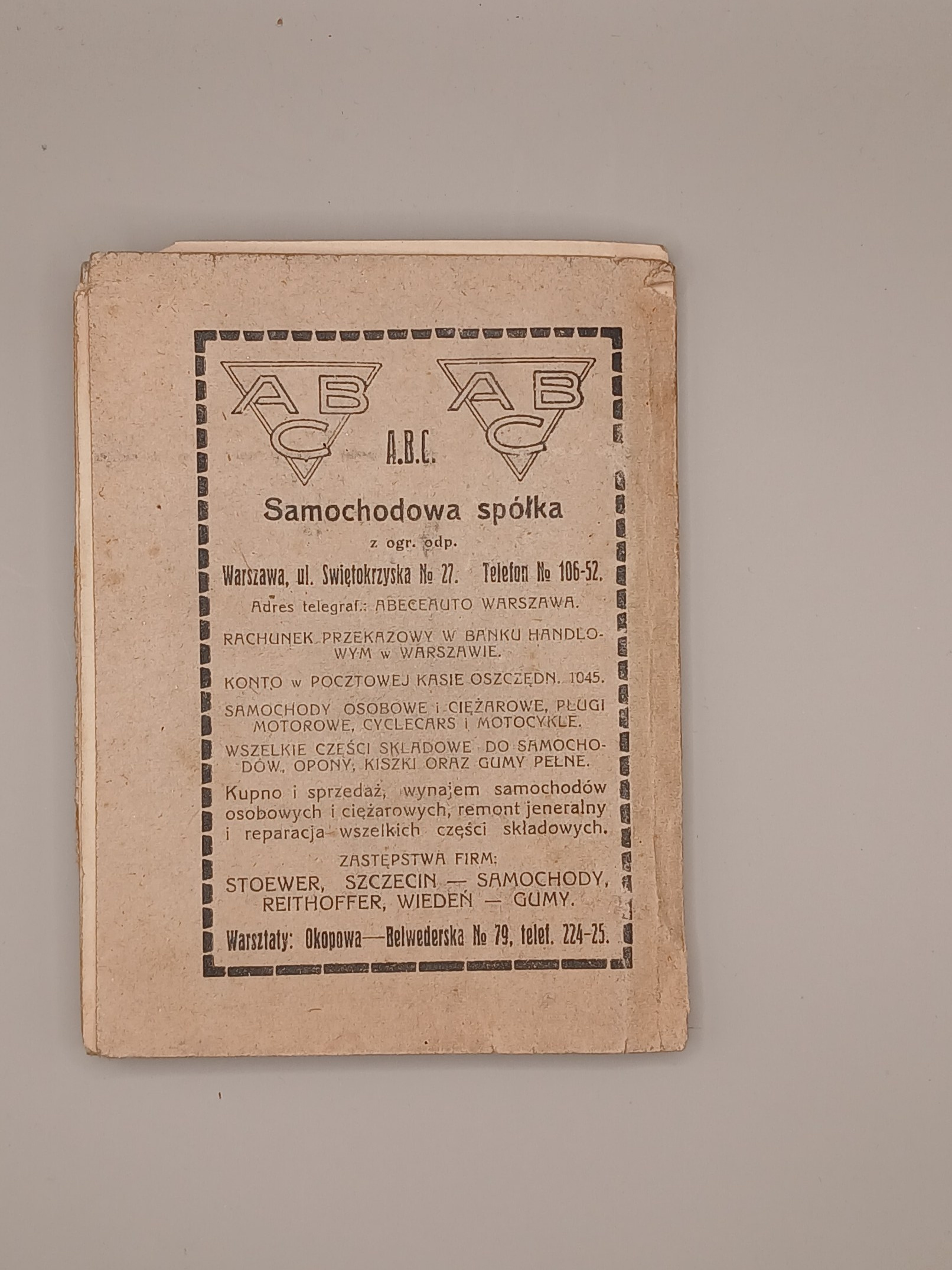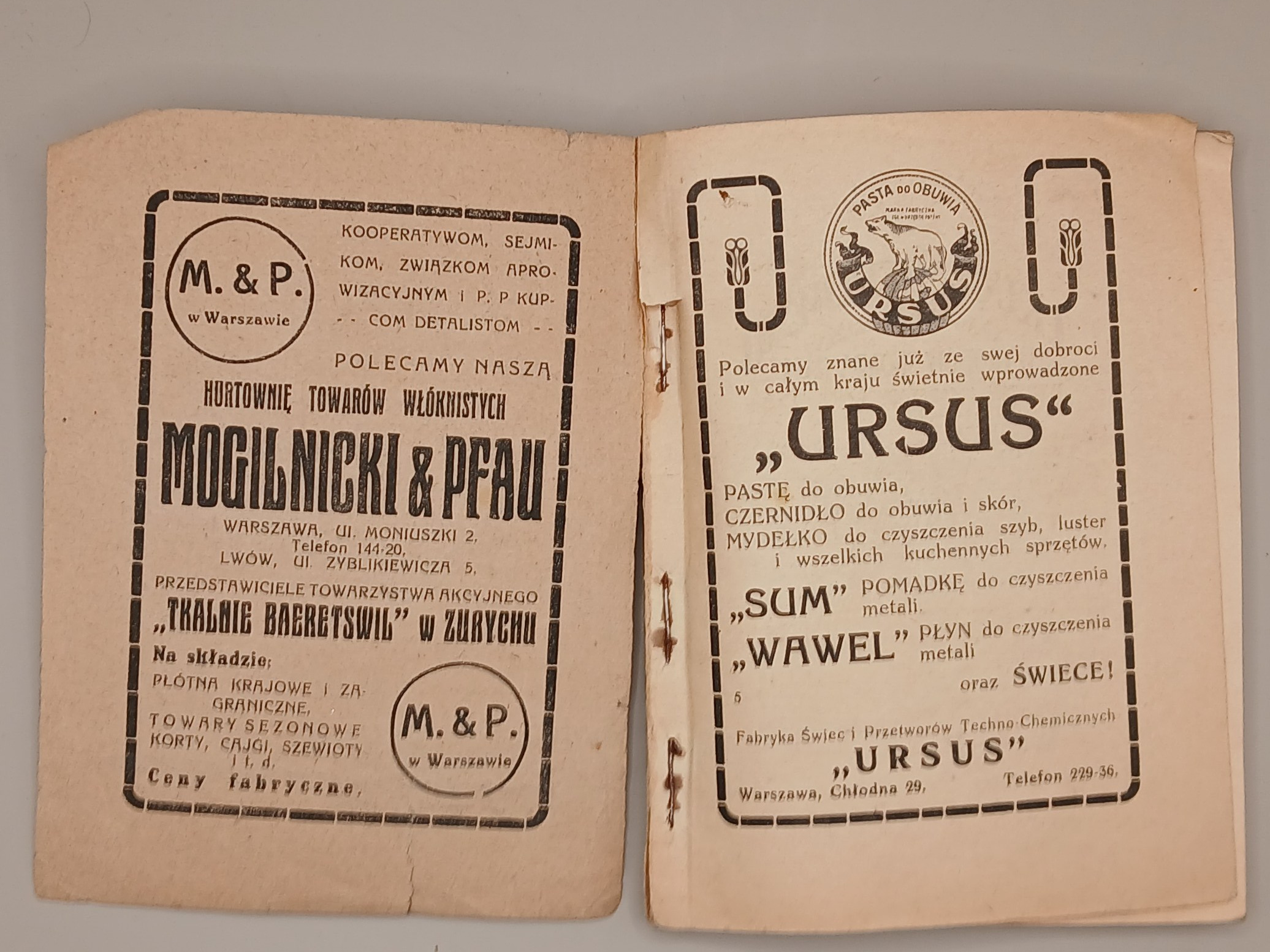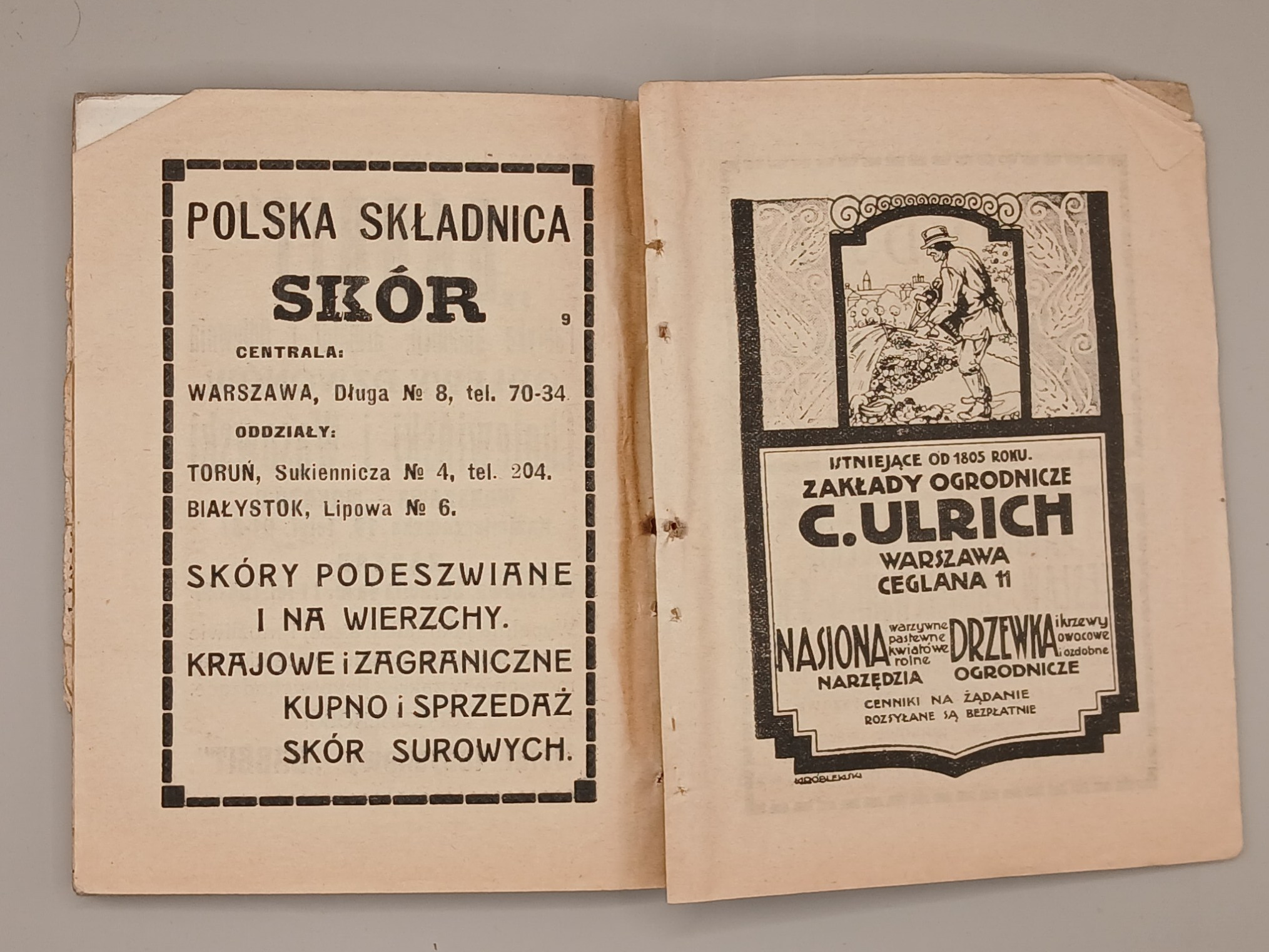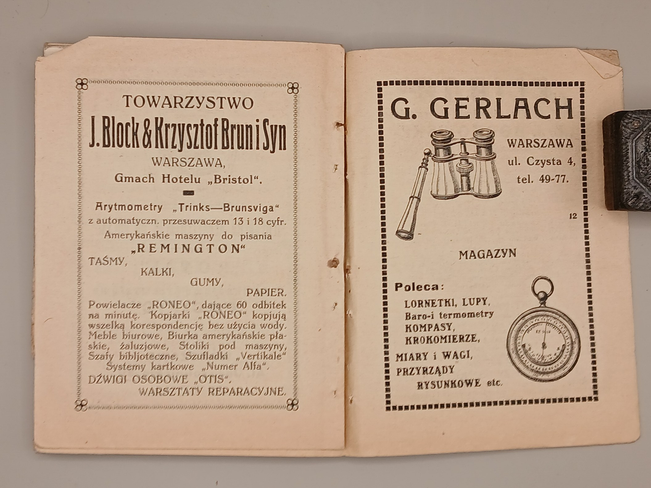 Reklamy, w tym: ZAKŁADÓW OGRODNICZYCH C. URLICH; Fabryki amunicji, armatur i odlewni dzwonów Babbit, Fabryki gilz do papierosów Znicz, spółki samochodowej A.B.C.