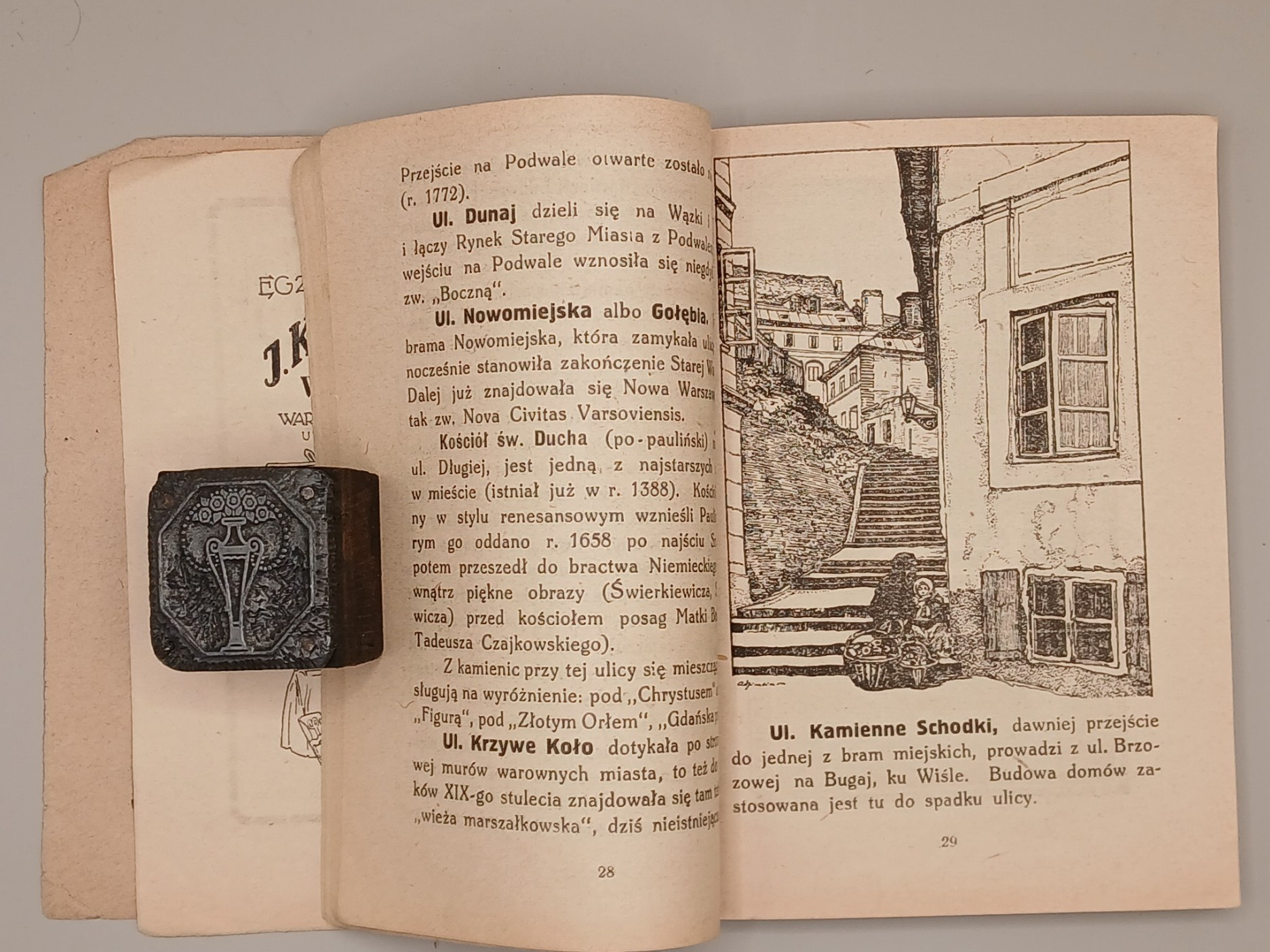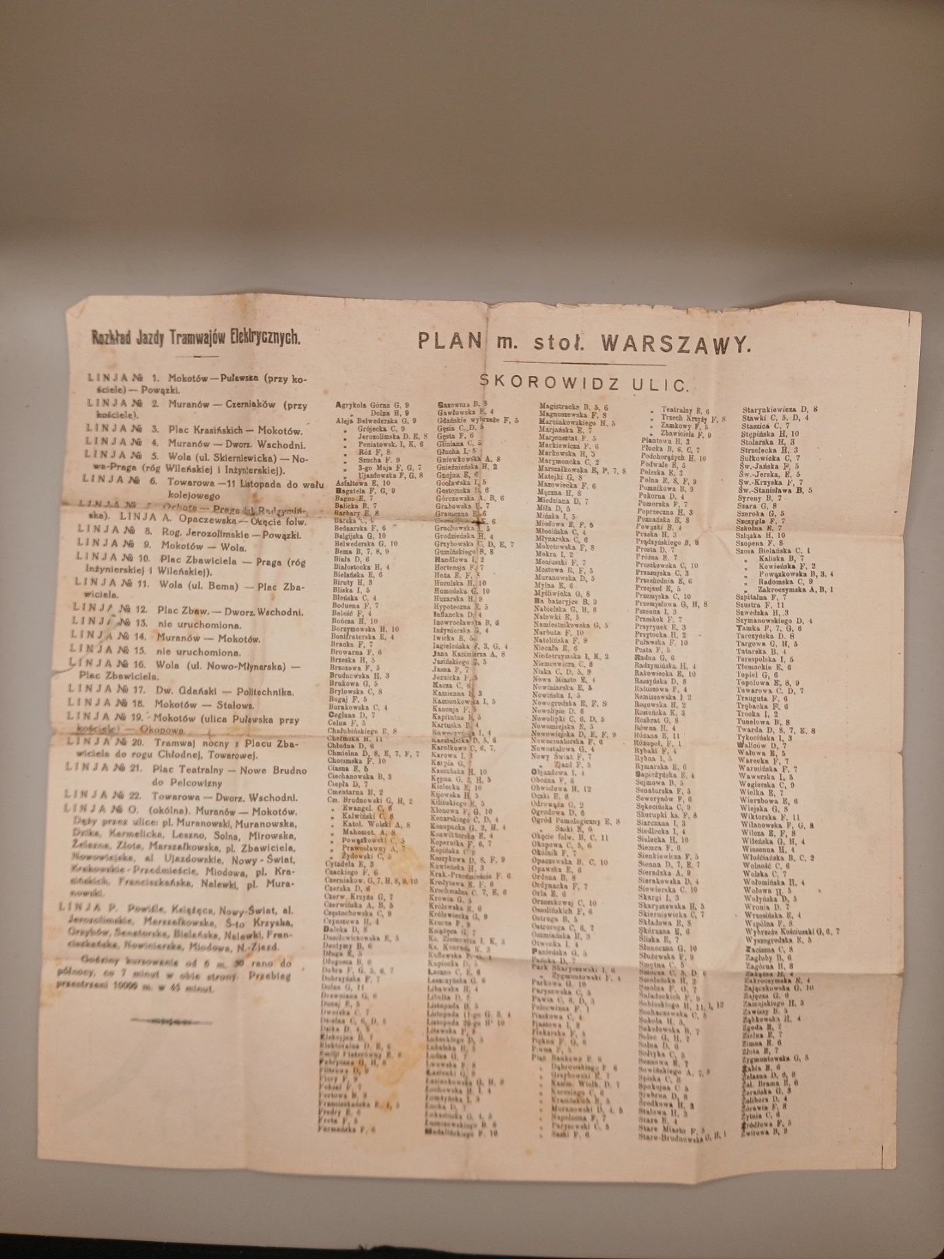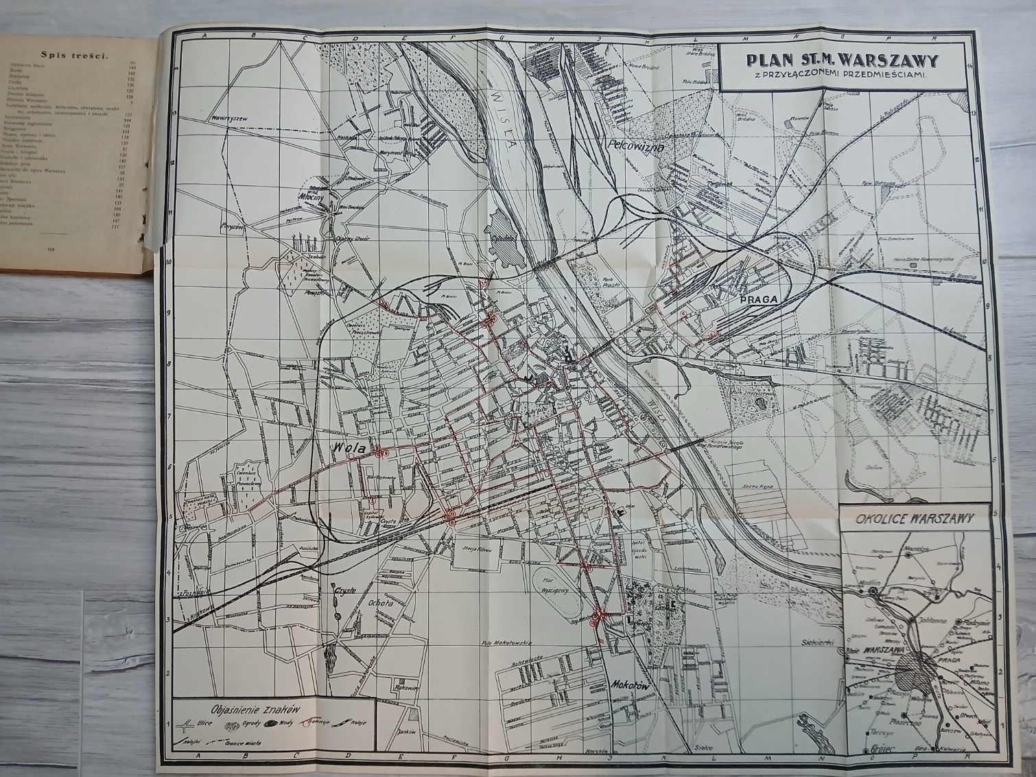 Ilustrowany przewodnik po stolicy z dwoma rozkładanymi planami miasta: jeden 44x50 cm; 33x32 cm (ten z rozkładem jazdy Tramwajów Elektrycznych i trasami wszystkich linii).