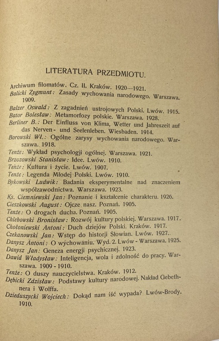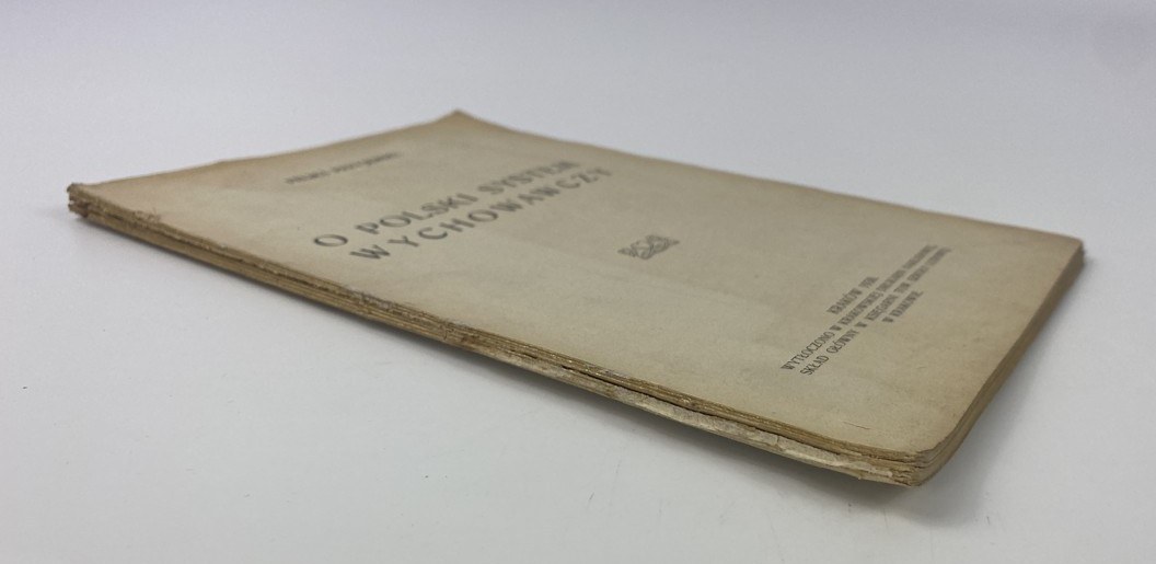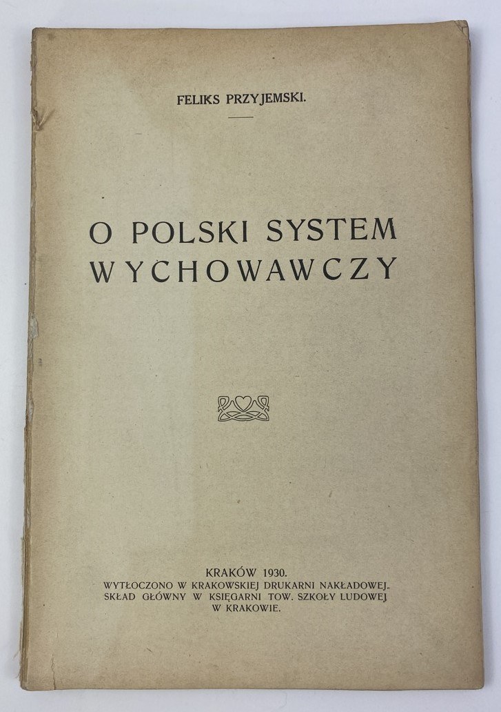 Przyjemski Feliks, O polski system wychowawczy, Skład Główny w Księgarni Tow. Szkoły Ludowej, Kraków 1930, s. 94, [1], wymiary 15,5 x 23 cm. Brak okładki.