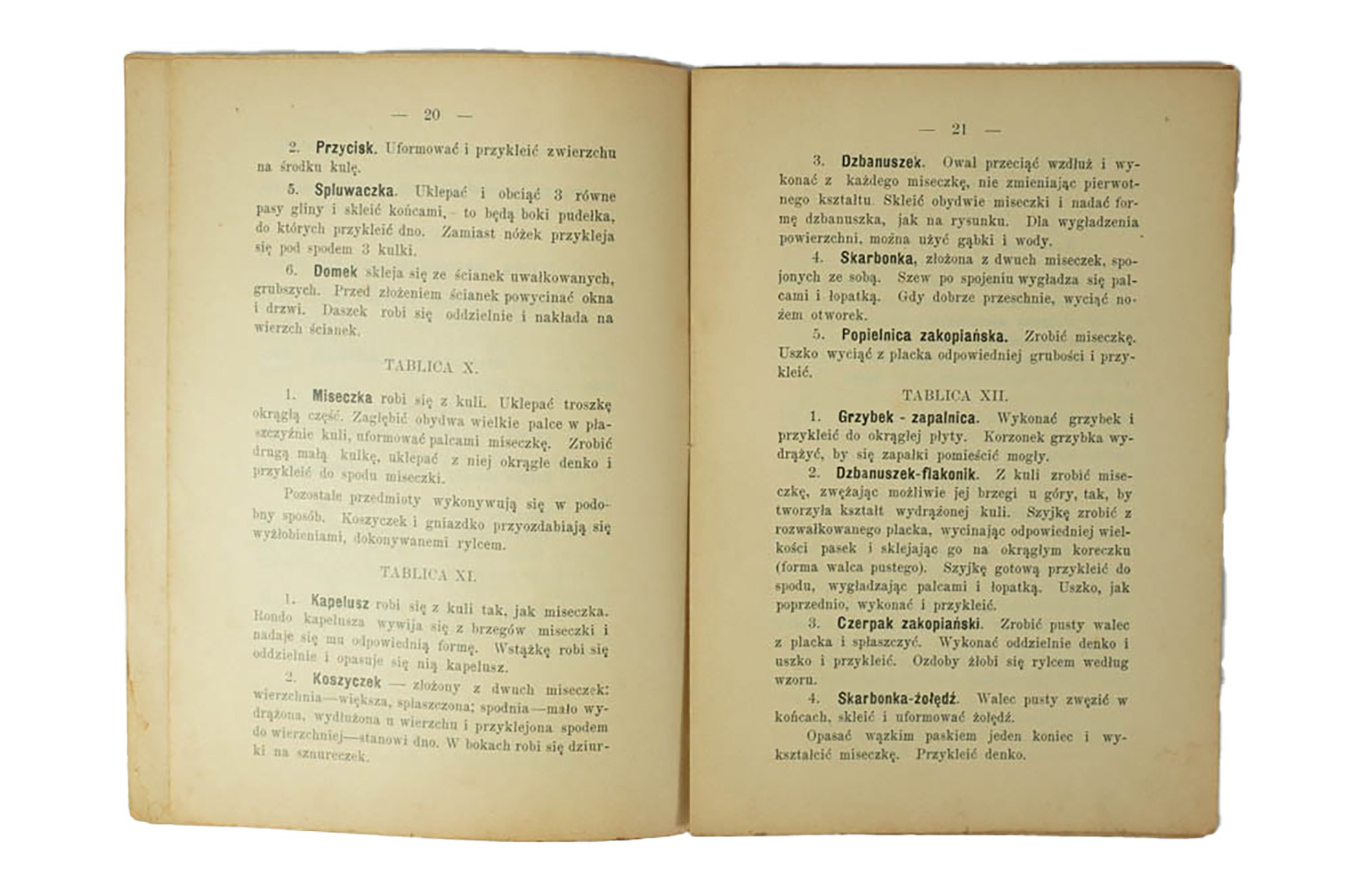 Lepienie z gliny. Podręcznik dla szkół i zakładów wychowawczych - opracowali J. Przyłuski i R. Rodkiewiczowa, Wydawnictwo imienia Staszyca, Warszawa 1906r., skald główny w "Księgarni Polskiej", f. 14,5 x20,5cm, s. 28, k.tablic XXXVI