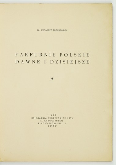 PRZYREMBEL Zygmunt - Farfurnie polskie dawne i dzisiejsze. Lwów 1936. Księg. Gubrynowicz i Syn. 4, s. 107, [1], tabl. 9. brosz.