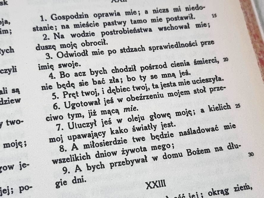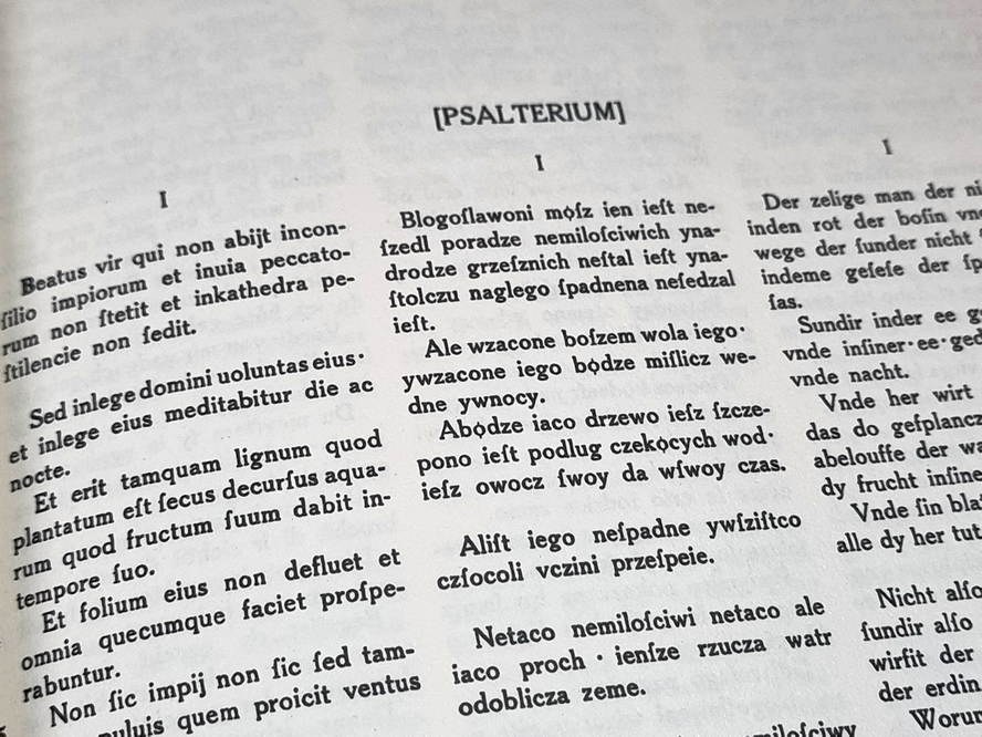 Oprawa twarda, złocenia na grzbiecie, bardzo dobry stan zachowania. 402 strony. Pełny trójjęzyczny tekst, najstarszego z zachowanych przekładów Księgi psalmów z poł. XIV w