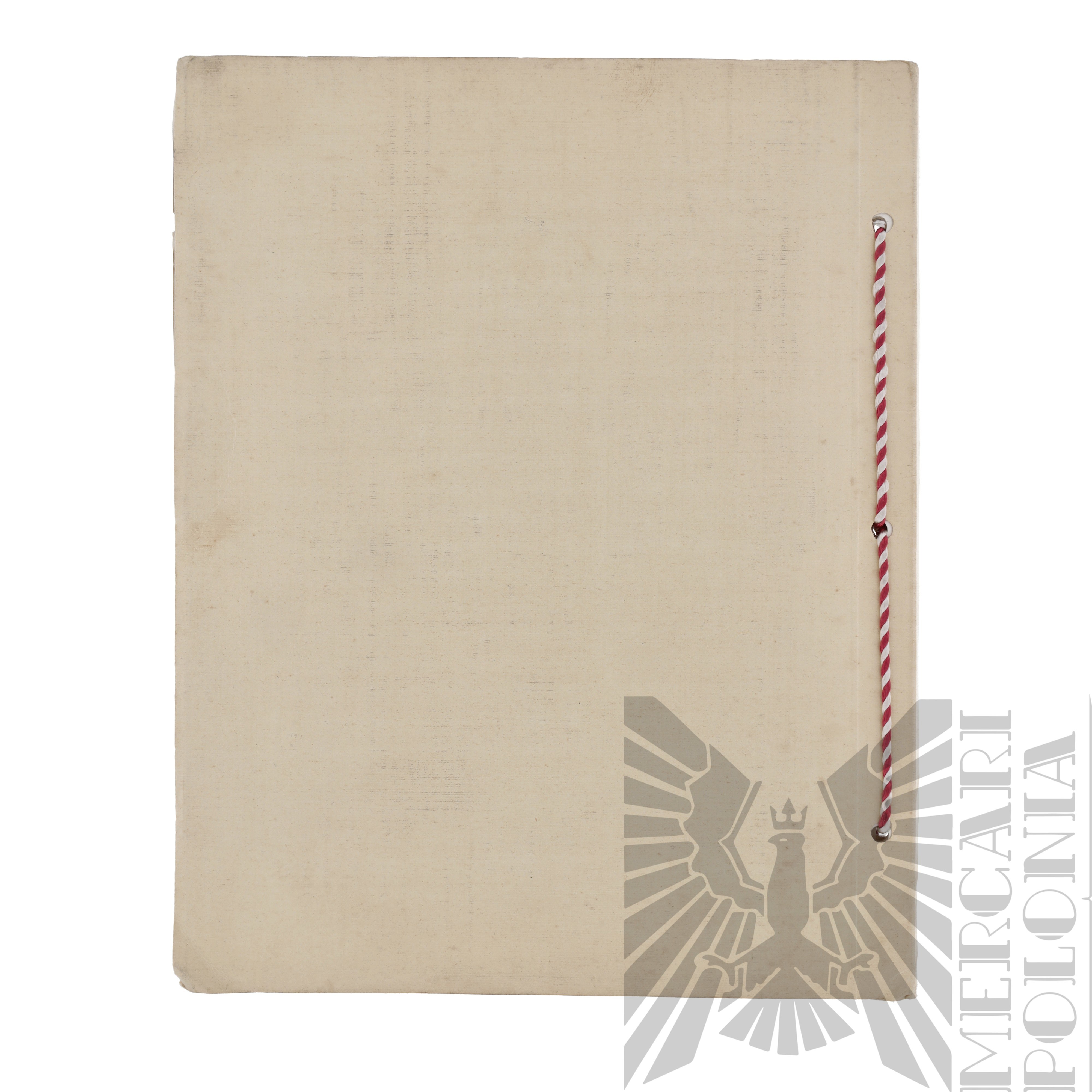 Książka w miękkiej oprawie, wiązana z lewej strony. W środkowej części bardzo dobrze widoczny odcisk profilu Generała Władysława Sikorskiego.