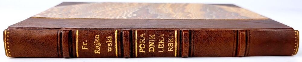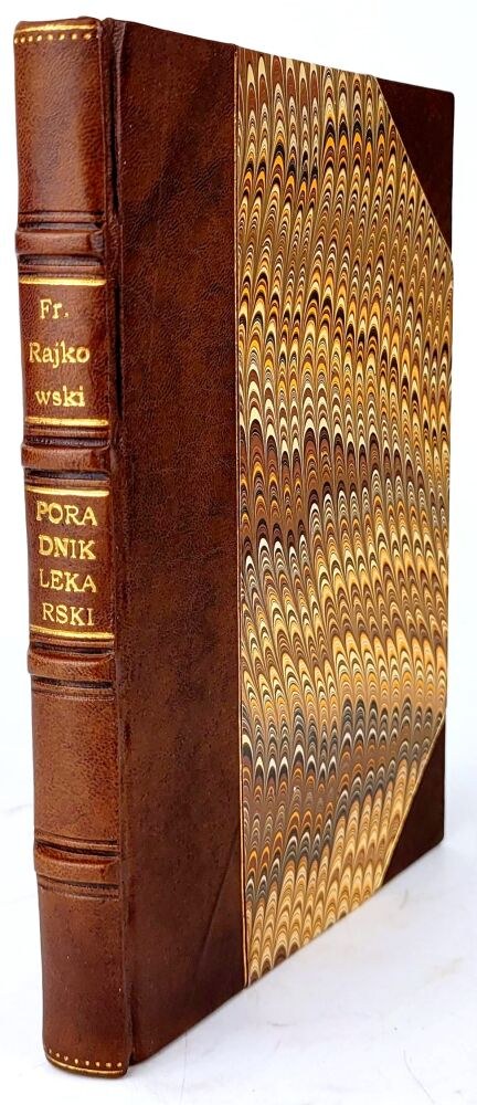 TWARDA OPRAWA PÓŁSKÓREK WSPÓŁCZESNY. GRZBIET Z WYPUKŁYMI ZWIĘZAMI I ZŁOCONĄ TYTULATURĄ, KARTON I OBCIĘCIA KART MARMORYZOWANE TYM SAMYM WZOREM