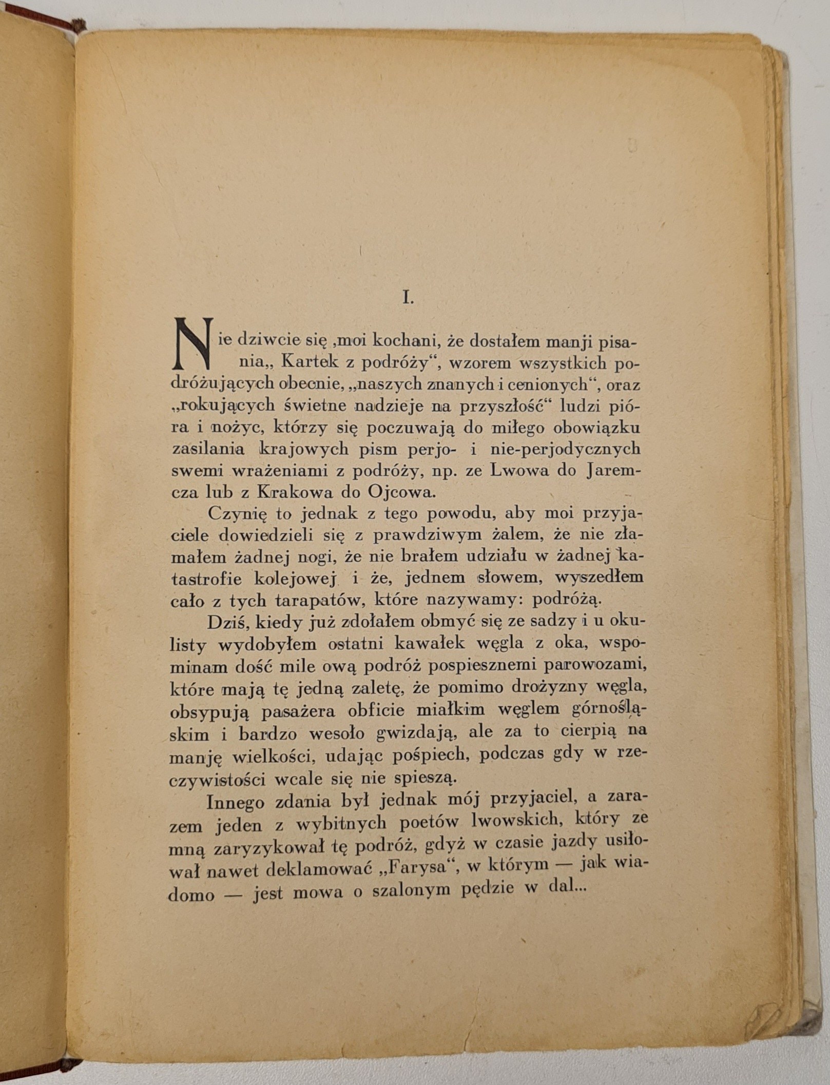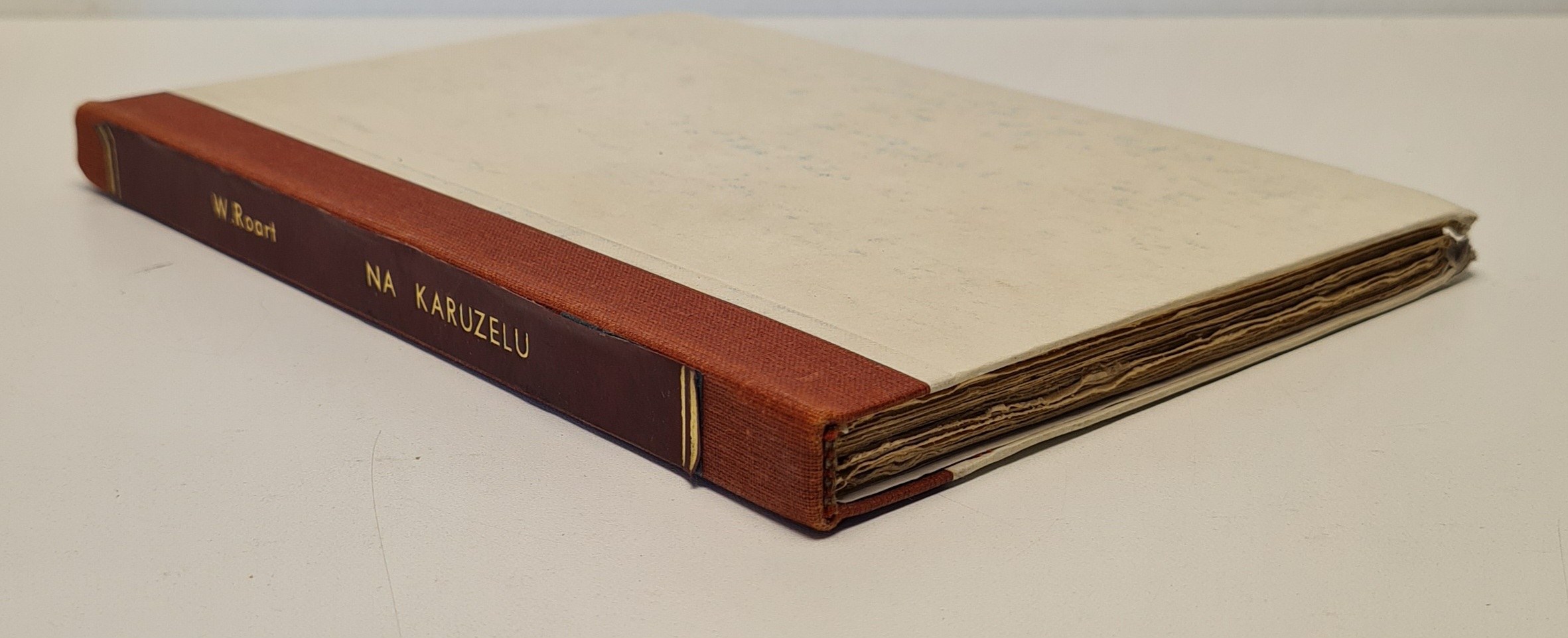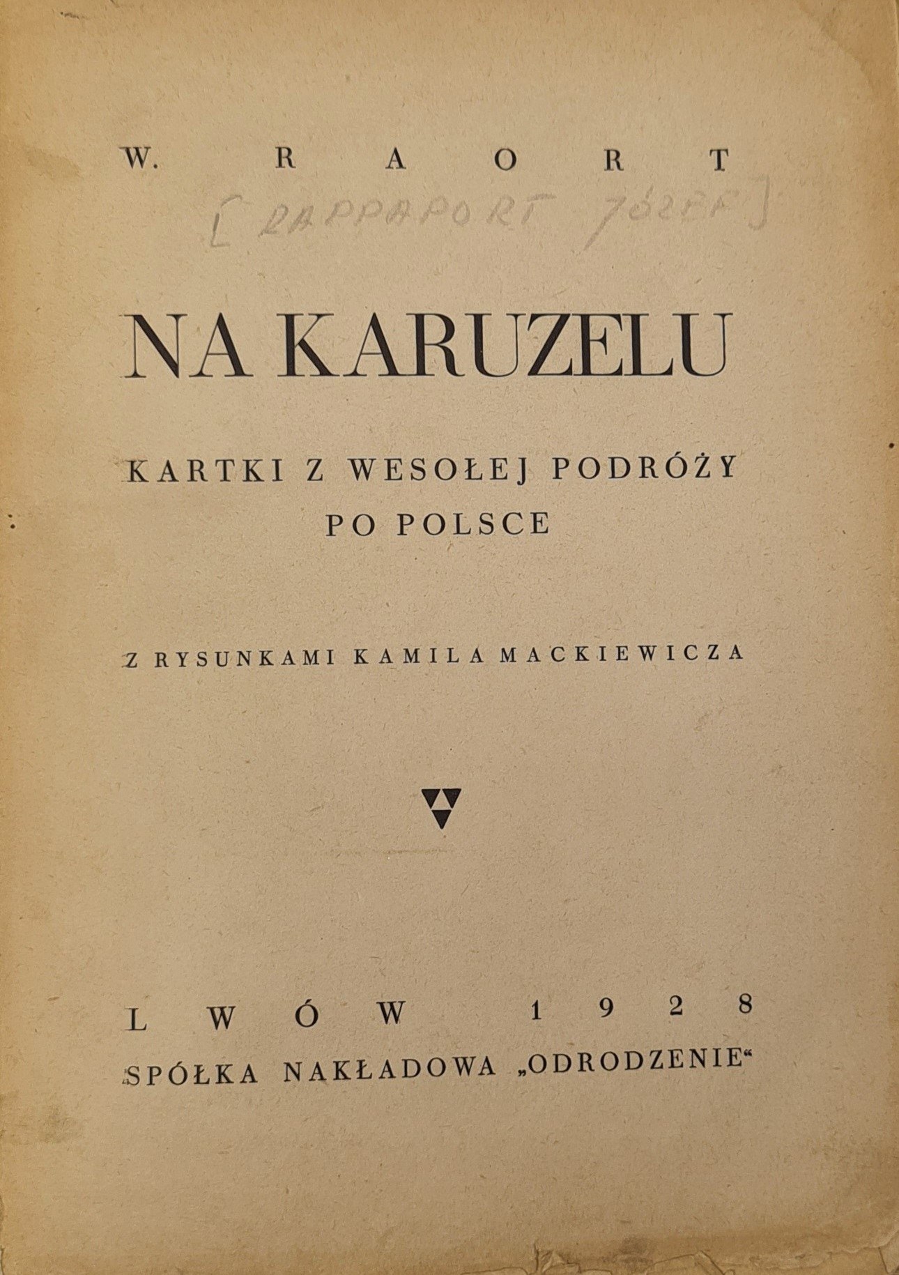 Raort W. [wlasciwie Rappaport Jozef] - Na karuzelu. Kartki z wesołej podroży po Polsce. Lwow1928: "Odrodzenie",wym. 16x22cm. s. 158. Oprawa introligatorski półpłótno z naklejonym tytułem na grzbiet. Nieznaczne ukruszenia brzegów i rogów stron. Egz. czysty. Stan dobry