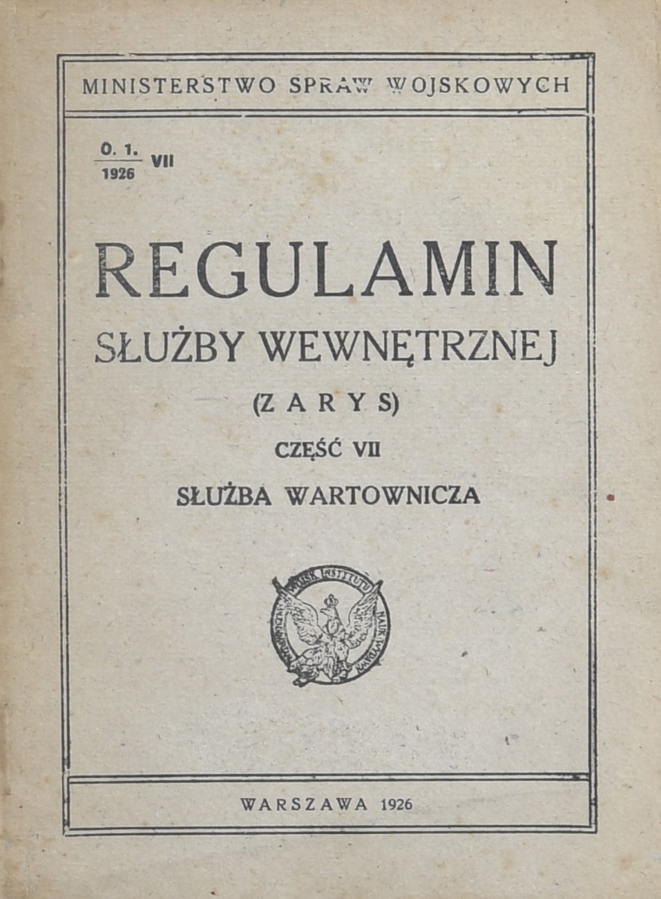Drukarnia MSW. 16d, s. 55, VIII, okł. oryg. Treść: Zasady ogólne. Przełożeni wart. Sprawdzanie służby wartowniczej. Odprawa i zmiana wart oraz wartowników. Tok służby na wartach i posterunkach. Użycie broni w służbie wartowniczej.