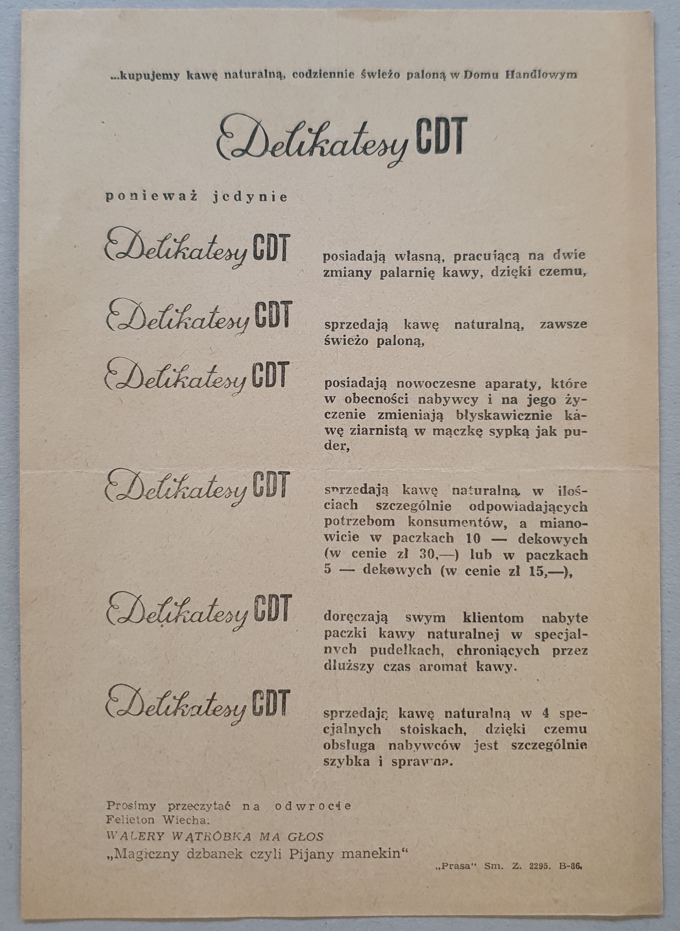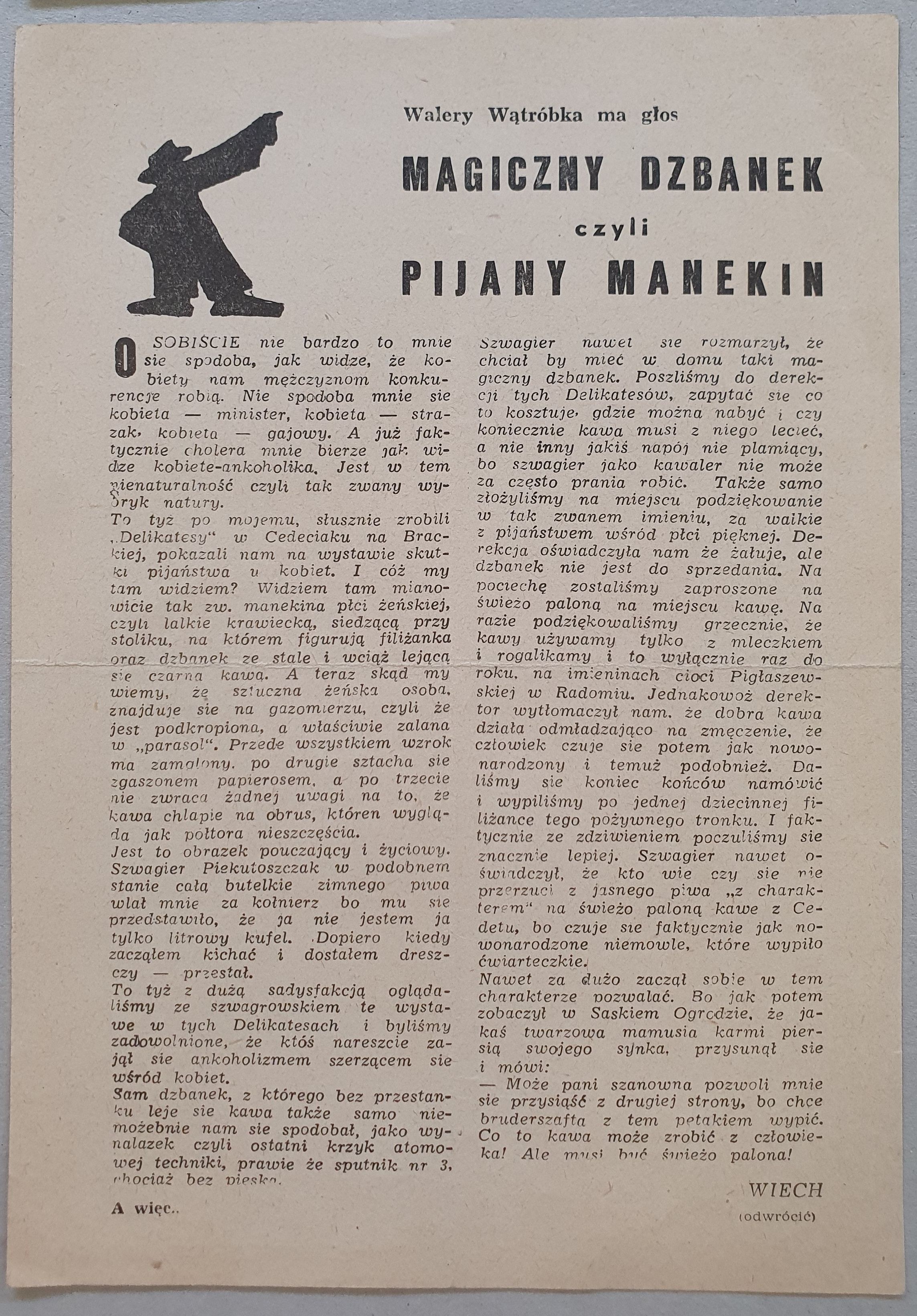 Na pierwszej stronie reklama domu handlowego Delikatesy CDT - zachęta do nabywania tamtejszych kaw naturalnych. Verso felieton Stanisława Wiecheckiego (Wiecha) z serii Walery Wątróbka ma głos p.t. Magiczny dzbanek, czyli pijany manekin.