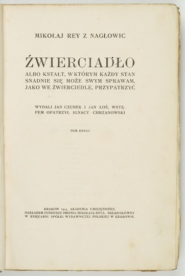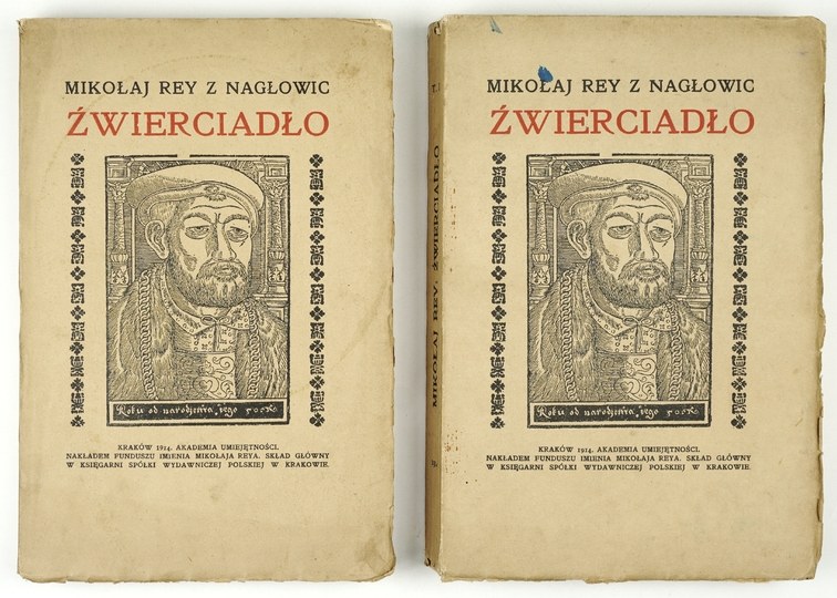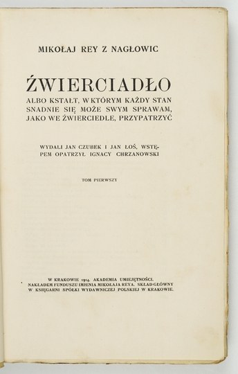 REY Mikołaj - Źwierciadło albo kstałt, w którym każdy stan snadnie się może swym sprawam, jako we źwierciedle, przypatrzyć. Wyd. J. Czubek, J. Łoś, wstępem opatrzył I. Chrzanowski. T. 1-2. Kraków 1914. AU. 8, s. 16, LV, [1], 322; [4], 531, [1]. brosz.