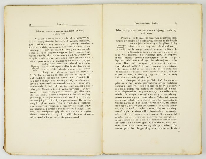 Okł. nieco otarte, lekko zaplamione, atramentowe zaplamienie okł. t. 2, załamania narożnika końcowej karty t. 2. Edycja oparta na pierwszym wydaniu z 1568. Na okładkach reprodukcja drzeworytowego portretu autora. Na całość dzieła składa się kilka utworów: Żywot człowieka poczciwego, Spólne narzekanie wszej Korony na porządną niedbałość naszę (Przemowa krótka do krześcijańskiego człowieka każdego), Apoftegmana, to jest Krótkie a roztropne powieści, Przemowa krótka do poćciwego Polaka stanu rycerskiego, Zbroja pewna każdego rycerza krześcijańskiego, Do uczciwego a bacznego Polaka … krótkie a przyjacielskie napomnienie, Żegnanie ze światem.