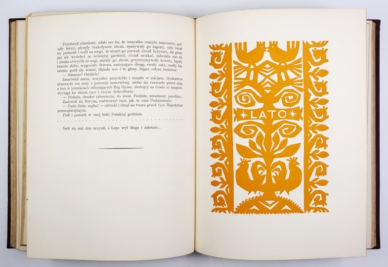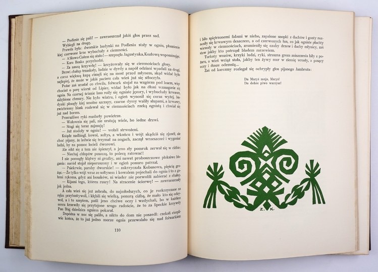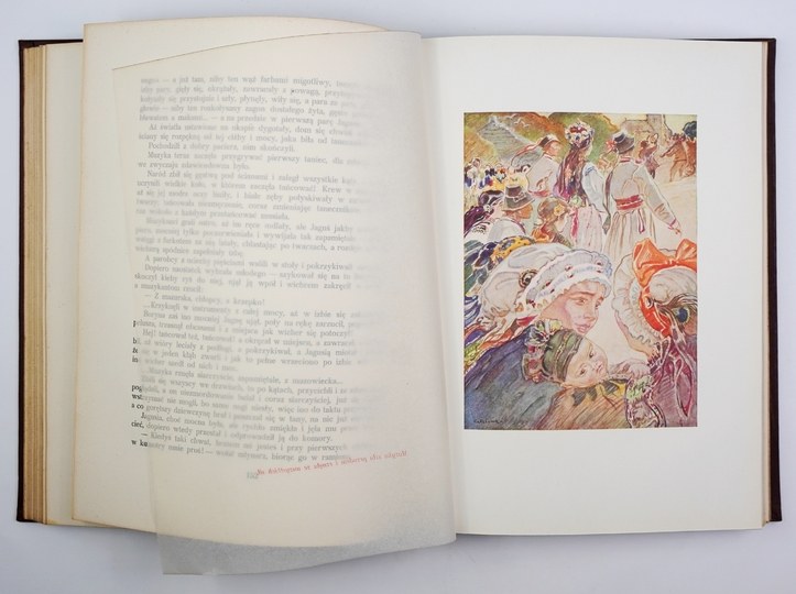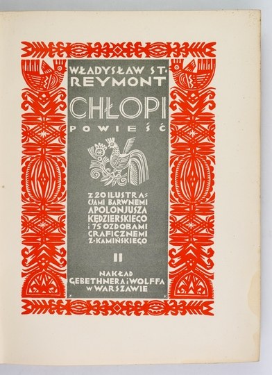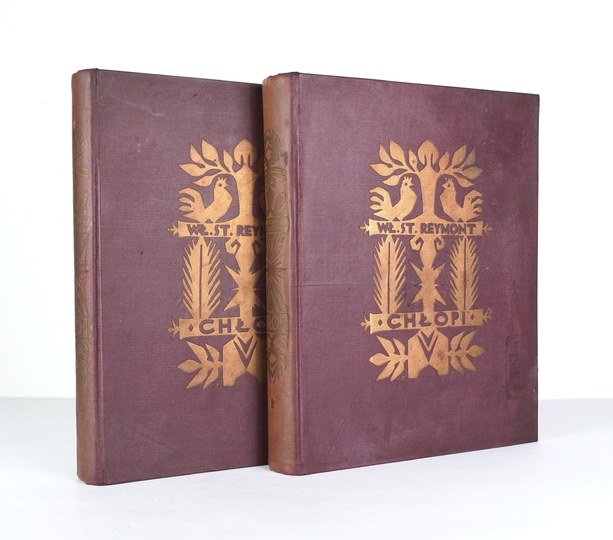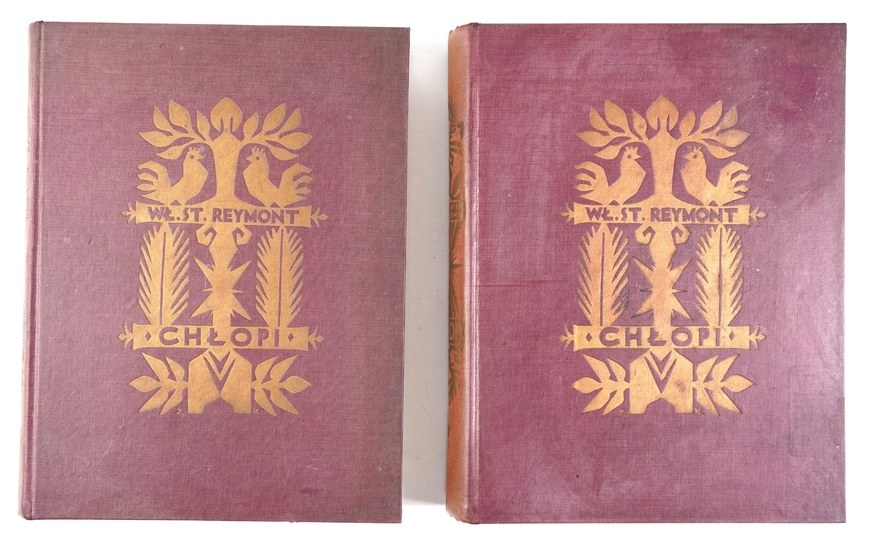 SPKL 190. Oprawy zakurzone, wewnątrz stan bardzo dobry. Zachowane wszystkie bibułki przekładkowe z nadrukami tytułów przed tablicami. Tablice kolorowe, liczne jednobarwne zdobienia w tekście. Jedna z najpiękniej wydanych polskich książek ilustrowanych, a przy tym powieść, za którą Władysław Reymont uzyskał nagrodę Nobla w 1924 roku. Oprawa graficzna książki to wspólne dzieło Apoloniusza Kędzierskiego (1861-1939) i Zygmunta Kamińskiego (1888-1969). Kędzierski - uczeń Brandta, Gersona i Aleksandra Kamińskiego, artysta o dużej wrażliwości i zamiłowaniach kolorystycznych przygotował cykl 20 akwarel (pejzaże i sceny z życia wsi) reprodukowanych na barwnych tablicach. Kamiński, uczeń m.in. Mehoffera, malarz, rysownik i grafik zaprojektował okładkę, kartę tytułową, inicjały i liczne ozdoby graficzne w tekście z motywami zaczerpniętymi ze sztuki ludowej. Prace obu artystów harmonizują ze sobą. Książka jest pięknie drukowana, dużą czcionką, na dobrym papierze.