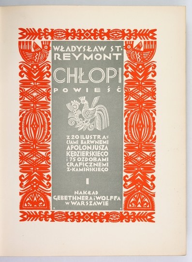 REYMONT Władysław - Chłopi. Powieść. Z 20 ilustracjami barwnemi Apolonjusza Kędzierskiego i 75 ozdobami graficznemi Z[ygmunta] Kamińskiego. T. 1-2. Warszawa [1928]. Nakł. Gebethnera i Wolffa. 4, s. [4], 384, [1], tabl. 10; [4], 450, [1], tabl. 10. opr. oryg. pł. zdob.