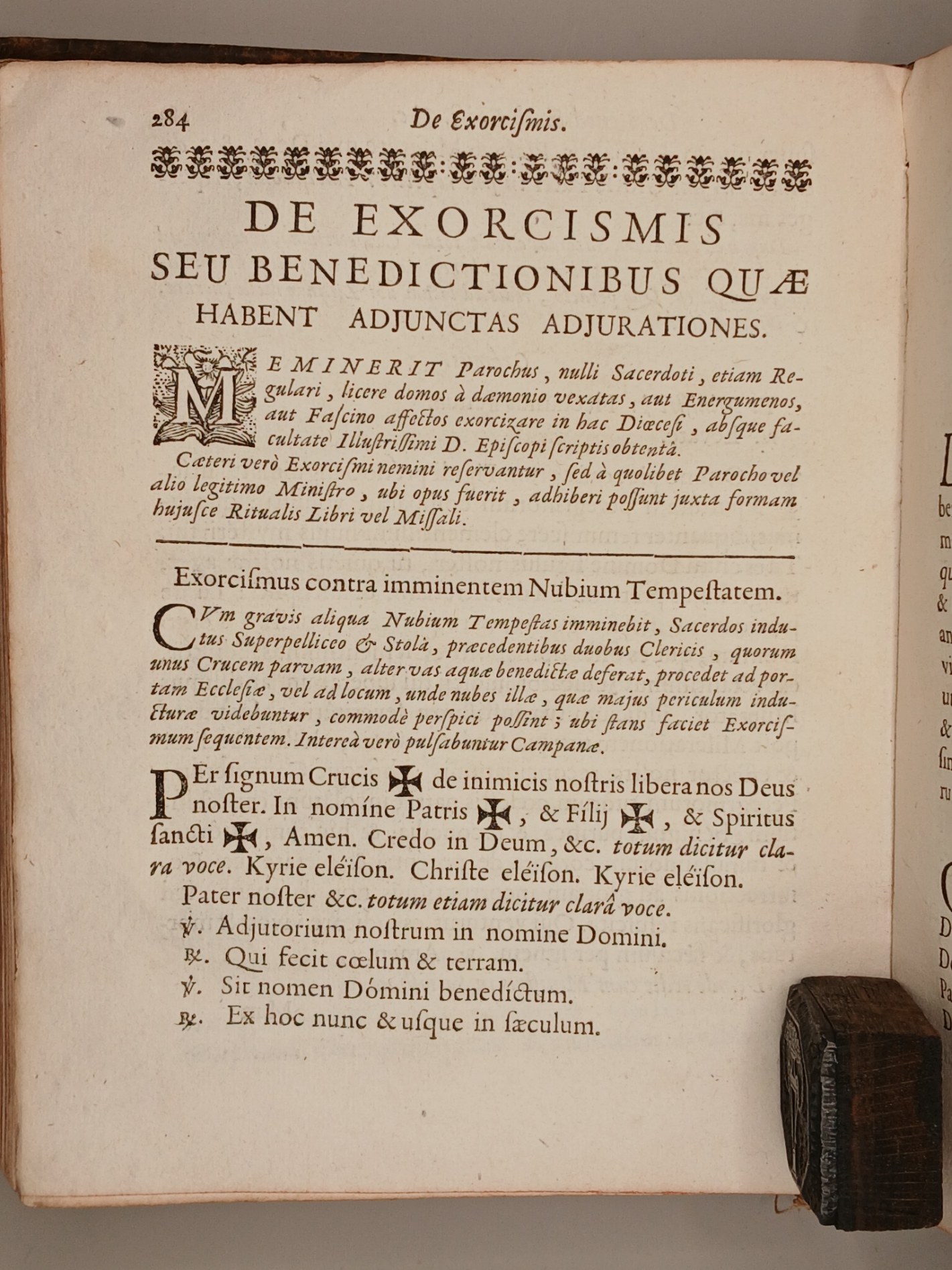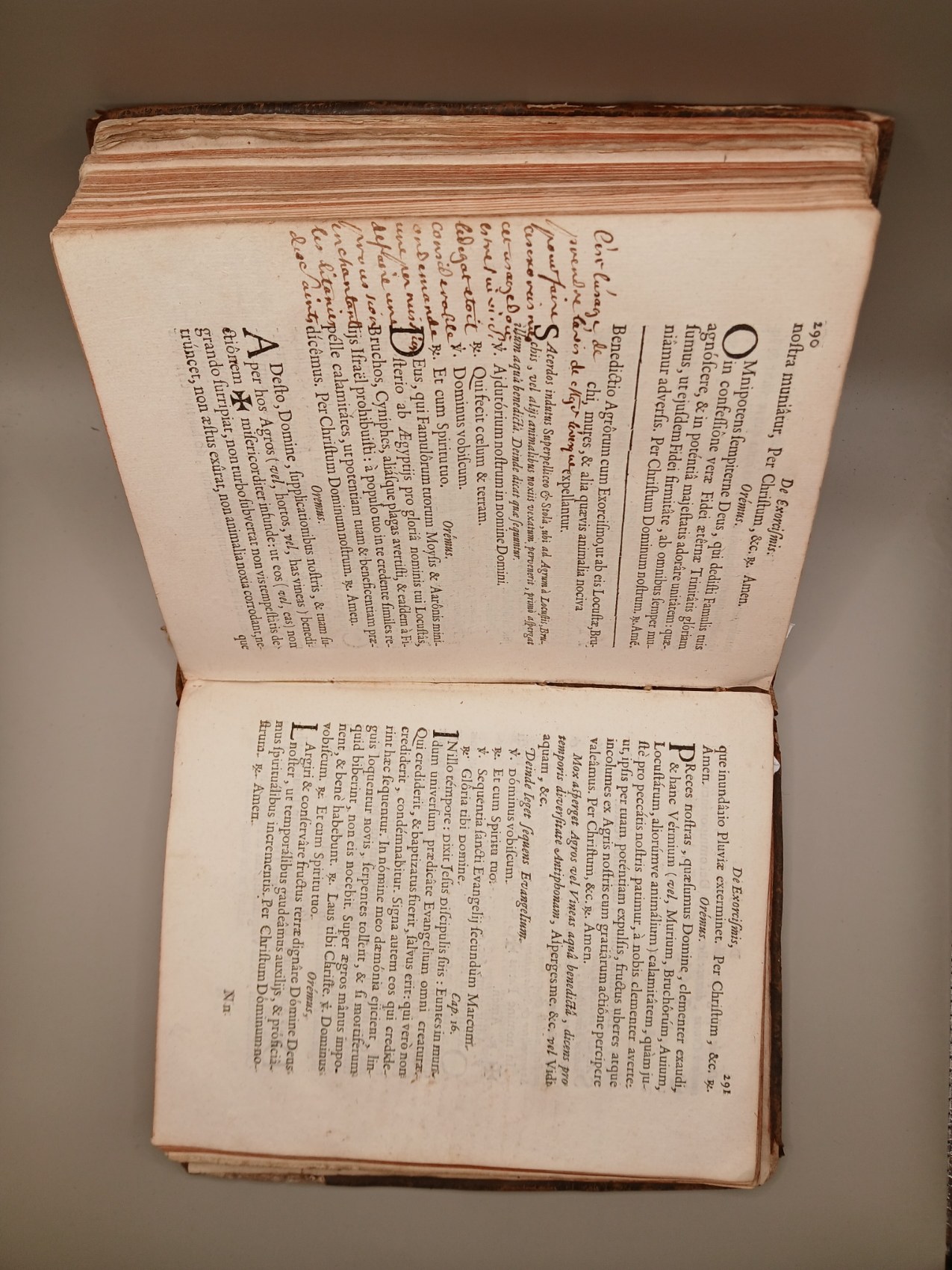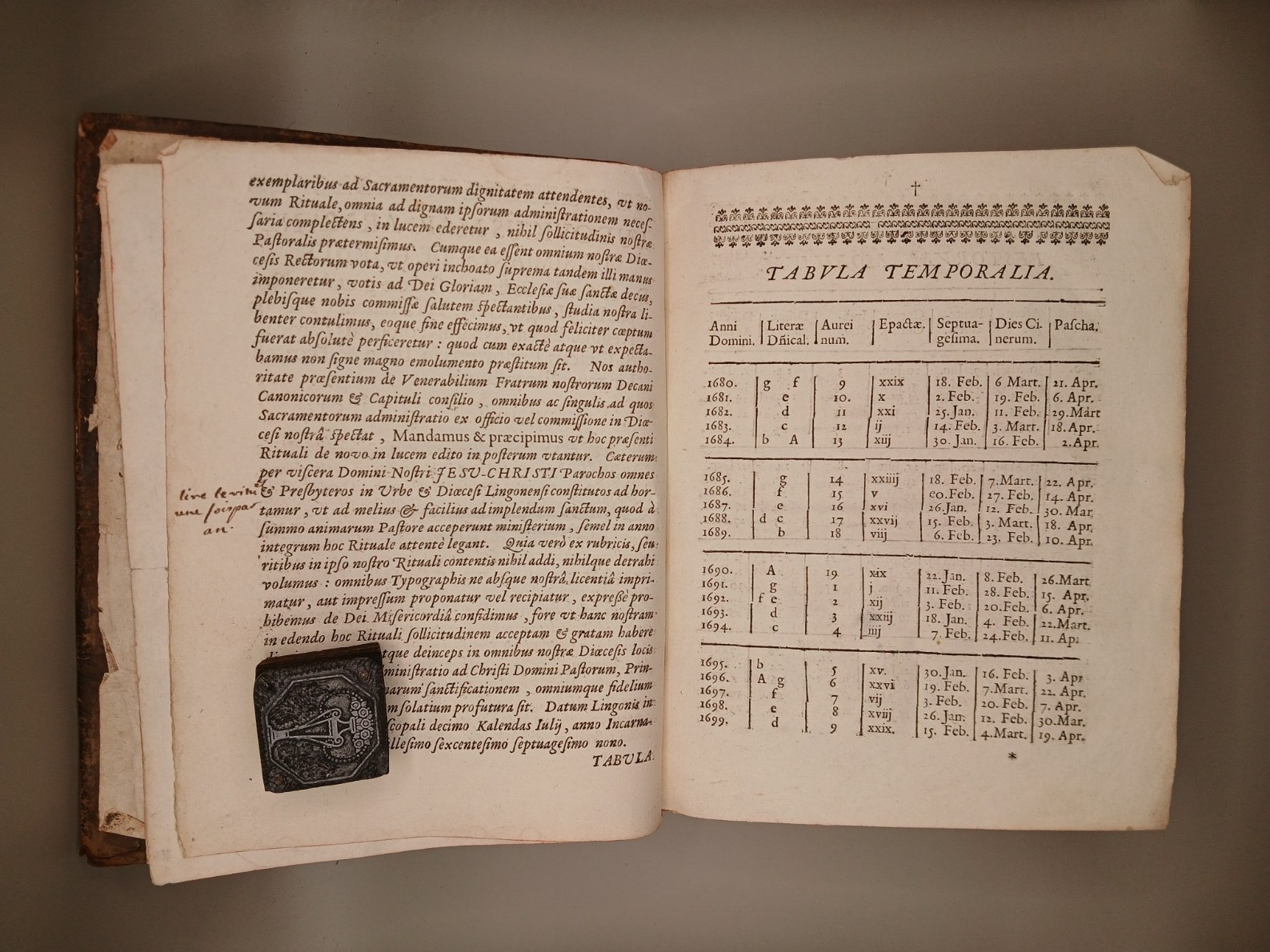 Kalendarz świąt w latach 1680-1699, liczne notatki z epoki w tekście i na wyklejkach, wpis własnościowy z 1790 roku, rytuał egzorcyzmu od s. 284