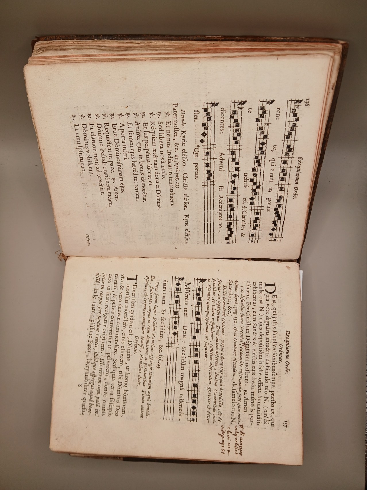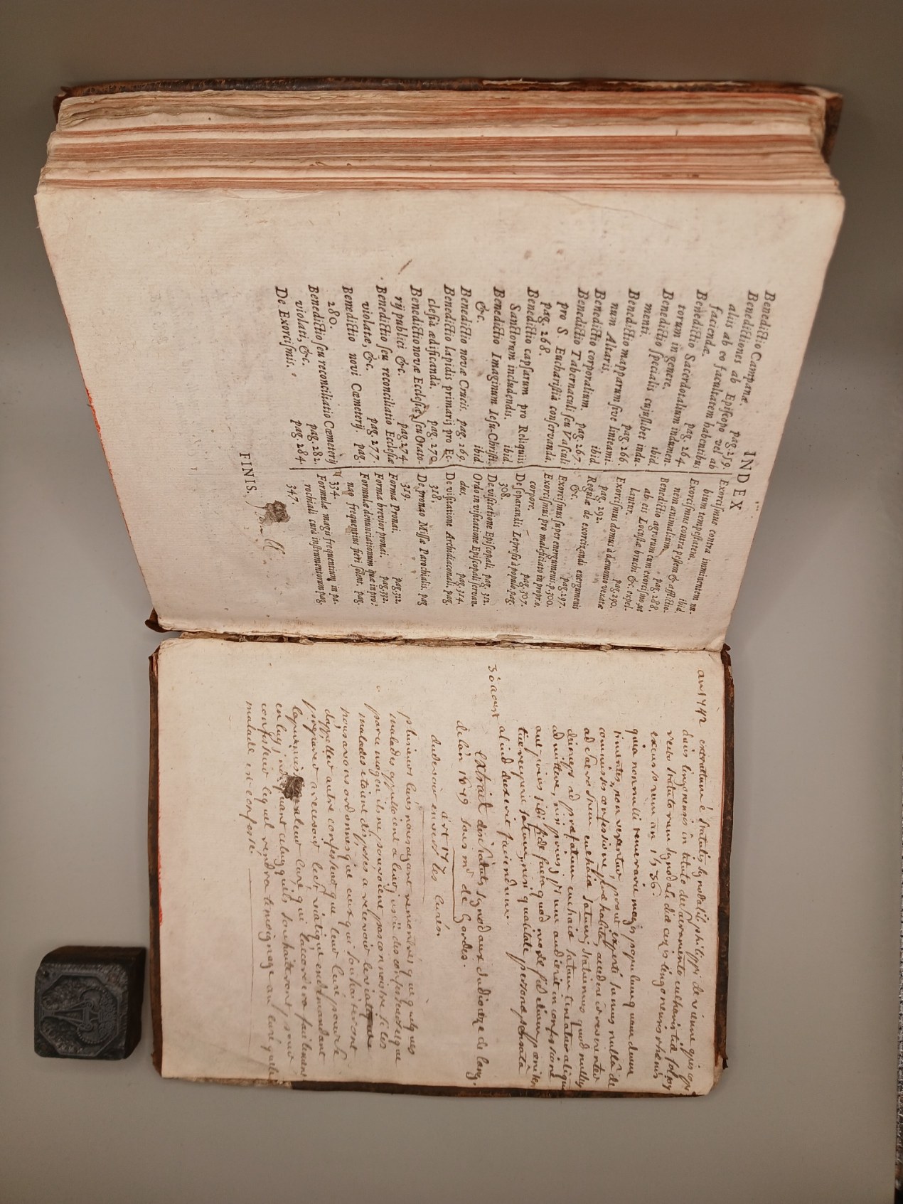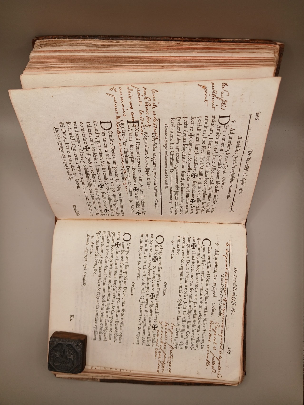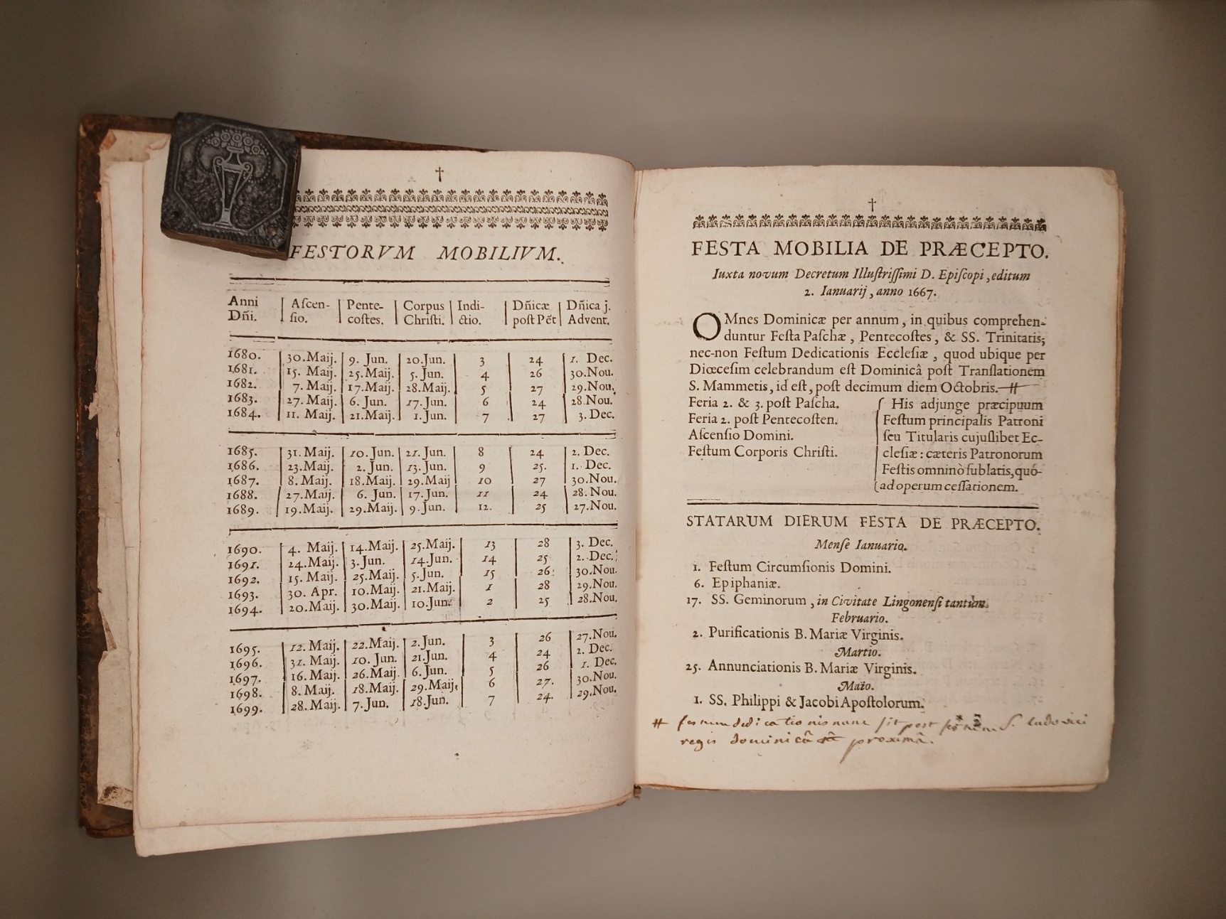 Kalendarz świąt w latach 1680-1699, liczne notatki z epoki w tekście i na wyklejkach, wpis własnościowy z 1790 roku, rytuał egzorcyzmu od s. 284