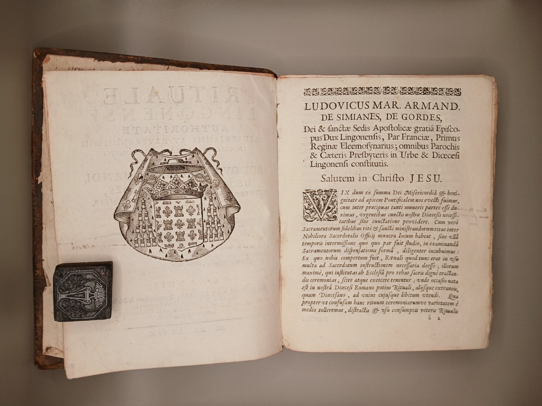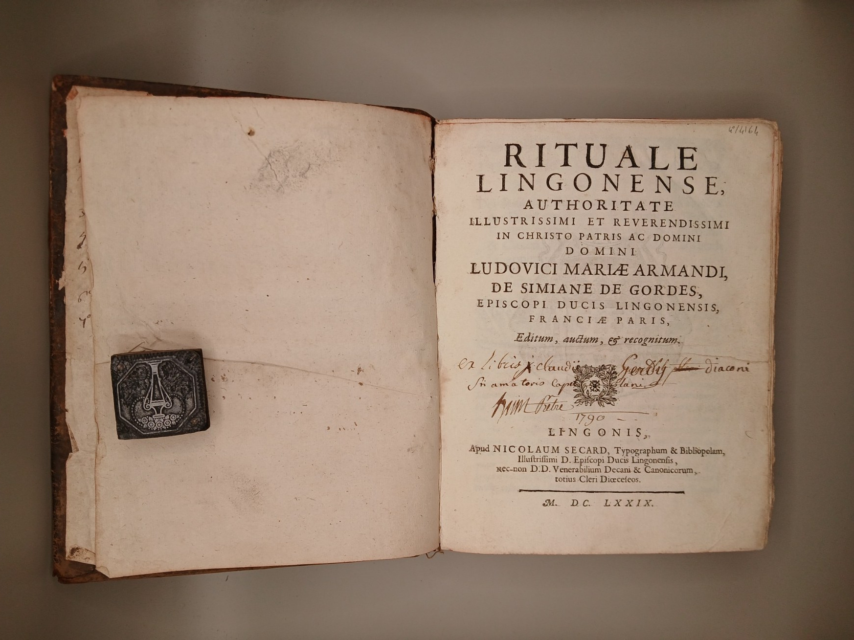 RITUALE LINGONENSE, AUTHORITATE ILLUSTRISSIMI ET REVERENDISSIMI IN CHRISTO PATRIS AC DOMINI [...] LINGONIS 1679. 22x18 cm, s. [12], 358, XXXVI, INDEX. Oprawa pełna skóra z tłoczeniami, barwione brzegi kart. Blok poluźniony, zaplamienia.