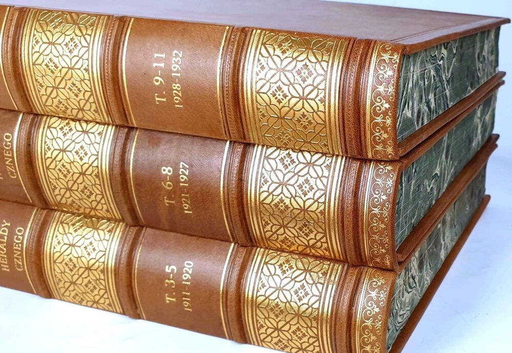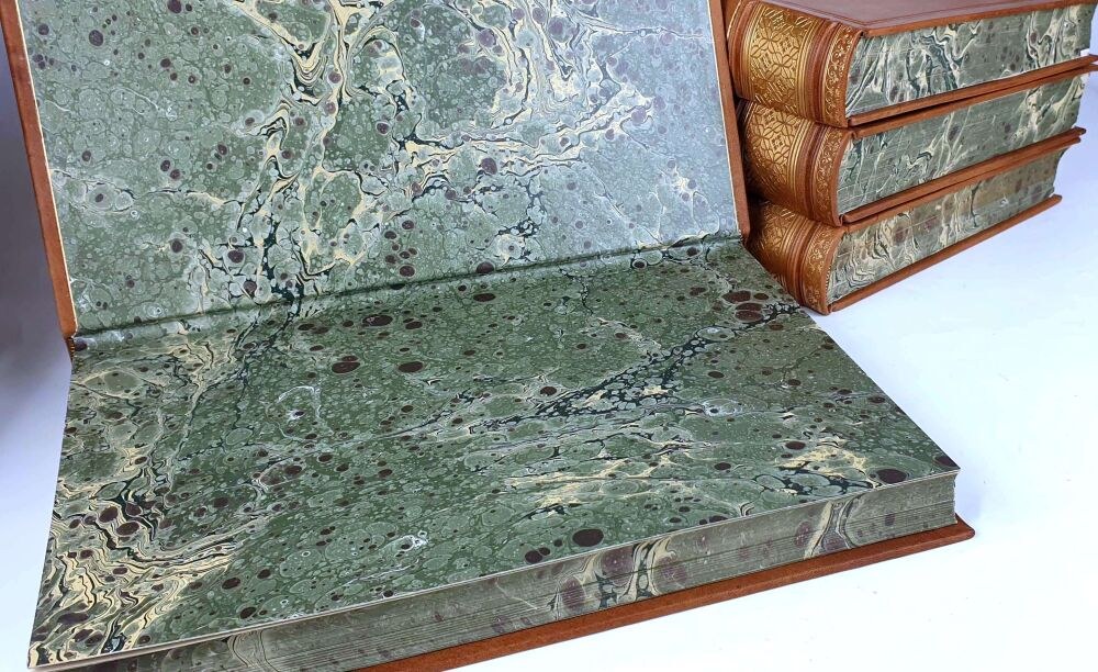 TWARDA OPRAWA PEŁNA SKÓRA WSPÓŁCZESNA, GRZBIET OZDOBNY, RĘCZNIE MARMORYZOWANY PAPIER NA WYKLEJKACH, TEN SAM WZÓR NA OBCIĘCIACH KART, ZACHOWANE OKŁADKI BROSZUROWE