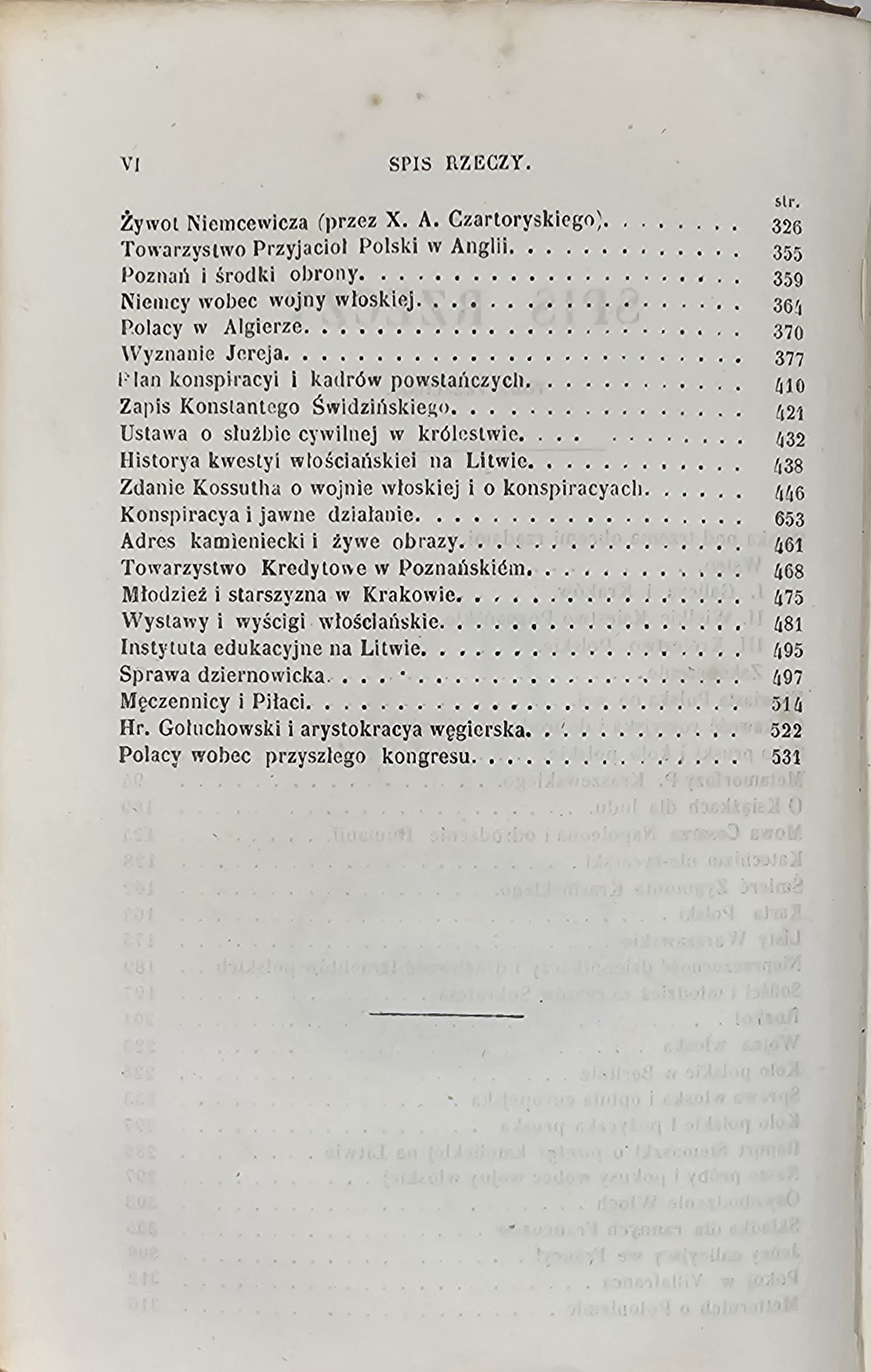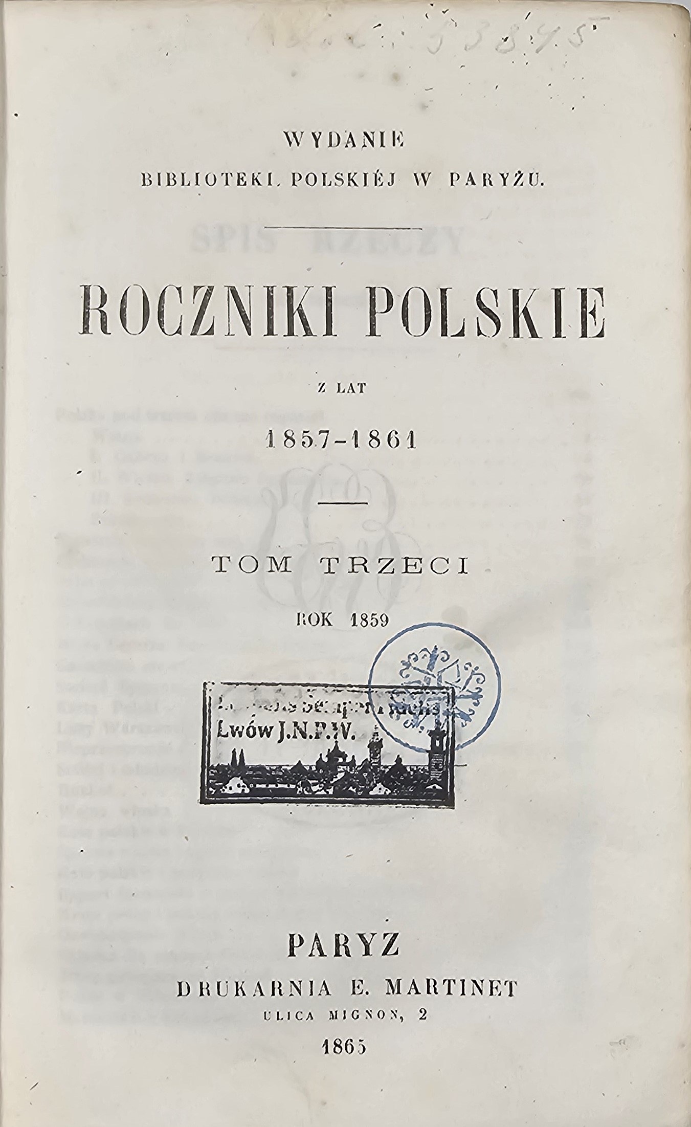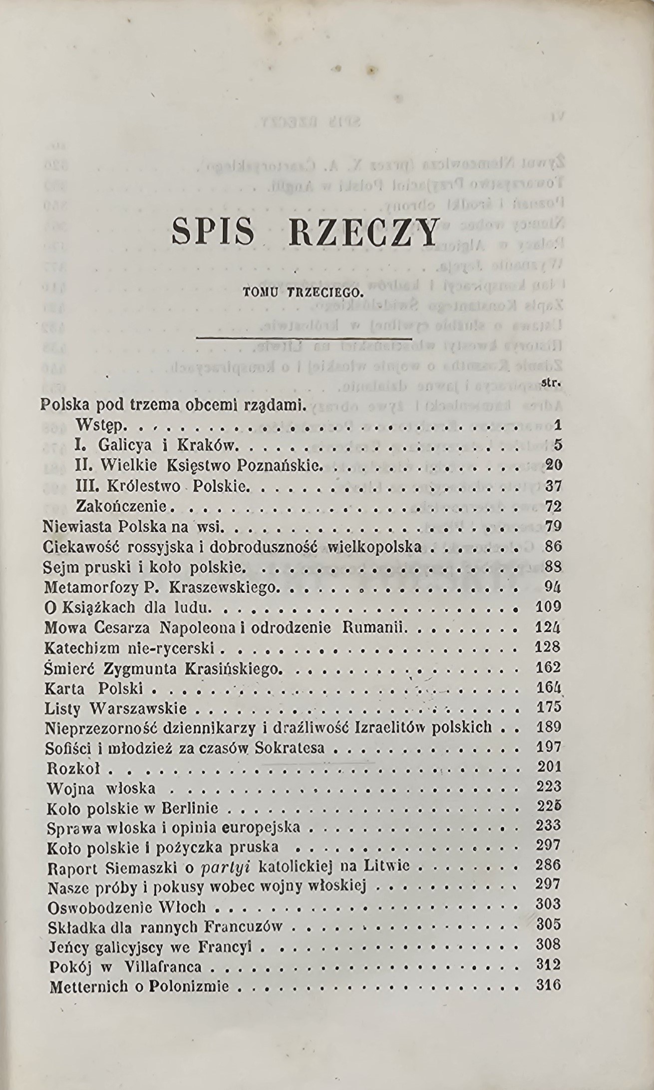 16d, s. VI, [2], 535, opr. psk. z epoki. Na str. tytuł. pieczęcie. Stan dobry. Zawiera m.in.: Polska pod trzema obcemi rządami. Niewiasta polska na wsi. Katechizm nie-rycerski. Śmierć Zygmunta Krasińskiego. Nieprzezorność dziennikarzy i drażliwość izraelitów polskich. Raport Siemaszki o partyi katolickiej na Litwie. Jeńcy galicyjscy we Francyi. Plan konspiracyi i kadrów powstańczych. Historia kwestyi włościańskiej na Litwie. Młodzież i starszyzna w Krakowie. Sprawa dziernowicka.