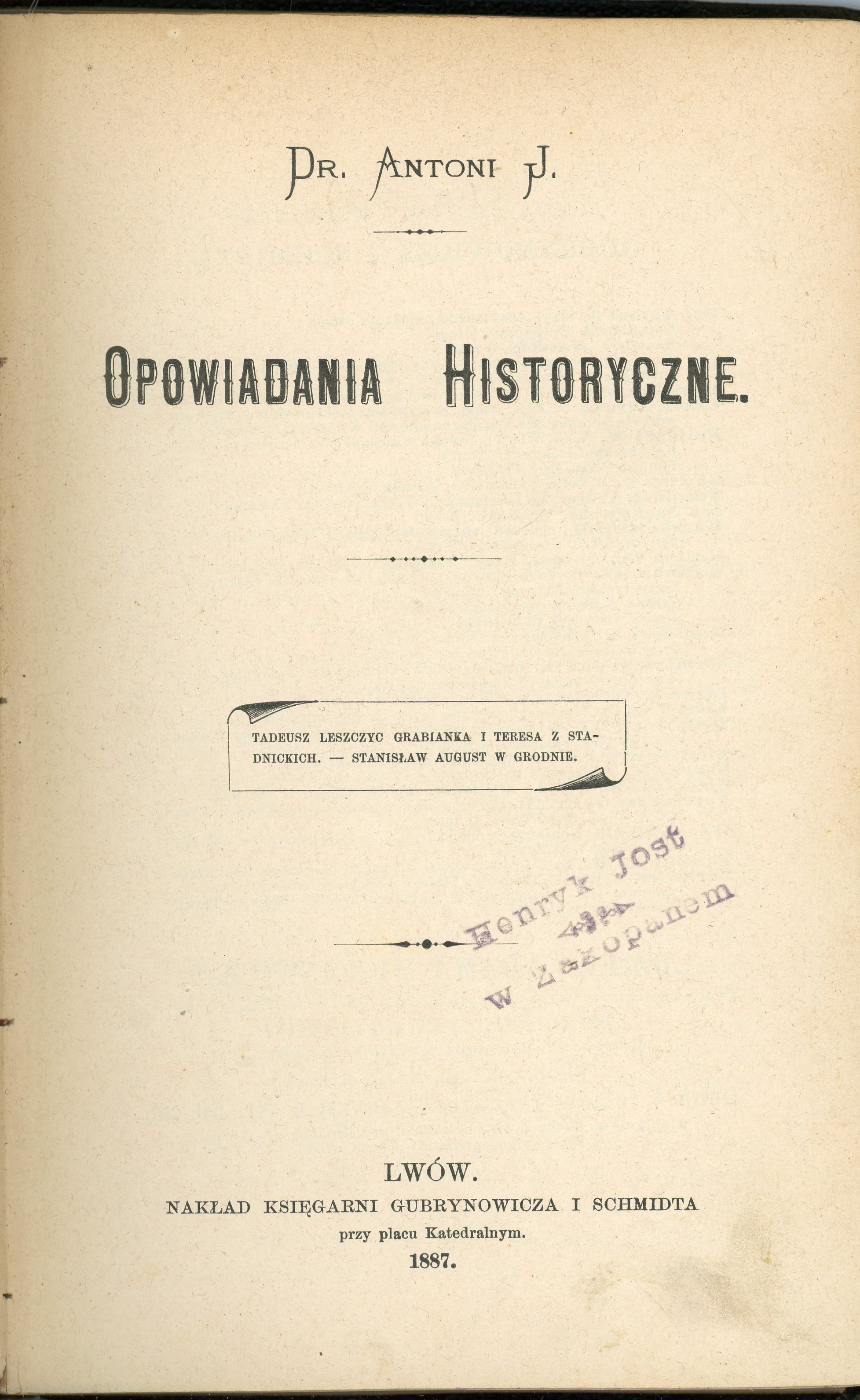 8, s. [4], 215, [2], opr. wtórna z epoki. Oprawa miejscami lekko przetarta, na str. tytuł. pieczęć poza tym stan dobry. Na stronie tytuł. pseudonim, nazwa autora: Antoni Józef Rolle.