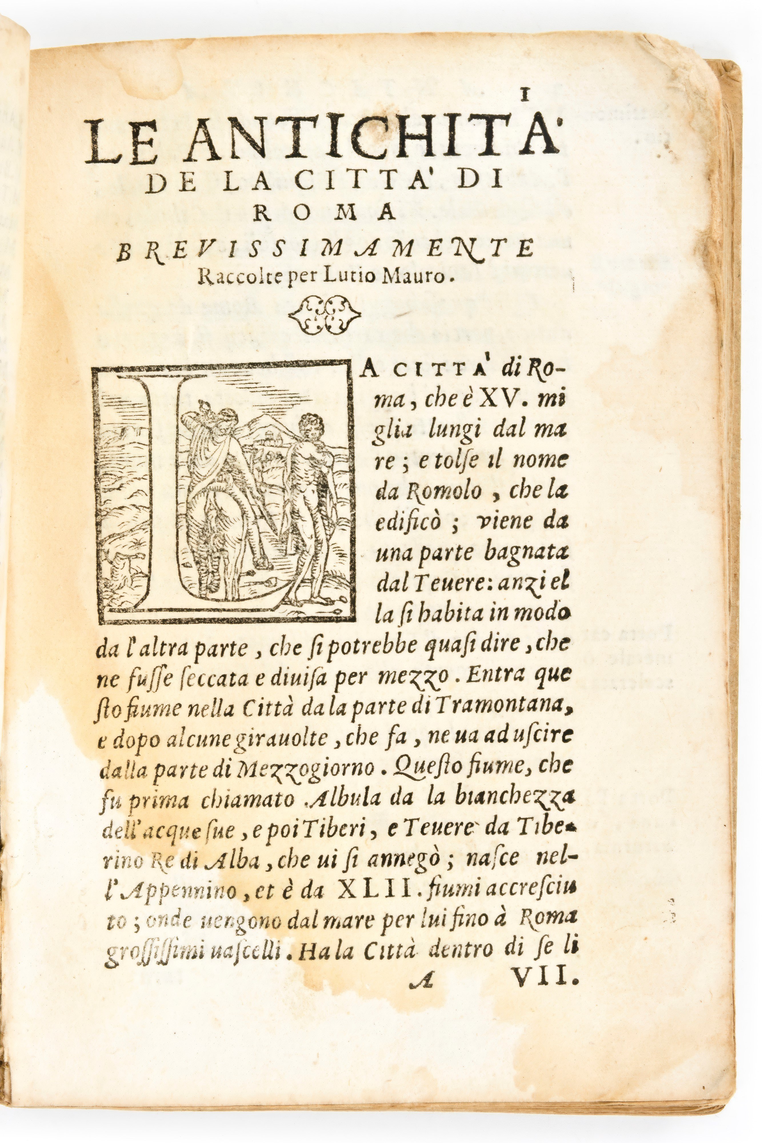 Cinquecentina impressa in Venezia per Giordano Ziletti il 1562. Guida dei monumenti di Roma dello storico Lucio Mauro (XVI sec.), servendosi di autori antichi e moderni. Dalla p. 115 (c. H2) inizia la guida delle statue antiche che si trovano in Roma, opera dell'enciclopedista Ulisse Aldrovandi (c. 1555-1605).