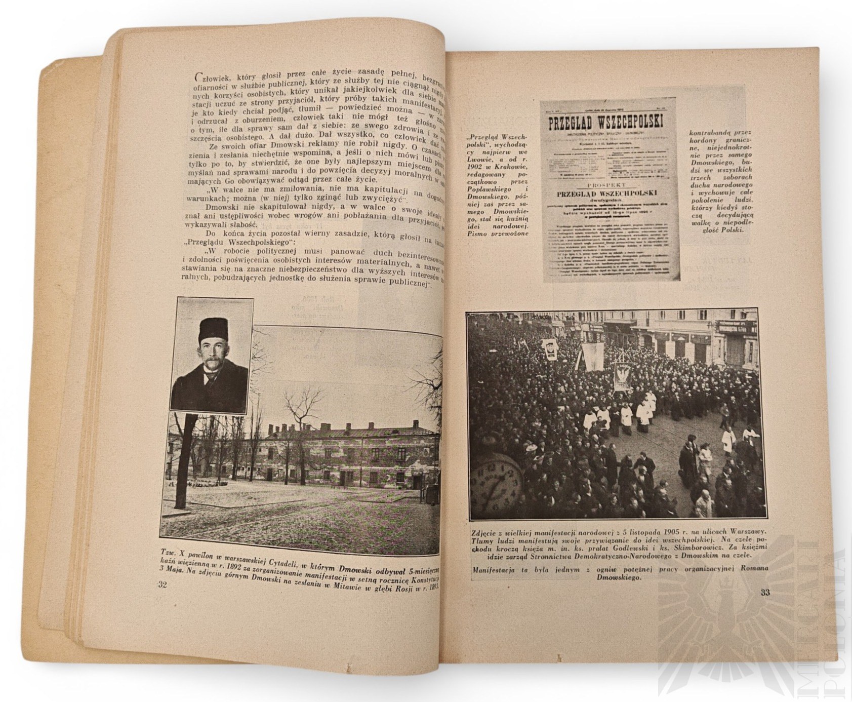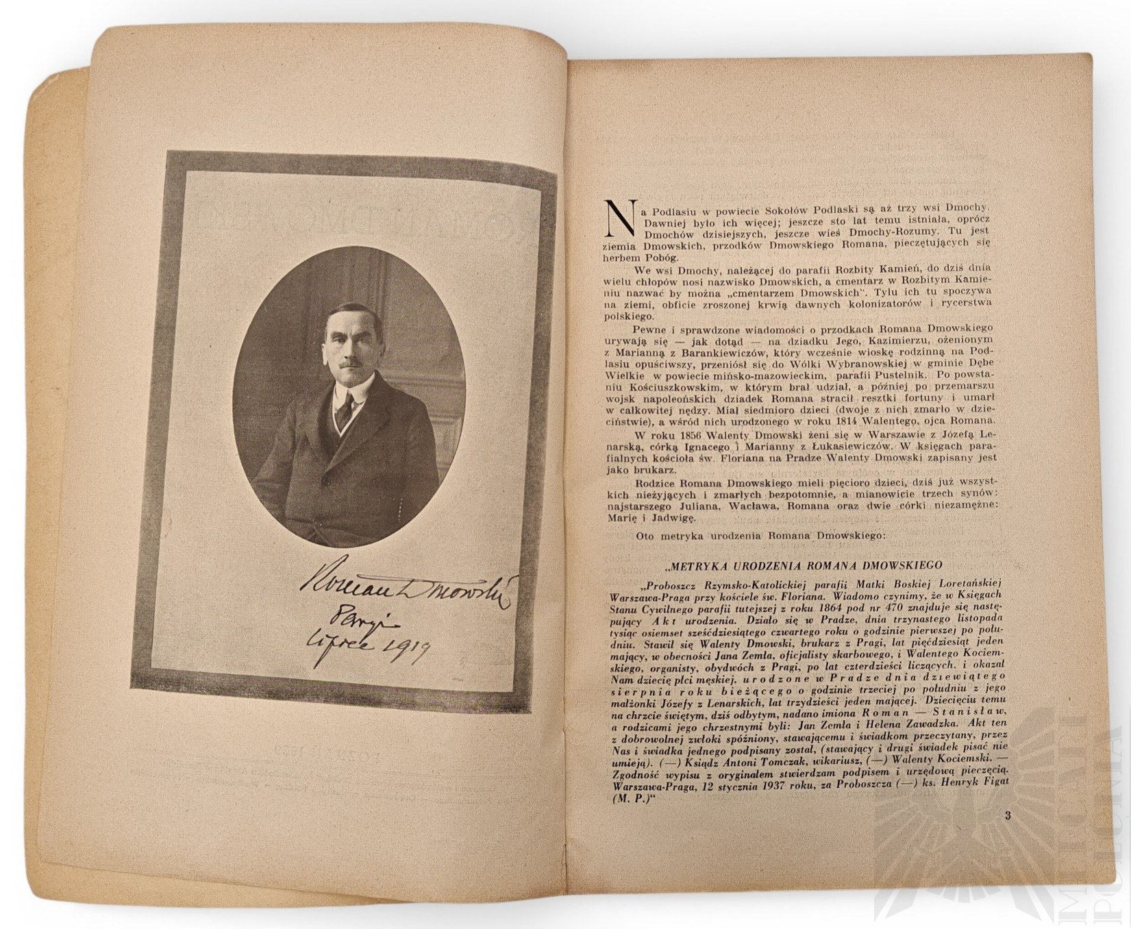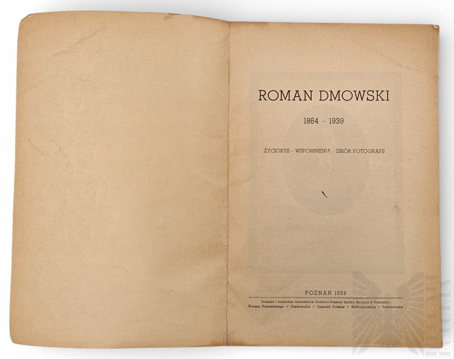 Publikacja “Roman Dmowski 1864-1939 Życiorys Wspomnienia Zbiór Fotografij” wydana w Poznaniu w 1939 nakładem Drukarni Polskiej Spółka Akcyjna w Poznaniu. Poświęcona osobie Romana Dmowskiego, jednego z twórców Niepodległej Polskiej, wydana w roku jego śmierci. Wymiary 26.5cm x 18cm