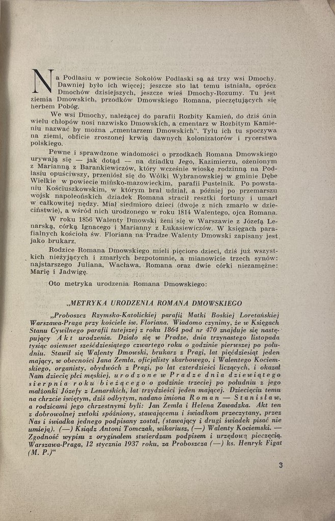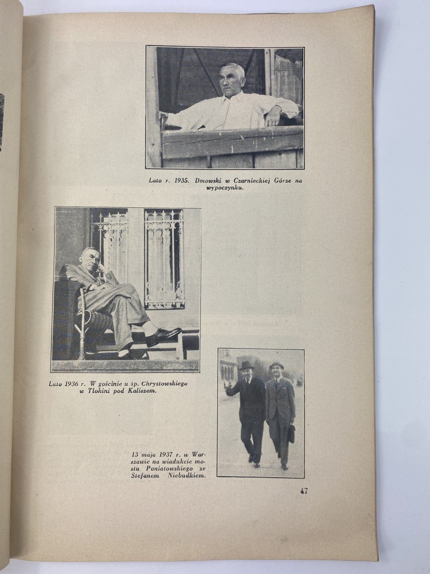 Roman Dmowski: 1864-1939: życiorys, wspomnienia, zbiór fotografij / [całość oprac. Feliks Fikus], Drukarnia Polska, Poznań 1939, s. 93, wymiary 18 x 26 cm. Okładka broszurowa, wydawnicza. Otarcia, zabrudzenia okładki. Zagięcia narożników.