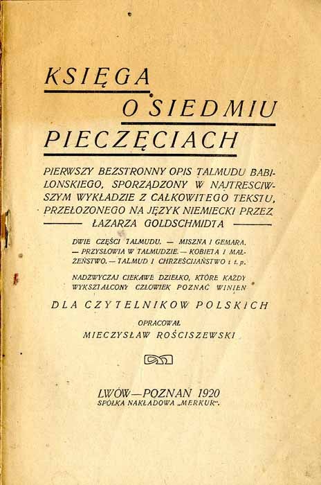 Tytuł: Księga o siedmiu pieczęciach. Pierwszy bezstronny opis talmudu babilonskiego, sporządzony w najtresciwszym wykładzie z całkowitego tekstu przełozonego na język niemiecki przez Łazarza Goldschmidta [...]