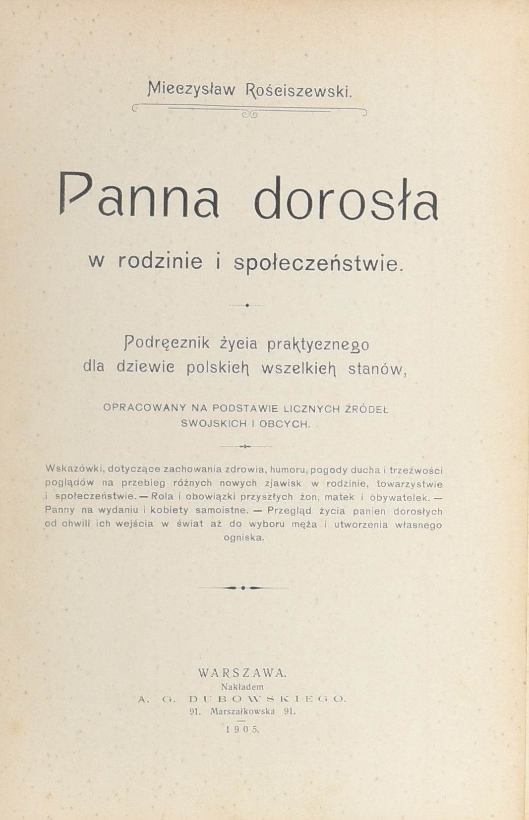 Podręcznik życia praktycznego dla dziewic polskich wszelkich stanów, opracowany na podstawie licznych źródeł swojskich i obcych. Wskazówki dotyczące zachowania zdrowia, humoru, pogody ducha i trzeźwości poglądów (...) Rola i obowiązki przyszłych żon, matek i obywatelek. Panny na wydaniu i kobiety samoistne. Przegląd życia panien dorosłych od chwili ich wejścia w świat aż do wyboru męża i utworzenia własnego ogniska. Druk Alfreda Zonera. 8, s. IX, 273, [4], opr. oryg. miejscami przetarta, poza tym stan dobry.