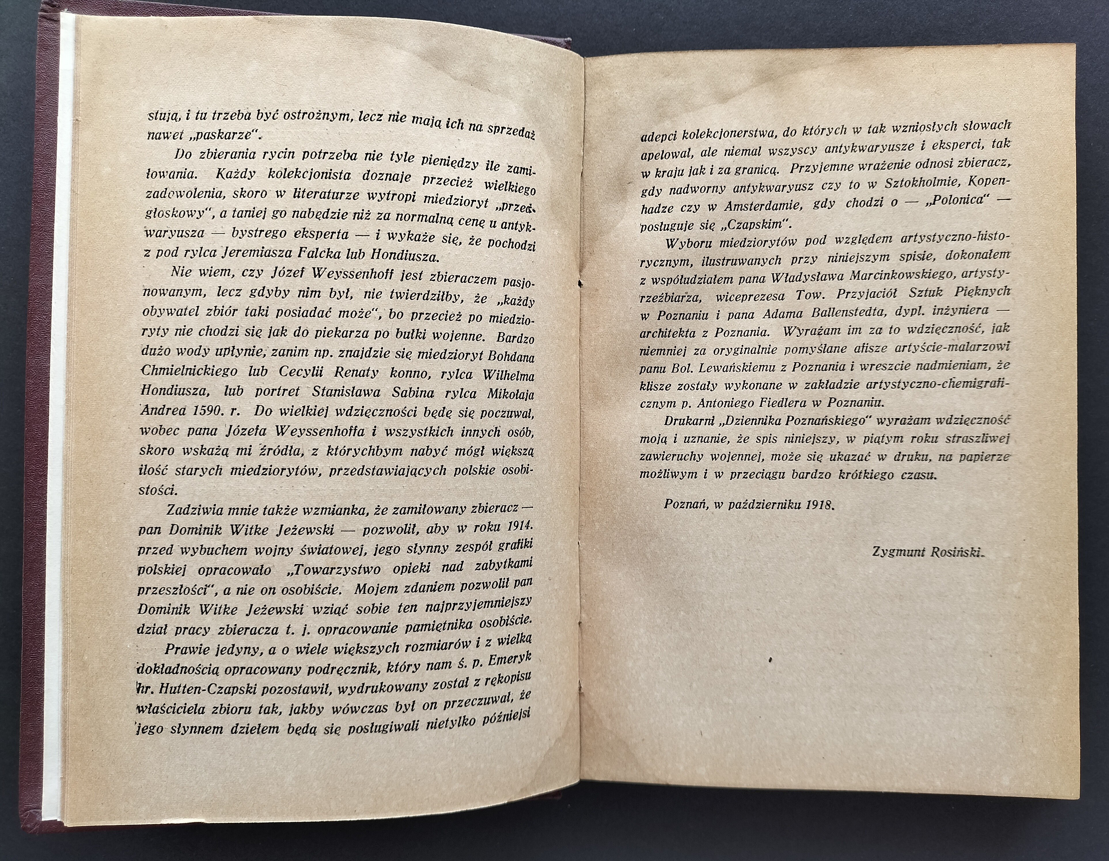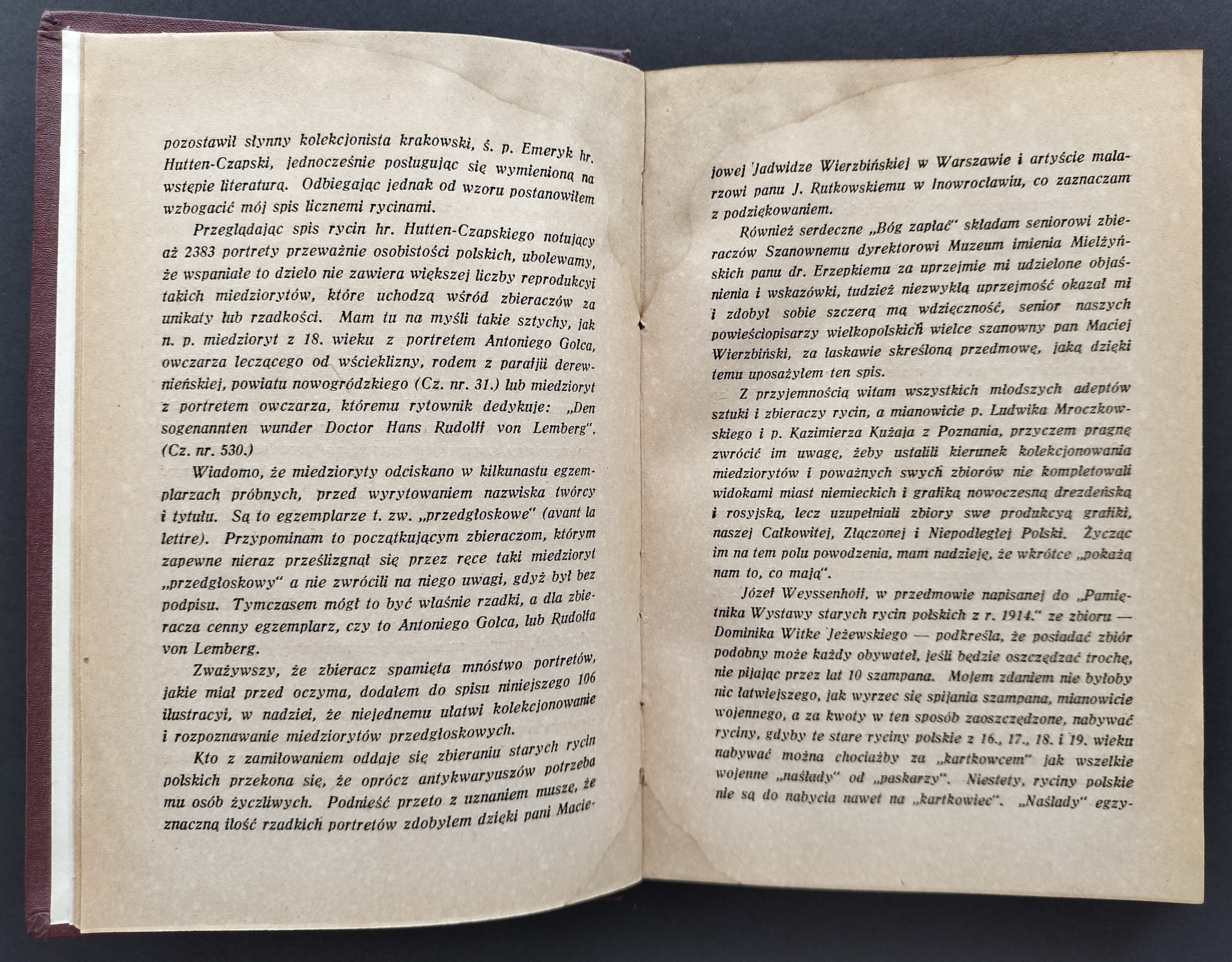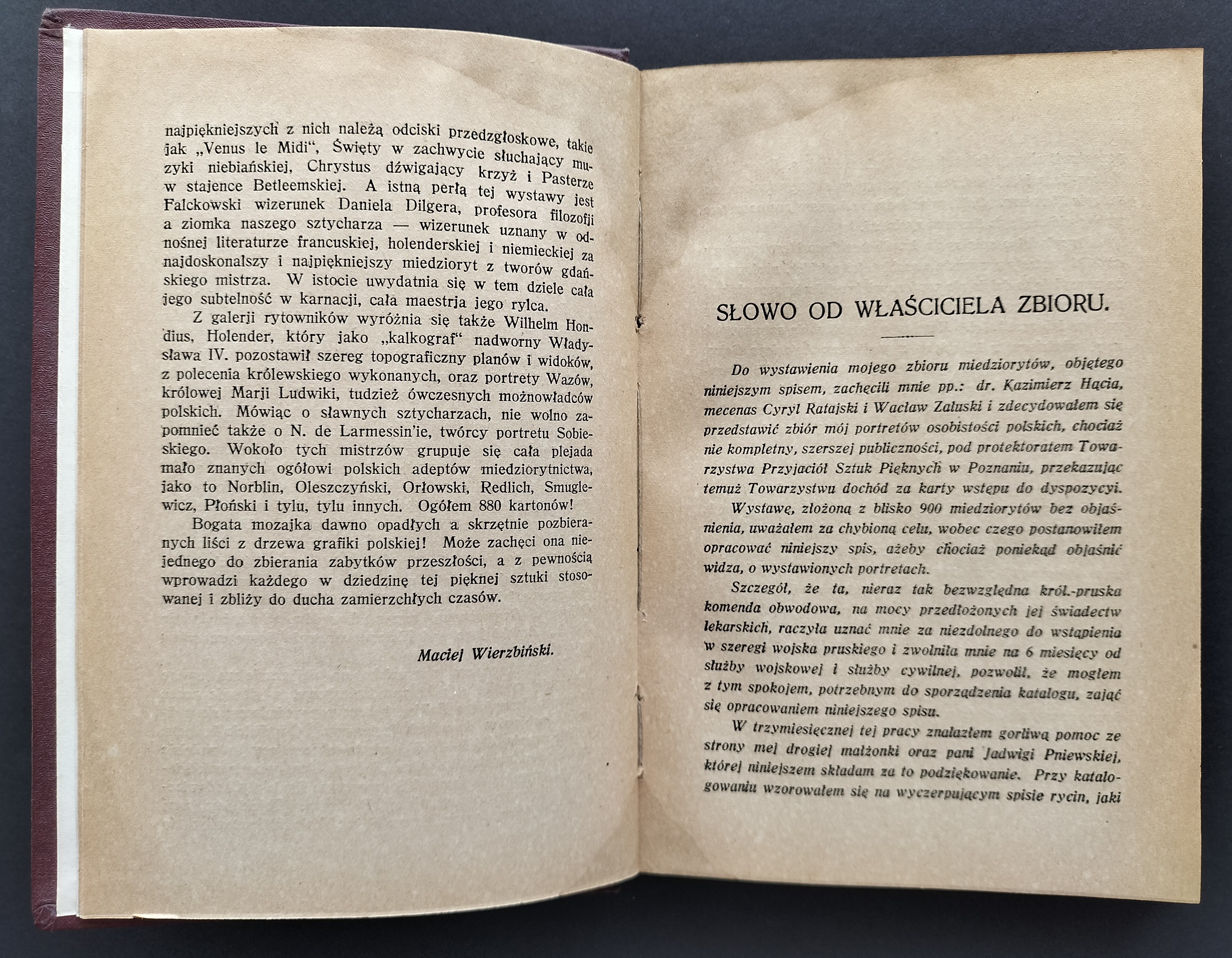 SŁOWO OD WŁAŚCICIELA ZBIORU: "Do wystawienia mojego zbioru miedziorytów, objętego niniejszym spisem, zachęcili mnie pp.: dr. Kazimierz Hącia, mecenas Cyryl Ratajski i Wacław Zaluski i zdecydowałem się przedstawić zbiór mój portretów osobistości polskich, chociaż nie kompletny, szerszej publiczności, pod protektoratem Towarzystwa Przyjaciół Sztuk Pięknych w Poznaniu, przekazując temuż Towarzystwu dochód za karty wstępu do dyspozycyi.Wystawę, złożoną z blisko 900 miedziorytów bez objaśnienia, uważałem za chybioną celu, wobec czego postanowiłem opracować niniejszy spis, ażeby chociaż poniekąd objaśnić widza, o wystawionych portretach. Szczegół, że ta, nieraz tak bezwzględna król.-pruska komenda obwodowa, na mocy przedłożonych jej świadectw lekarskich, raczyła uznać mnie za niezdolnego do wstąpienia w szeregi wojska pruskiego i zwolniła mnie na 6 miesięcy od służby wojskowej i służby cywilnej, pozwolił, że mogłem z tym spokojem, potrzebnym do sporządzenia katalogu, zająć się opracowaniem niniejszego spisu [...] Do zbierania rycin potrzeba nie tyle pieniędzy ile zamiłowania. Każdy kolekcjonista doznaje przecież wielkiego zadowolenia, skoro w literaturze wytropi miedzioryt „przed głoskowy", a taniej go nabędzie niż za normalną cenę u antykwaryusza - bystrego eksperta - i wykaże się, że pochodzi z pod rylca Jeremiasza Falcka lub Hondiusza. Nie wiem, czy Józef Weyssenhoff jest zbieraczem pasjonowanym, lecz gdyby nim był, nie twierdziłby, że „każdy obywatel zbiór taki posiadać może“, bo przecież po miedzioryty nie chodzi się jak do piekarza po bułki wojenne. Bardzo dużo wody upłynie, zanim np. znajdzie się miedzioryt Bohdana Chmielnickiego lub Cecyli Renaty konno, rylca Wilhelma Hondiusza, lub portret Stanisława Sabina rylca Mikołaja Andrea 1590. r. Do wielkiej wdzięczności będę się poczuwał, wobec pana Józefa Weyssenhoffa i wszystkich innych osób, skoro wskażą mi źródła, z którychbym nabyć mógł większą ilość starych miedziorytów, przedstawiających polskie osobistości."