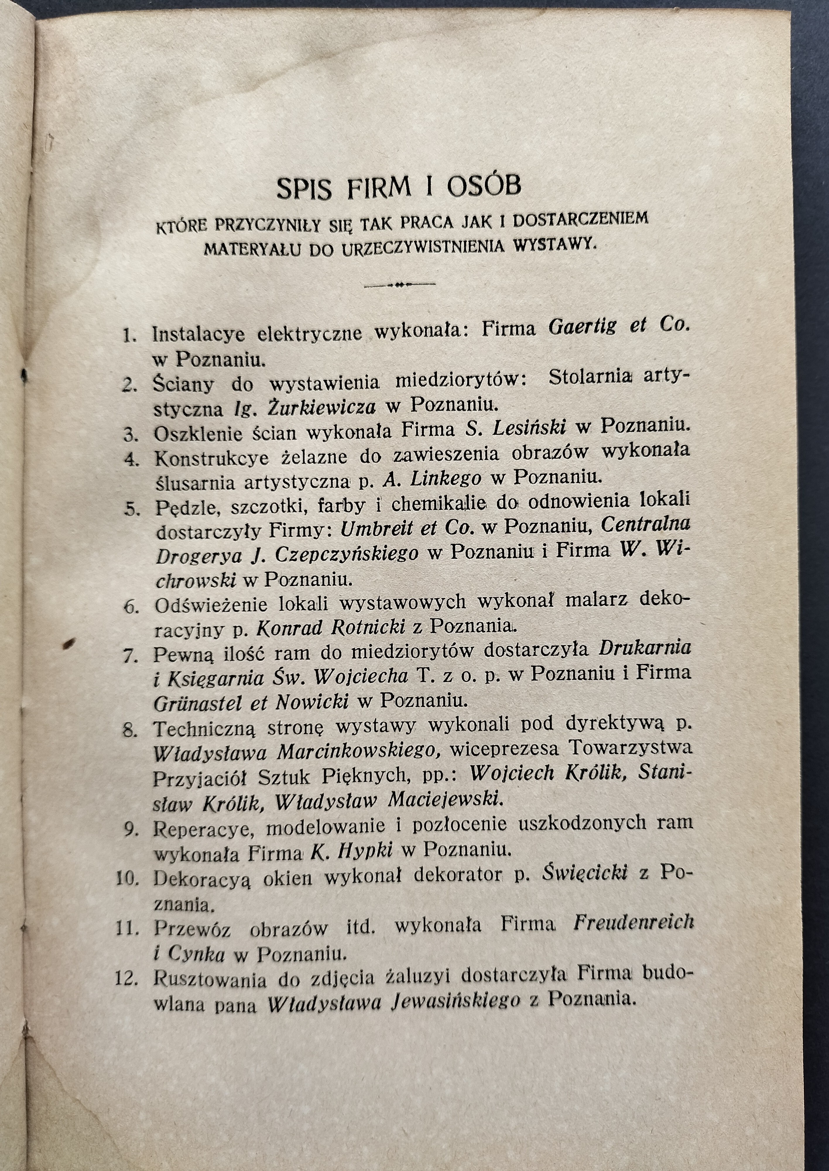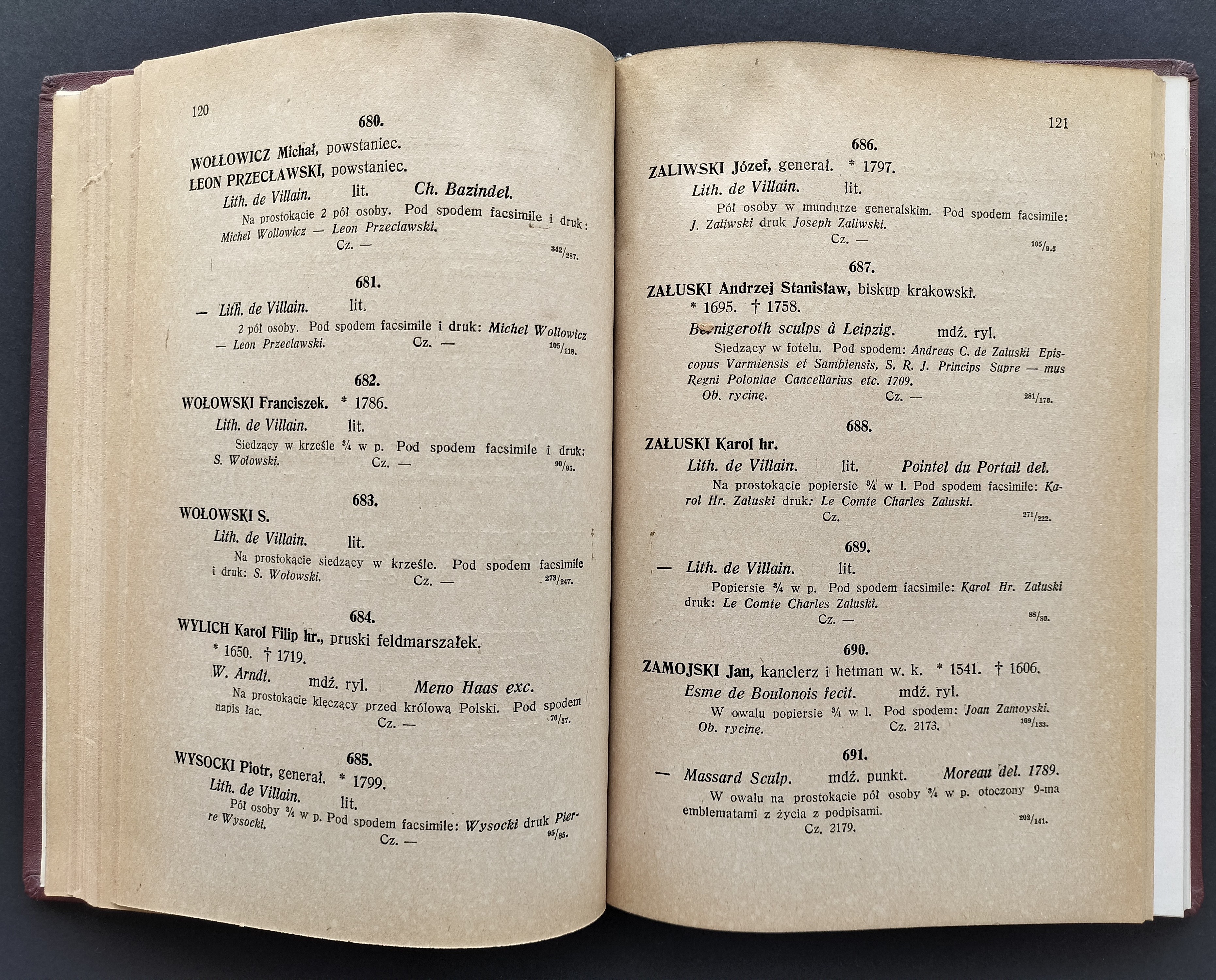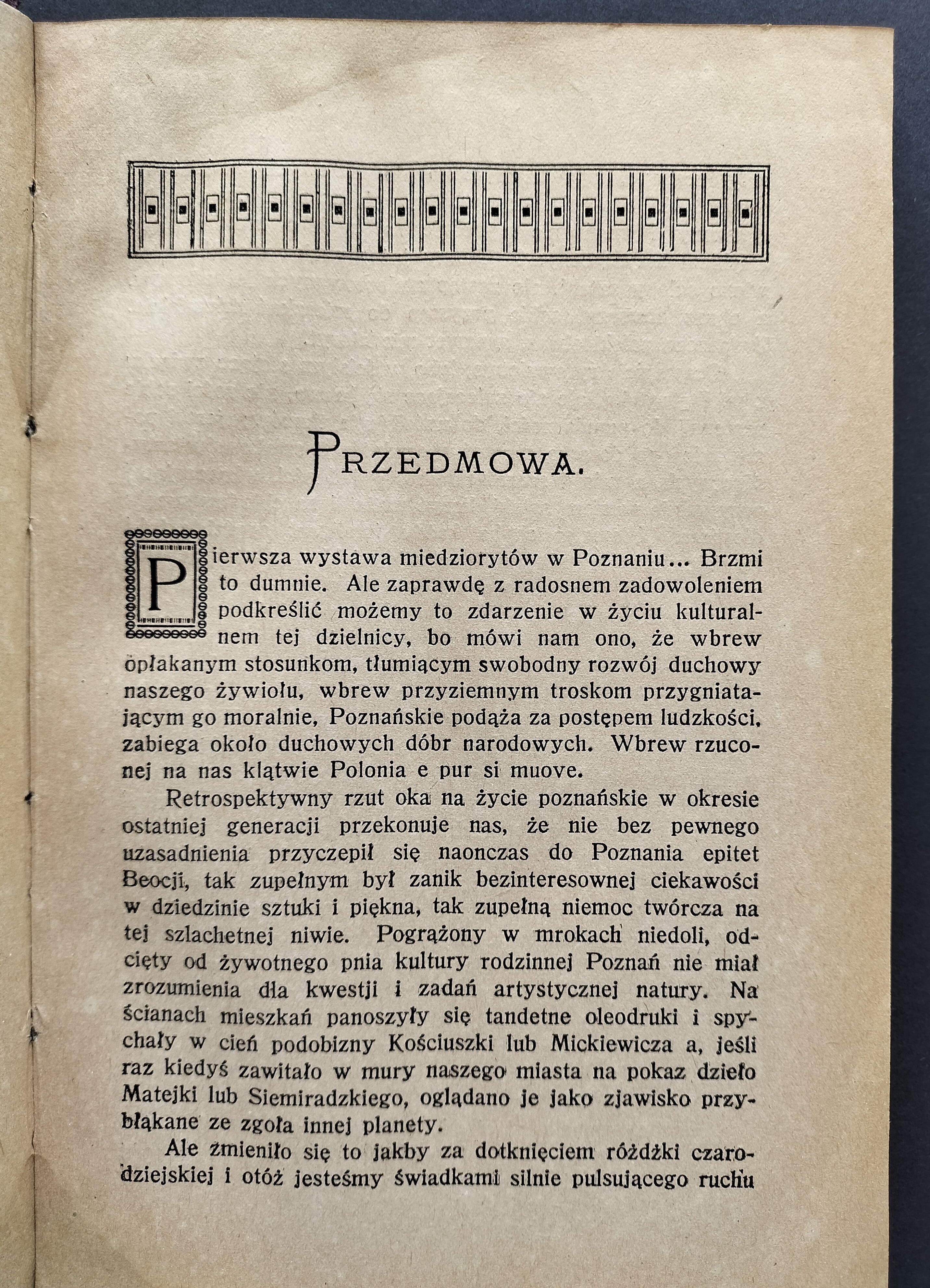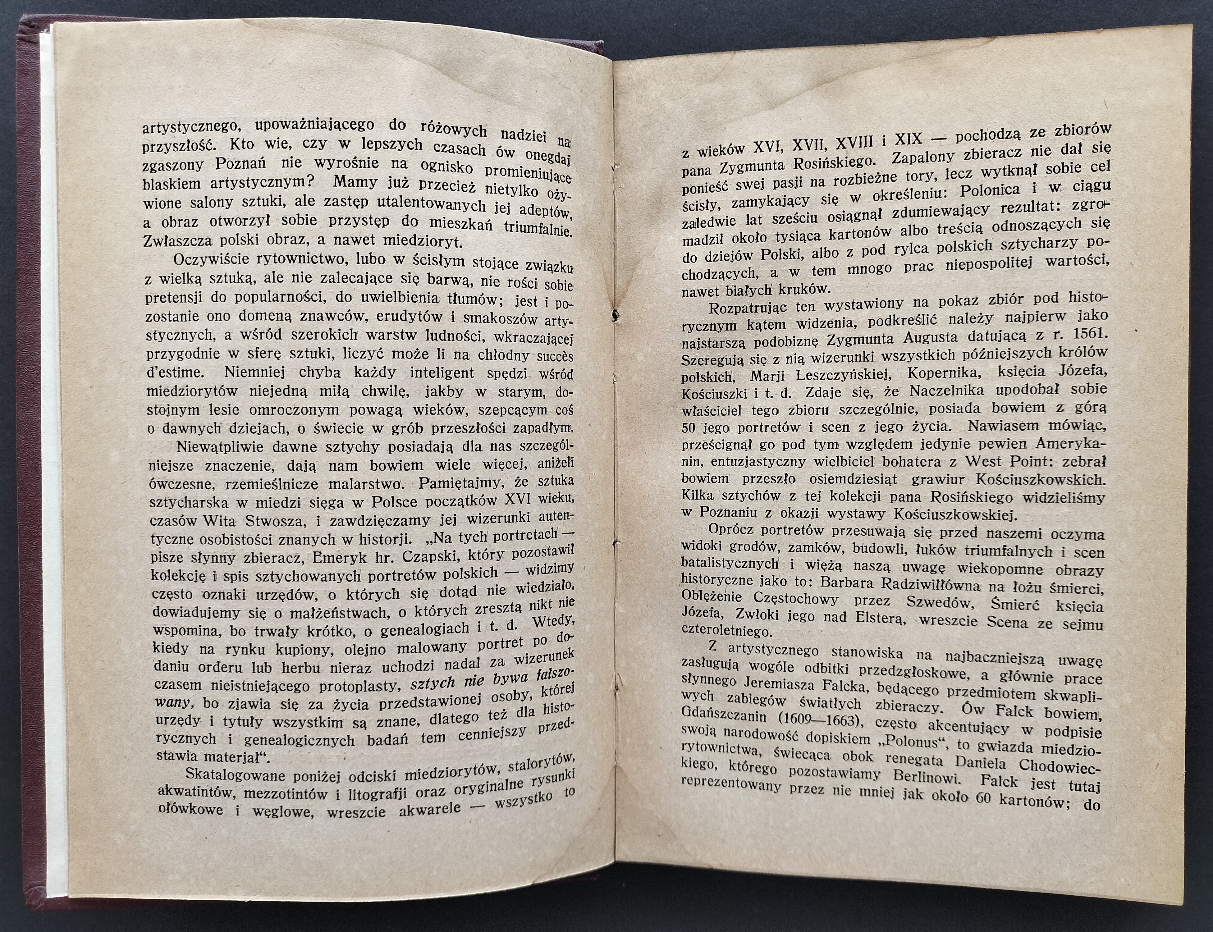 SŁOWO OD WŁAŚCICIELA ZBIORU: "Do wystawienia mojego zbioru miedziorytów, objętego niniejszym spisem, zachęcili mnie pp.: dr. Kazimierz Hącia, mecenas Cyryl Ratajski i Wacław Zaluski i zdecydowałem się przedstawić zbiór mój portretów osobistości polskich, chociaż nie kompletny, szerszej publiczności, pod protektoratem Towarzystwa Przyjaciół Sztuk Pięknych w Poznaniu, przekazując temuż Towarzystwu dochód za karty wstępu do dyspozycyi.Wystawę, złożoną z blisko 900 miedziorytów bez objaśnienia, uważałem za chybioną celu, wobec czego postanowiłem opracować niniejszy spis, ażeby chociaż poniekąd objaśnić widza, o wystawionych portretach. Szczegół, że ta, nieraz tak bezwzględna król.-pruska komenda obwodowa, na mocy przedłożonych jej świadectw lekarskich, raczyła uznać mnie za niezdolnego do wstąpienia w szeregi wojska pruskiego i zwolniła mnie na 6 miesięcy od służby wojskowej i służby cywilnej, pozwolił, że mogłem z tym spokojem, potrzebnym do sporządzenia katalogu, zająć się opracowaniem niniejszego spisu [...] Do zbierania rycin potrzeba nie tyle pieniędzy ile zamiłowania. Każdy kolekcjonista doznaje przecież wielkiego zadowolenia, skoro w literaturze wytropi miedzioryt „przed głoskowy", a taniej go nabędzie niż za normalną cenę u antykwaryusza - bystrego eksperta - i wykaże się, że pochodzi z pod rylca Jeremiasza Falcka lub Hondiusza. Nie wiem, czy Józef Weyssenhoff jest zbieraczem pasjonowanym, lecz gdyby nim był, nie twierdziłby, że „każdy obywatel zbiór taki posiadać może“, bo przecież po miedzioryty nie chodzi się jak do piekarza po bułki wojenne. Bardzo dużo wody upłynie, zanim np. znajdzie się miedzioryt Bohdana Chmielnickiego lub Cecyli Renaty konno, rylca Wilhelma Hondiusza, lub portret Stanisława Sabina rylca Mikołaja Andrea 1590. r. Do wielkiej wdzięczności będę się poczuwał, wobec pana Józefa Weyssenhoffa i wszystkich innych osób, skoro wskażą mi źródła, z którychbym nabyć mógł większą ilość starych miedziorytów, przedstawiających polskie osobistości."