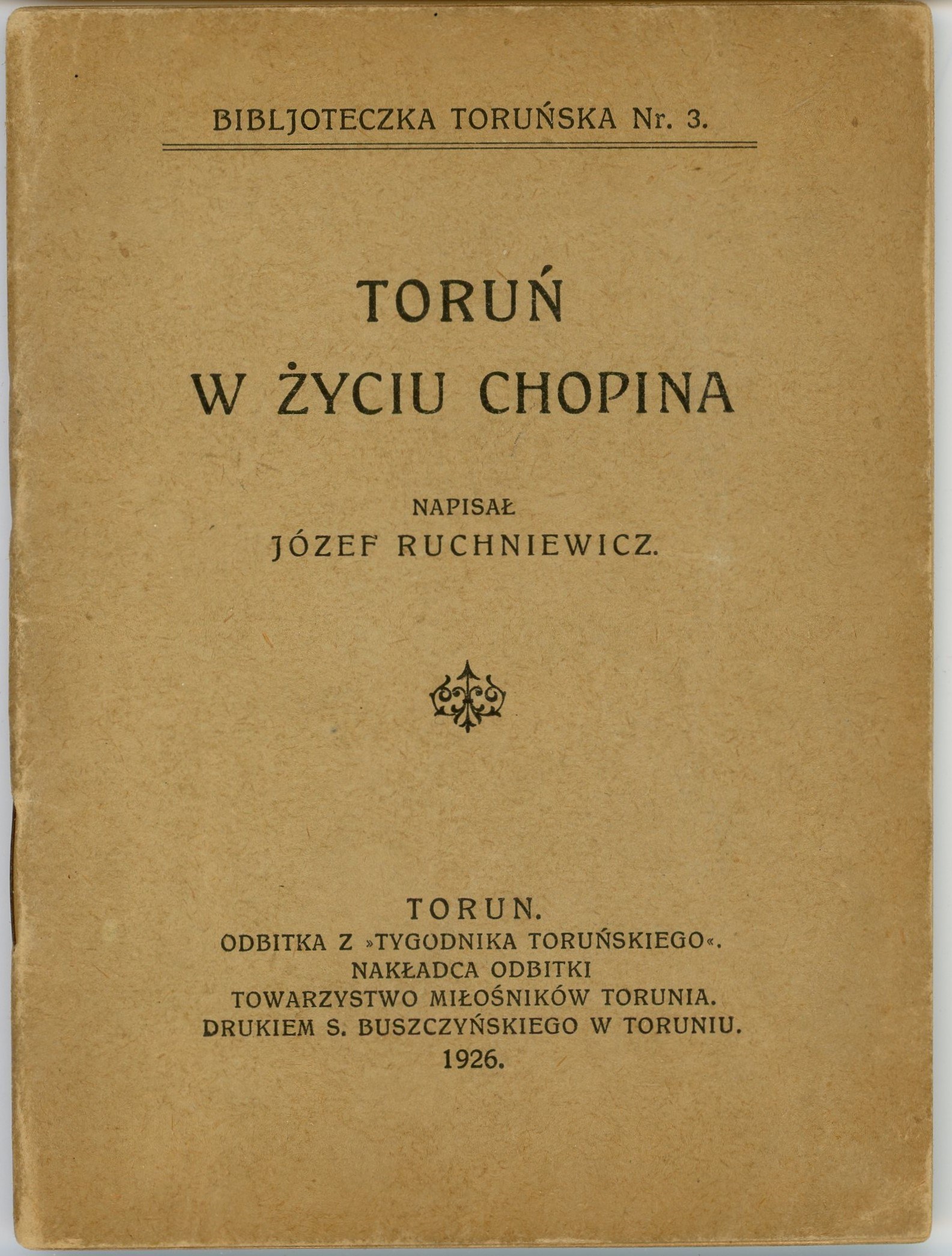 Druk S. Buszczyńskiego. 16, s. 41, [1], okł. oryg. Stan dobry. Odbitka z "Tygodnika Toruńskiego". Biblioteczka Toruńska nr 3.