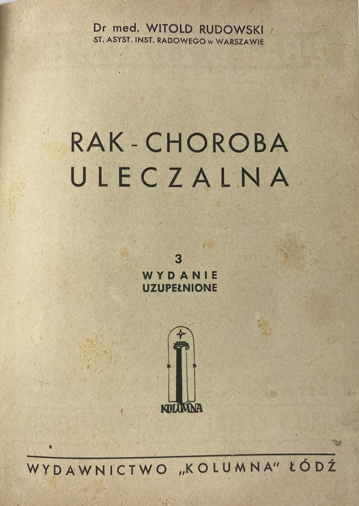 Rudowski Witold, Rak - choroba uleczalna, Wydawnictwo "Kolumna", Łódź 1948, s. 94, [1] k. tabl., wymiary 12,5 x 17 cm. Okładka półpłócienna. Niewielkie otarcia okładki.