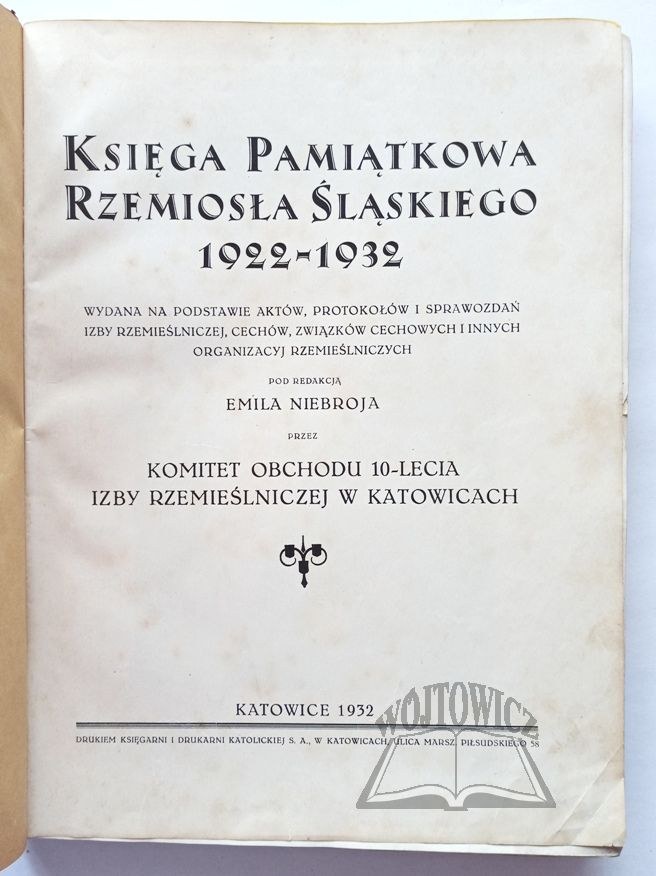 Wydana na podstawie aktów, protokołów i sprawozdań Izby Rzemieślniczej, Cechów, Związków Cechowych i innych organizacyj rzemieślniczych. Pod red. Emila Niebroja. Prez Komitet Obchodu 10-lecia Izby Rzemieślniczej w Katowicach. Katowice 1932. Drukiem Księgarni i Drukarni Katolickiej. 4, s. 348, ilustr. w tekście i na osobn. tabl., opr. ppł. wyd.