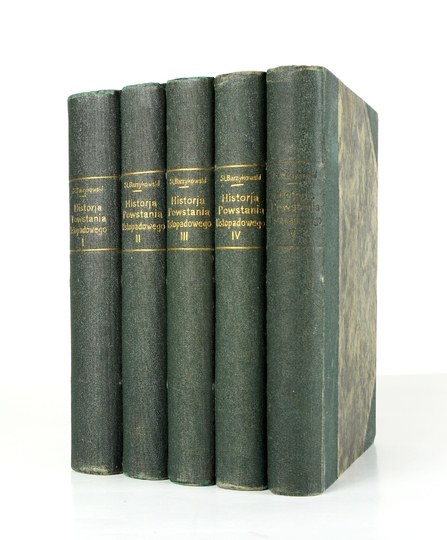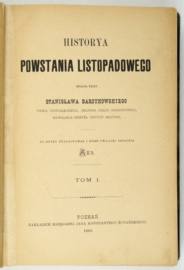BARZYKOWSKI Stanisław - Historya powstania listopadowego. Do druku przygotował i kilku uwagami objaśnił Aër [= A. Rzążewski]. T. 1-5. Poznań 1883-1884. Księg. J. K. Żupańskiego. 8, s. [4], LXXIX, [1], 492; [4], 421, tabl. 1; [4], 435, tabl. 1; [4], 447, tabl. 1; [4], 448. opr. nieco późn. ppł.