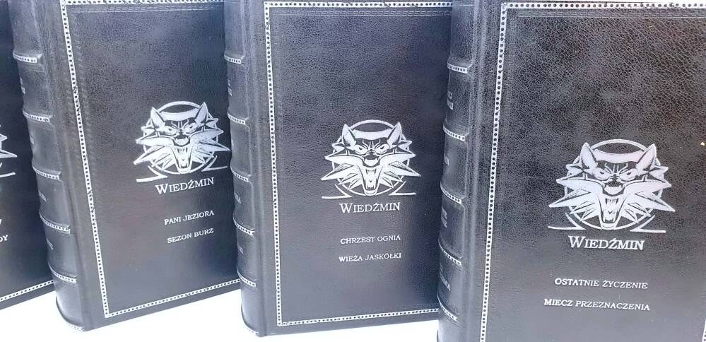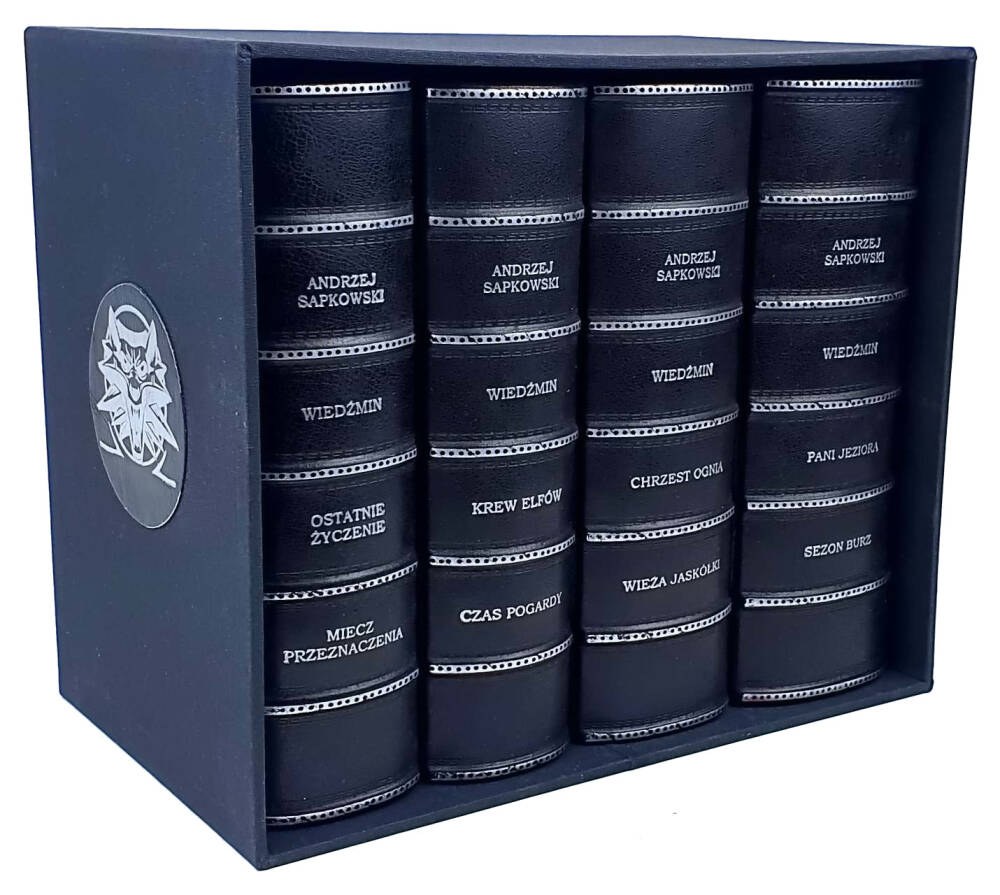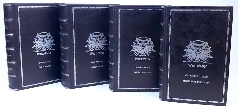OPRAWA TWARDA PEŁNA SKÓRA, GRZBIETY Z WYPUKŁYMI ZŁOCONYMI ZWIĄZAMI PODREŚLONYMI ŚLEPYMI TOCZENIAMI, SREBRZONA TYTULATURA, NA PRZEDNICH LICACH SREBRZONY MOTYW WILKA BĘDĄCEGO SYMBOLEM TYTUŁOWEGO BOHATERA OKOLONY OZDOBNĄ BORDIURĄ NAPRZEMIENNIE TŁOCZONĄ NA ŚLEPO I SREBREM, NA TYLNIM LICU POWTÓRZONY MOTYW WILKA W FORMIE ŚLEPEGO TŁOKU, OBCIĘCIA KART BARWIONE NA CZERWONO, OZDOBNE WYKLEJKI, OZDOBNE ETUI DOPEŁNIA CAŁOŚCI
