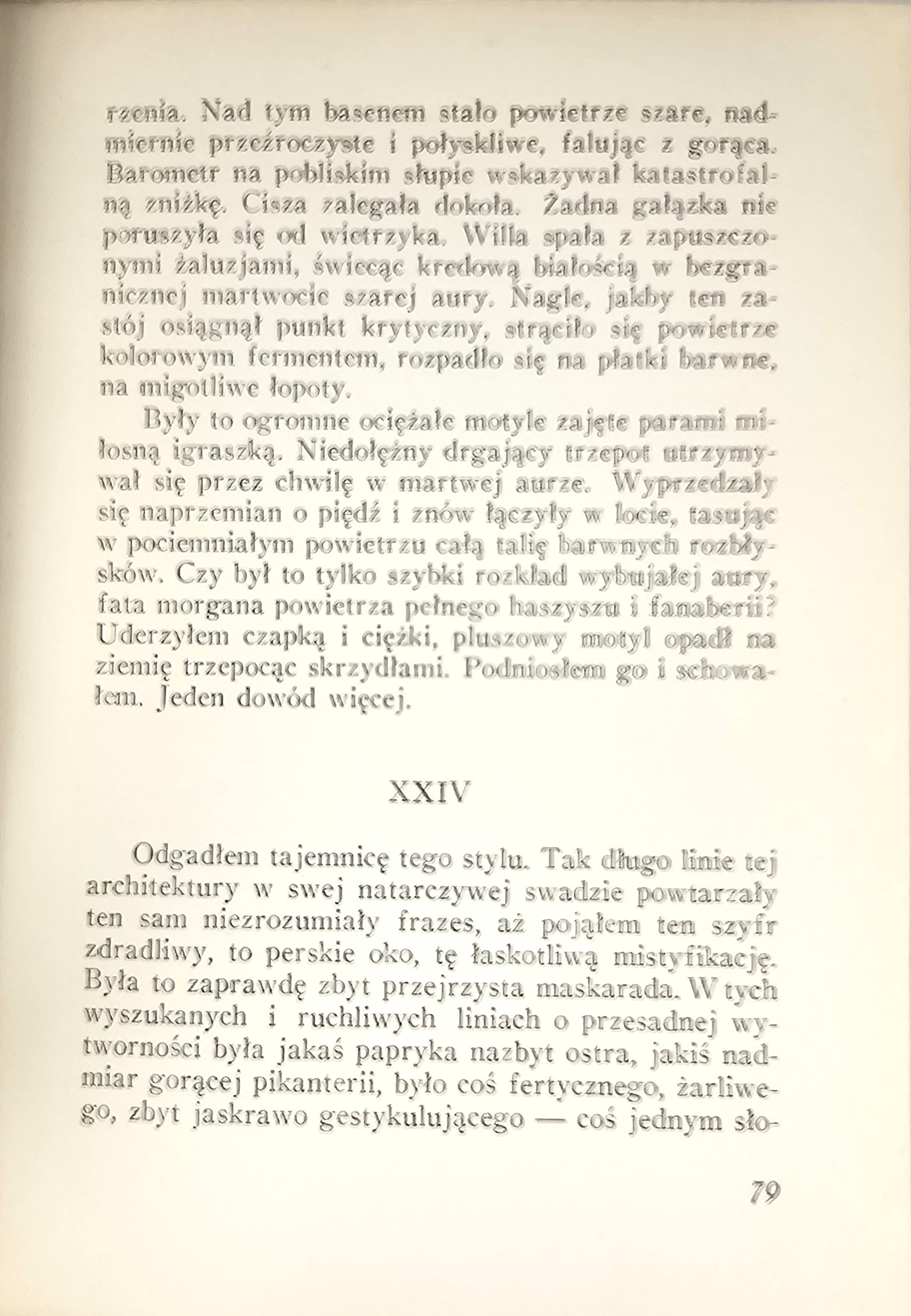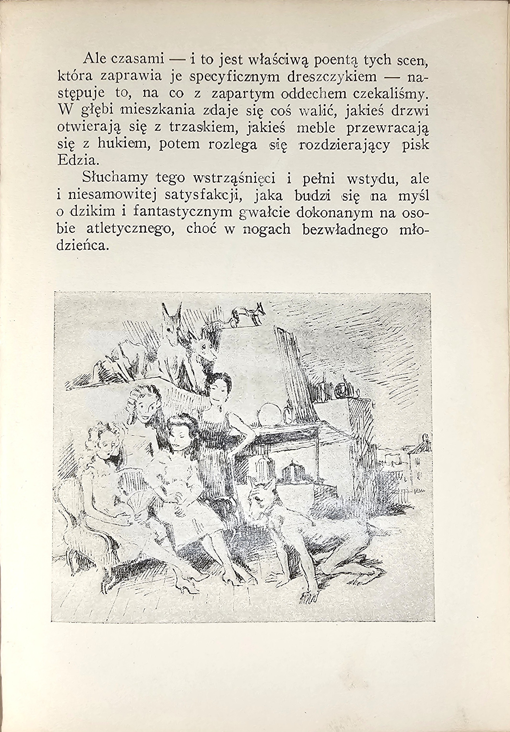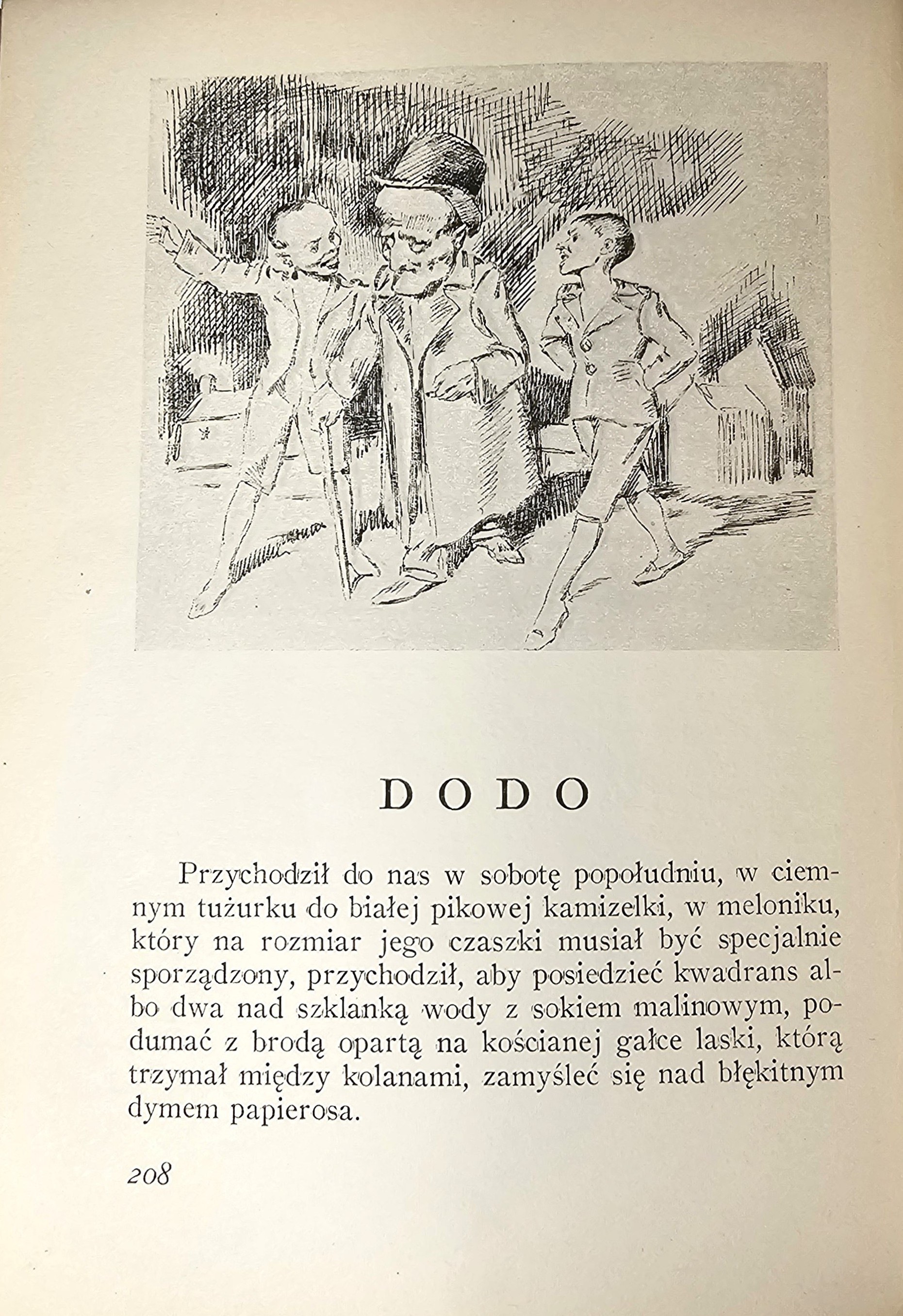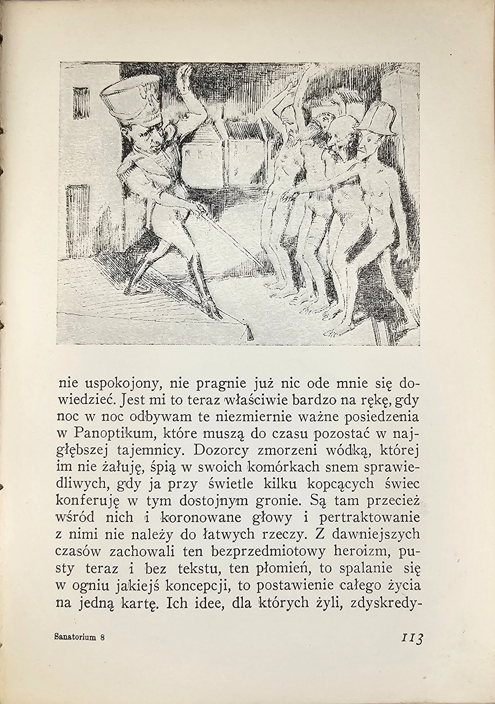 20 cm, s. 262, [2], ilustracje, opr. ppł. biblioteczna. Egzemplarz nr 620. Na str. tytuł. numer ewidencyjny, na odwrocie k. tytuł. i na ostatniej pieczęcie bibl. Karty czyste, ogólny stan dobry. tym Zbiór opowiadań, z których część powstała w latach 20-tych XX w., w tym najstarsze opowiadanie "Noc lipcowa". Tom dedykowany Józefinie Szelińskiej. Jest to jedna z najwybitniejszych książek polskiej awangardy dwudziestolecia międzywojennego. Druga po "Sklepach cynamonowych" i ostatnia książka wydana za życia autora. W tekście 33 reprodukcje rysunków autora. 1 wydanie.
