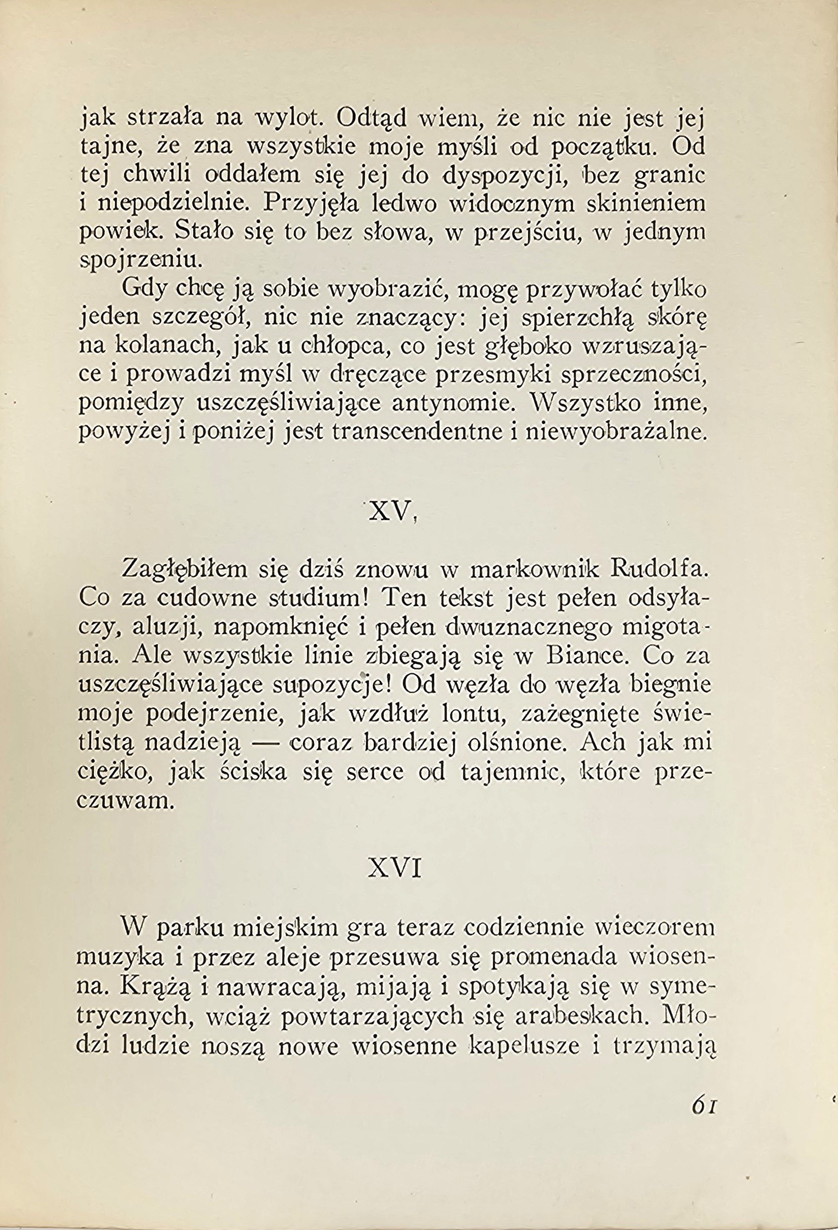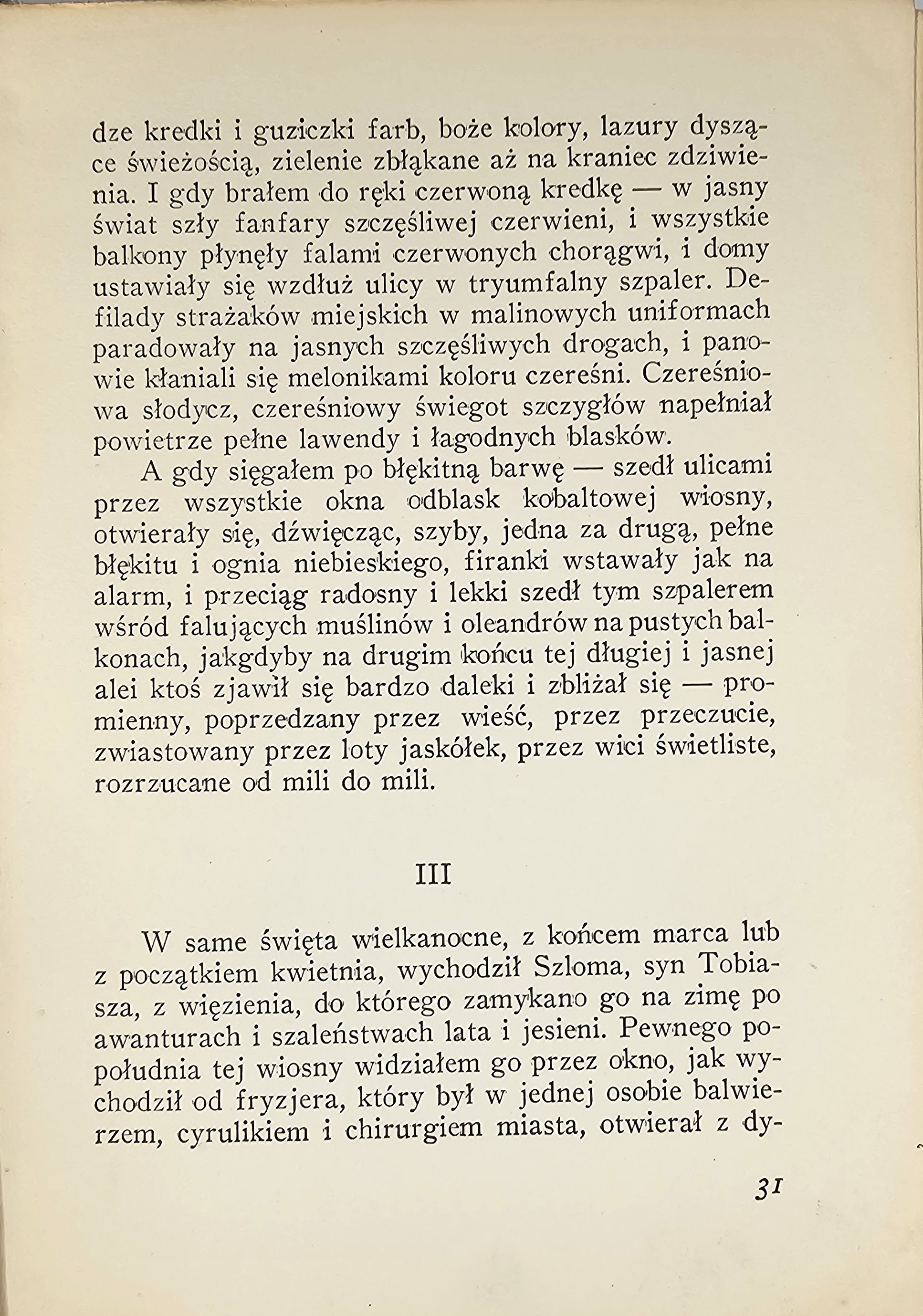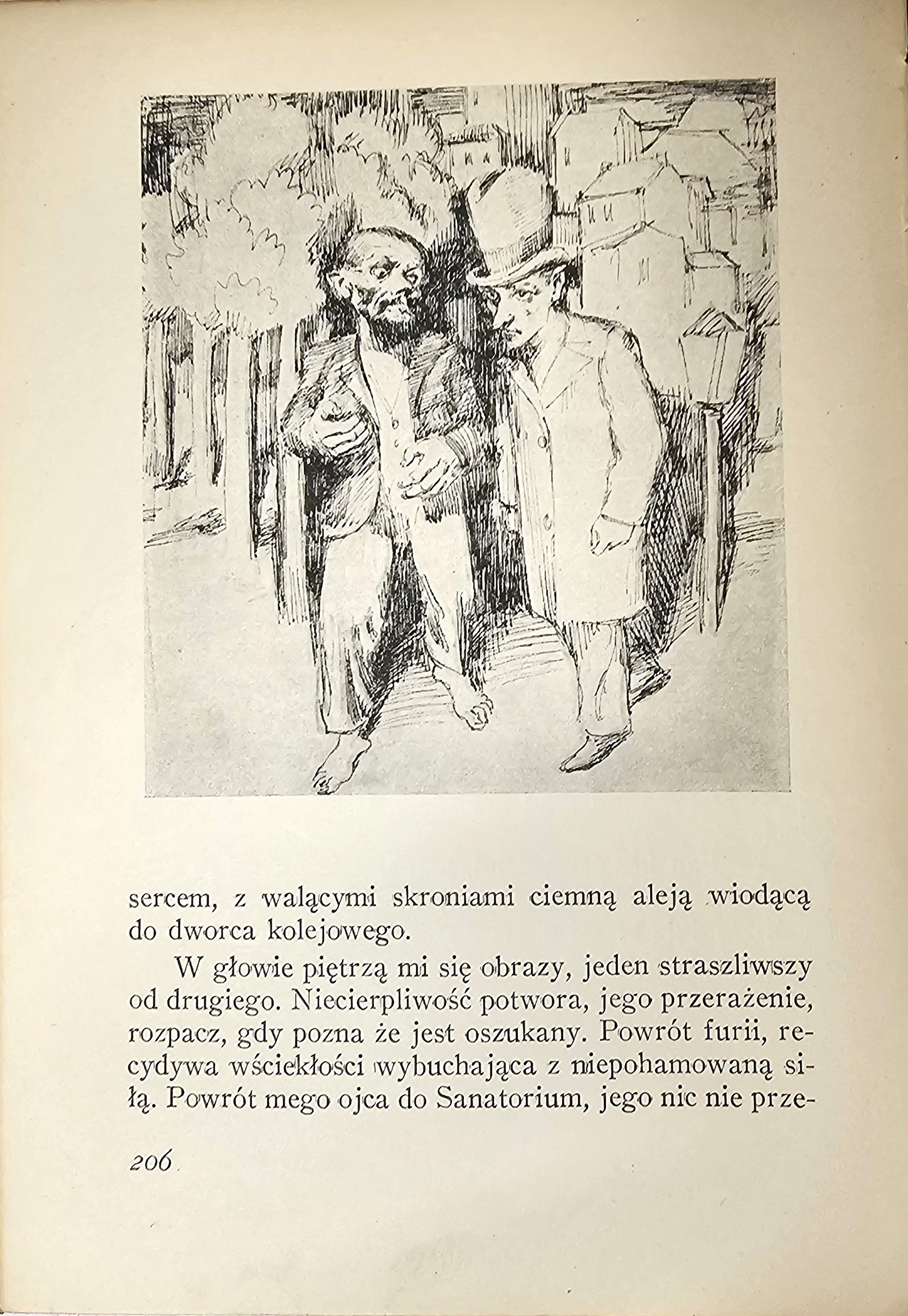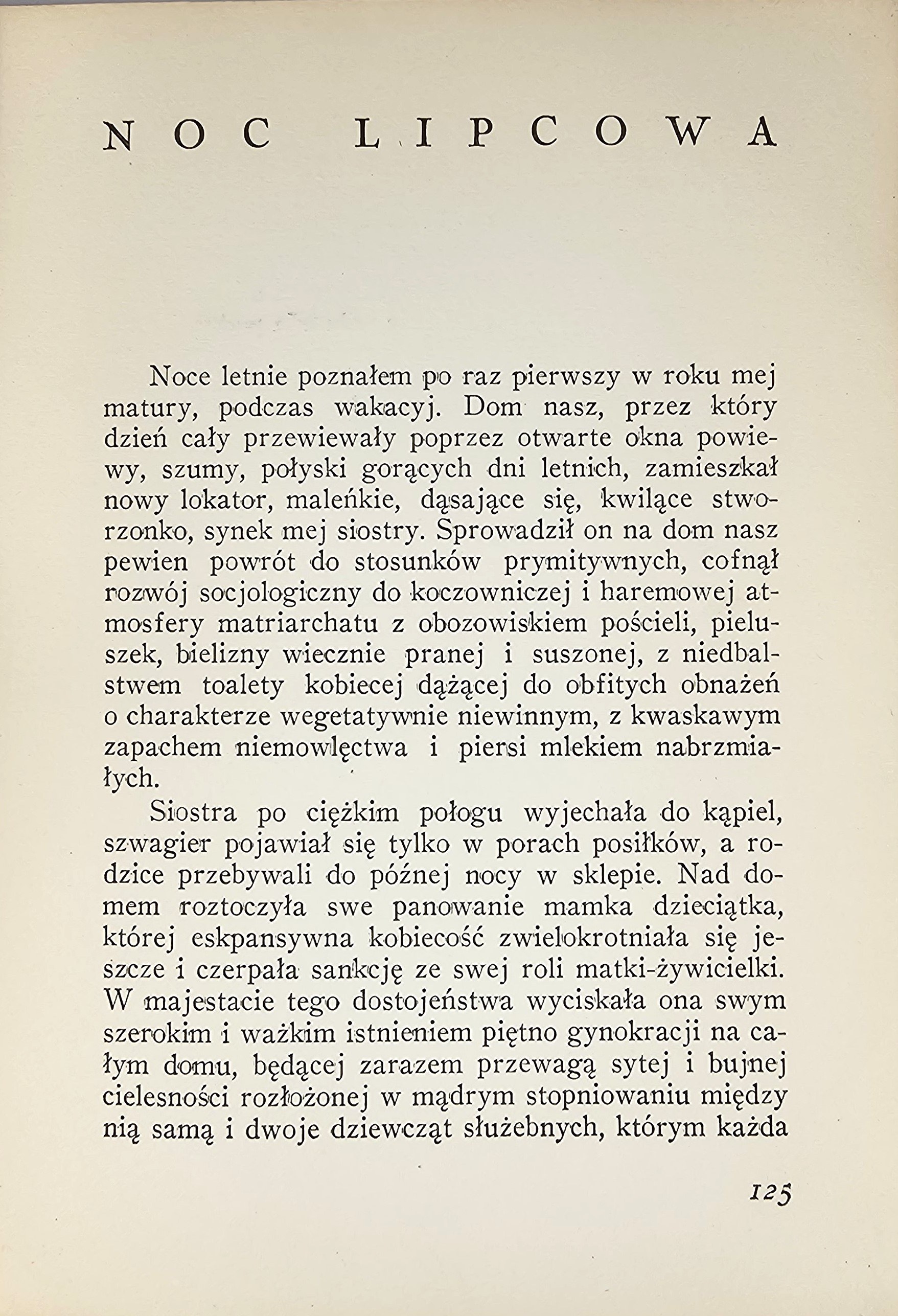20 cm, s. 262, [2], ilustracje, opr. ppł. biblioteczna. Egzemplarz nr 620. Na str. tytuł. numer ewidencyjny, na odwrocie k. tytuł. i na ostatniej pieczęcie bibl. Karty czyste, ogólny stan dobry. tym Zbiór opowiadań, z których część powstała w latach 20-tych XX w., w tym najstarsze opowiadanie "Noc lipcowa". Tom dedykowany Józefinie Szelińskiej. Jest to jedna z najwybitniejszych książek polskiej awangardy dwudziestolecia międzywojennego. Druga po "Sklepach cynamonowych" i ostatnia książka wydana za życia autora. W tekście 33 reprodukcje rysunków autora. 1 wydanie.