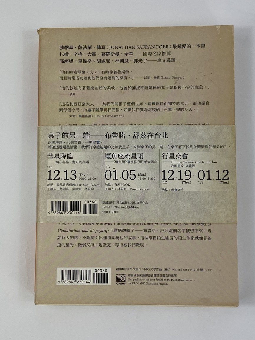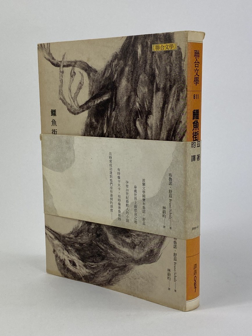Schulz Bruno, Ulica krokodyli, nakł. Unitas Publishing Co, Tajpej 2012, wymiary 15 x 21 cm. Przekład na język chiński Wei-Yun Lin-Górecka. Okładka miękka z wydawniczą obwolutą oraz banderolą. Przetarcia, niewielkie naderwania obwoluty i banderoli.