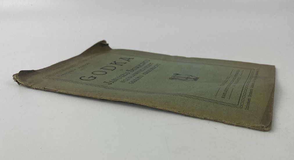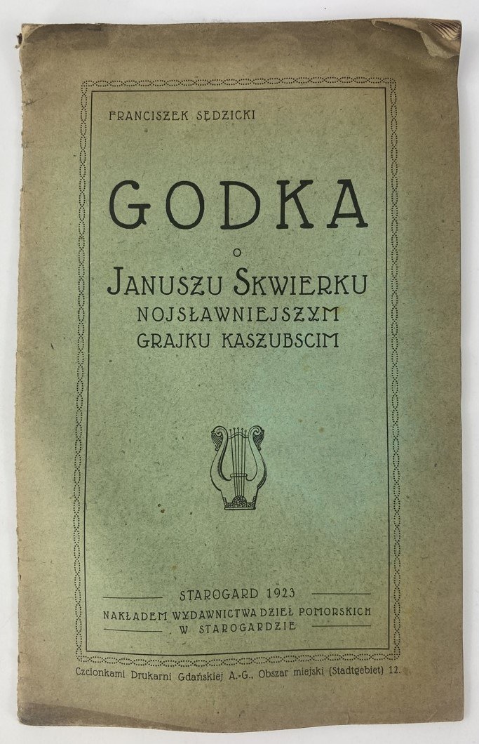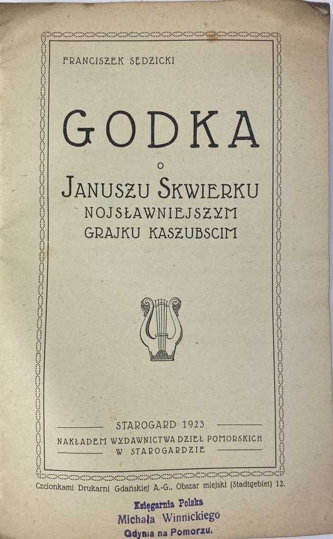 Sędzicki Franciszek, Godka o Januszu Skwierku najsławniejszym grajku kaszubscim, nakł. Wydawnictwa Dzieł Pomorskich, Starogard 1923, s. 36, wymiary 14 x 22 cm. Nieakt. pieczęć własności. Okładka broszurowa, wydawnicza. Zagięty narożnik. Niewielkie zabrudzenia, zagięcia okładki.