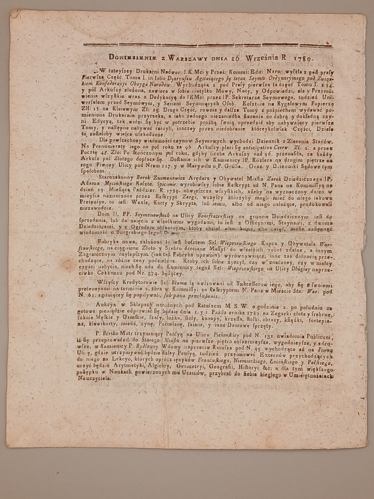 GAZETA WARSZAWSKA NR. 78, we srzodę [środę] dnia 30. września roku 1789. [DRUKARNIA NADWORNA], 21,5x17,5 cm, s.4;4 (Suplement), mało przycięty egzemplarz.