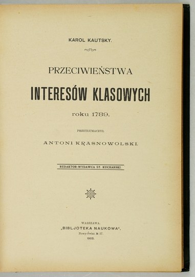 [oraz] KAUTSKY Karol – Przeciwieństwa interesów klasowych roku 1789. Przetłumaczył Antoni Krasnowolski. 8, s. 102, [2]