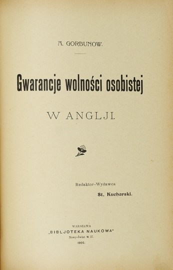 [oraz] GORBUNOW A. – Gwarancje wolności osobistej w Anglji. 8, s. 55. razem opr. psk. z epoki.