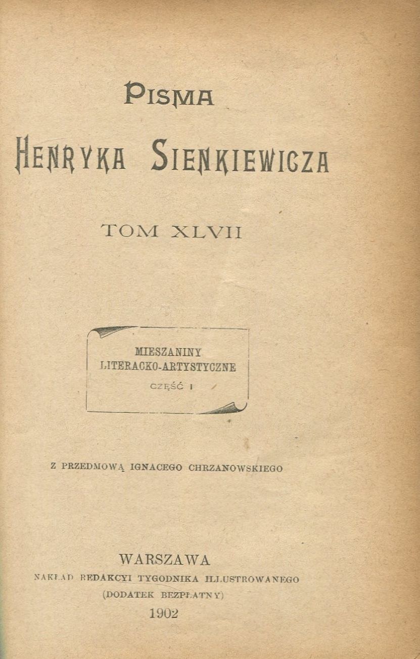 Zbiór wszystkich pism krytycznych i publicystycznych Henryka Sienkiewicza, rozproszonych dotąd po czasopismach. Wydano w ramach serii Pisma Henryka Sienkiewicza (tom 47-48). Przedmowę napisał Ignacy Chrzanowski.