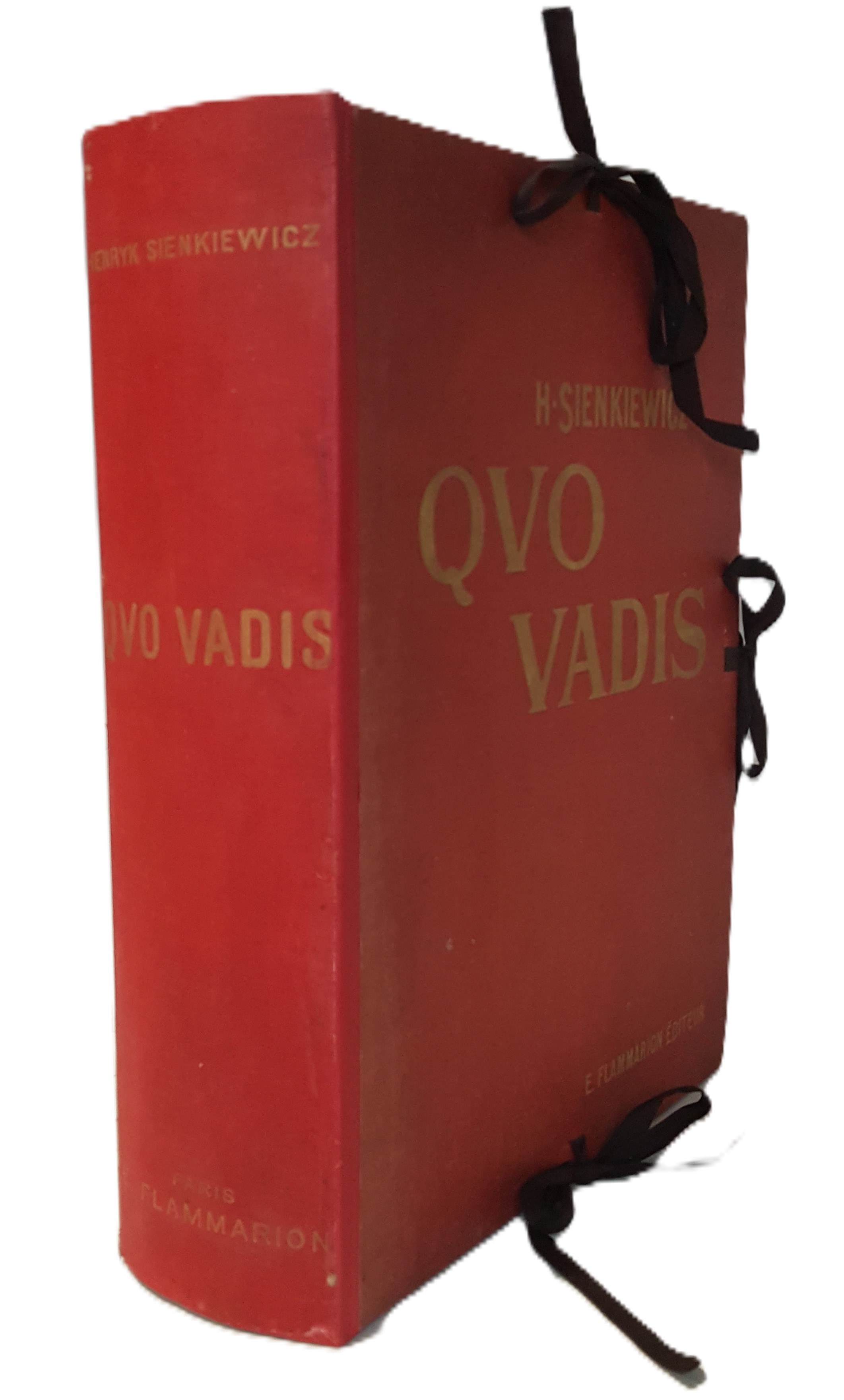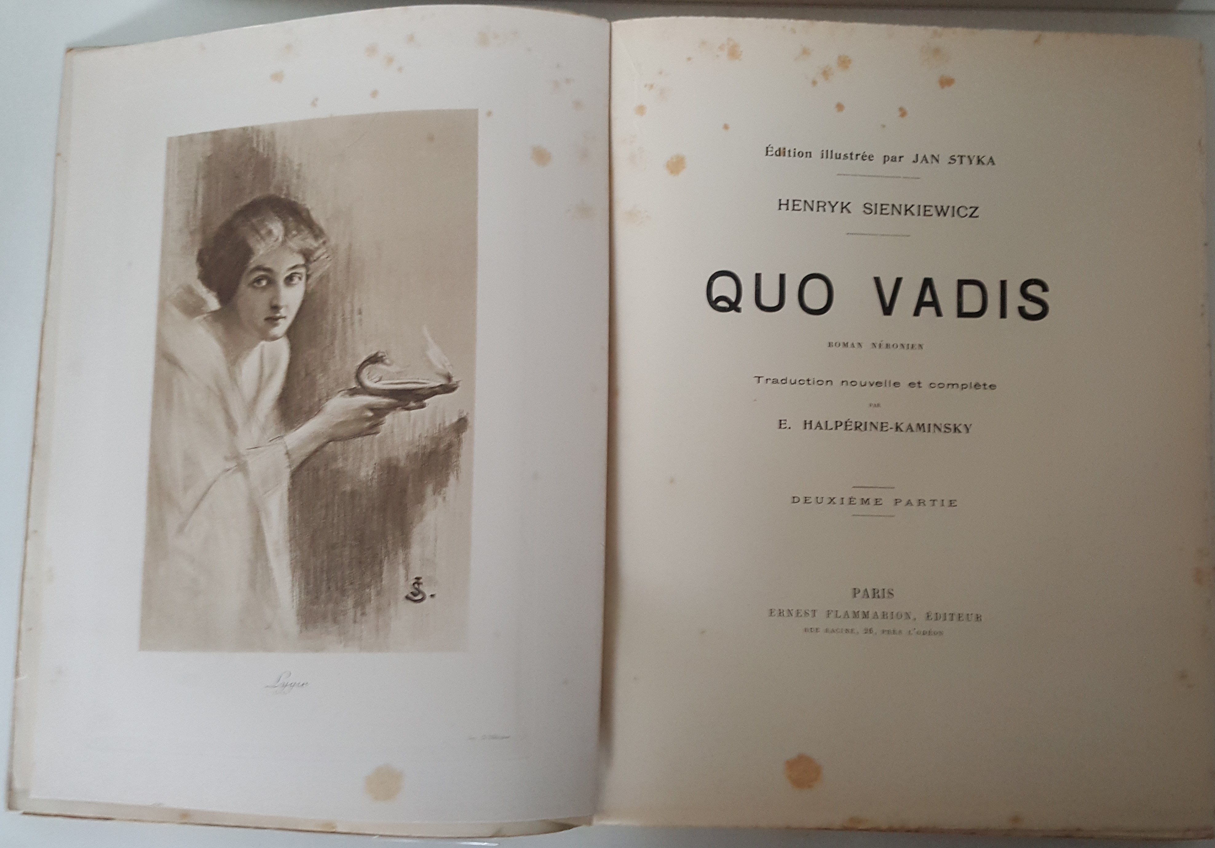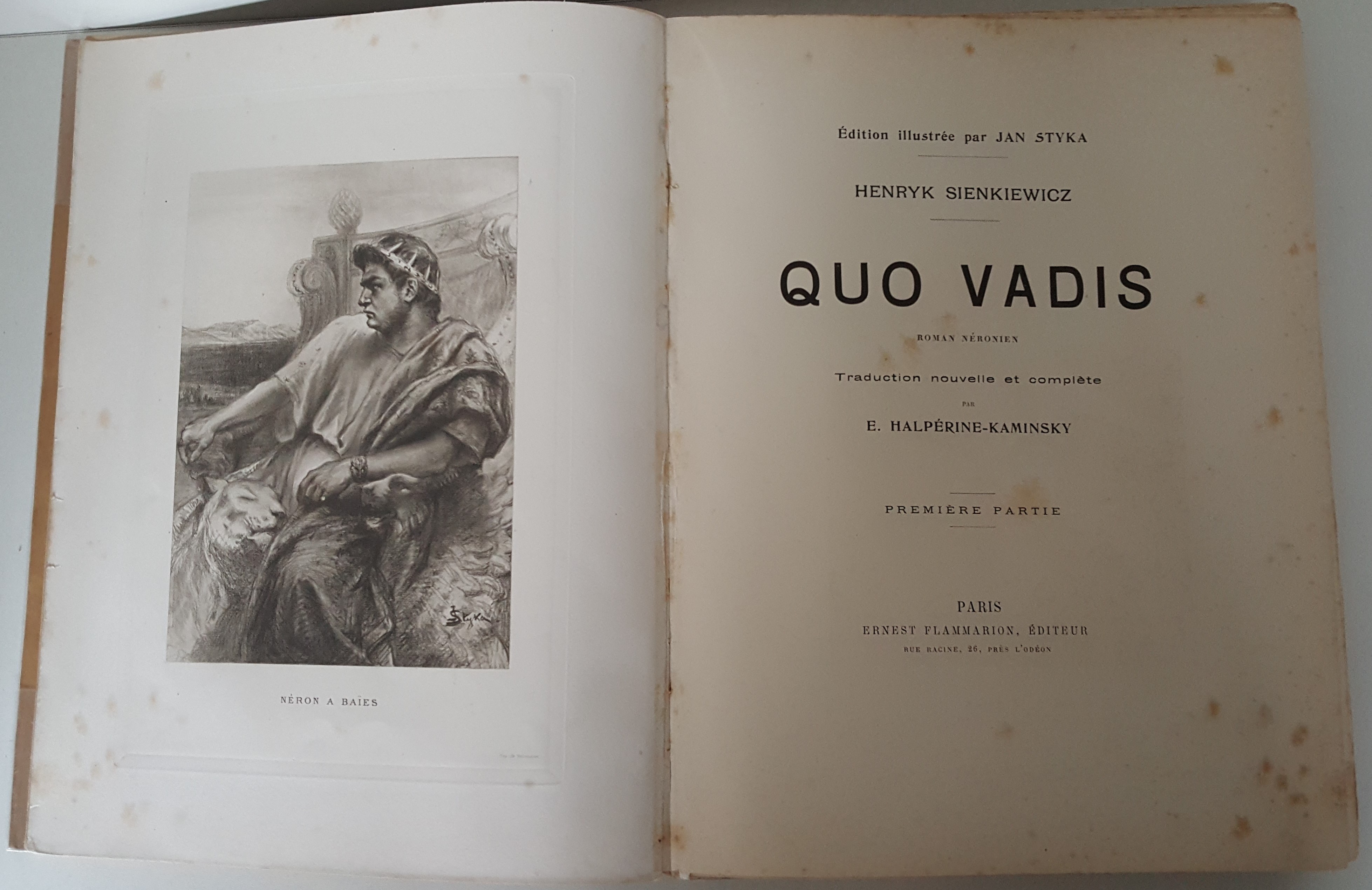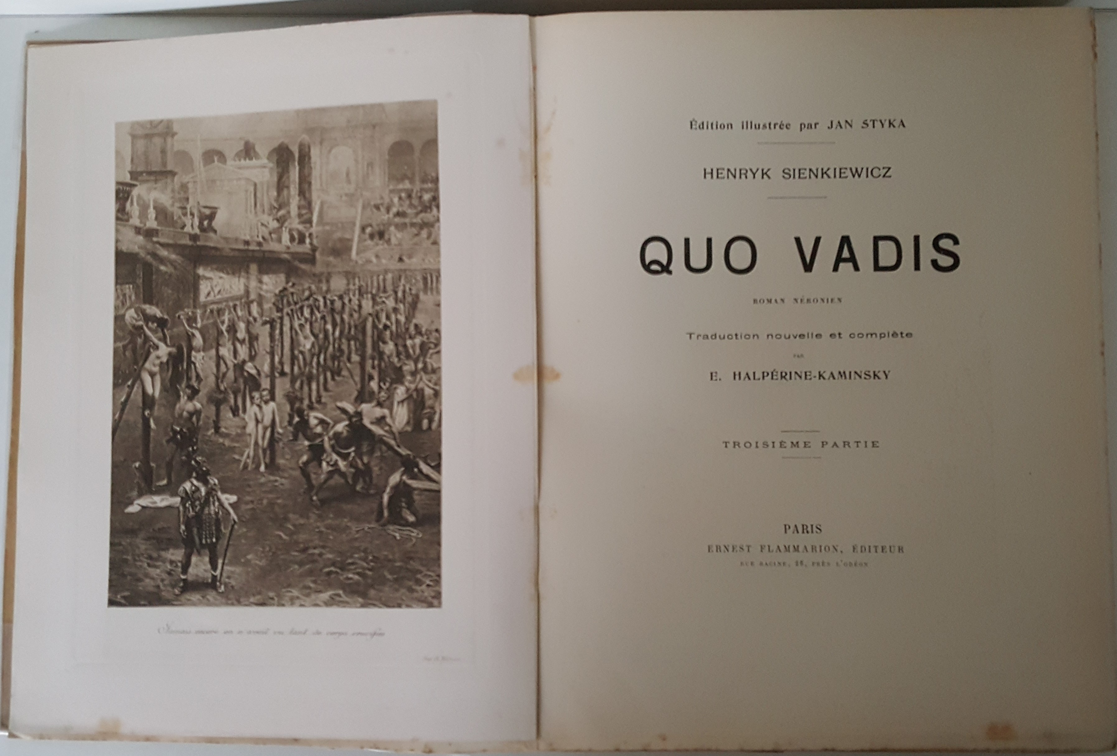Quo Vadis. Roman Néronien. Traduction nouvelle et complete par E. Halperine-Kaminsky. Édition illustrée par Jan Styka. Paris b. r. (ca. 1900). E. Flammarion, Éditeur. Ryciny na osobnych tablicach (w tym składane) oraz drzeworyty w tekście. Wymiary teki 35x30 cm, stron 291; 235; 326. Wydanie w zeszytach - całość w płóciennej tece po renowacji. Ślady użytkowania (przybrudzenia teki), foxing-odbarwienia papieru, nieliczne przybrudzenia.